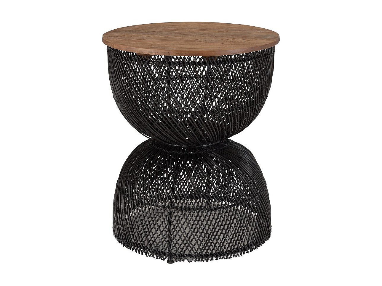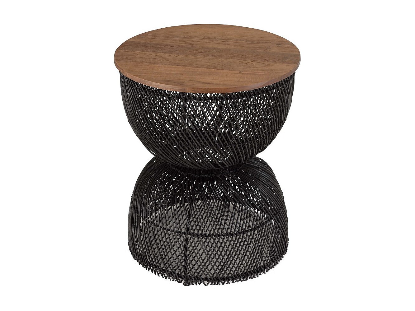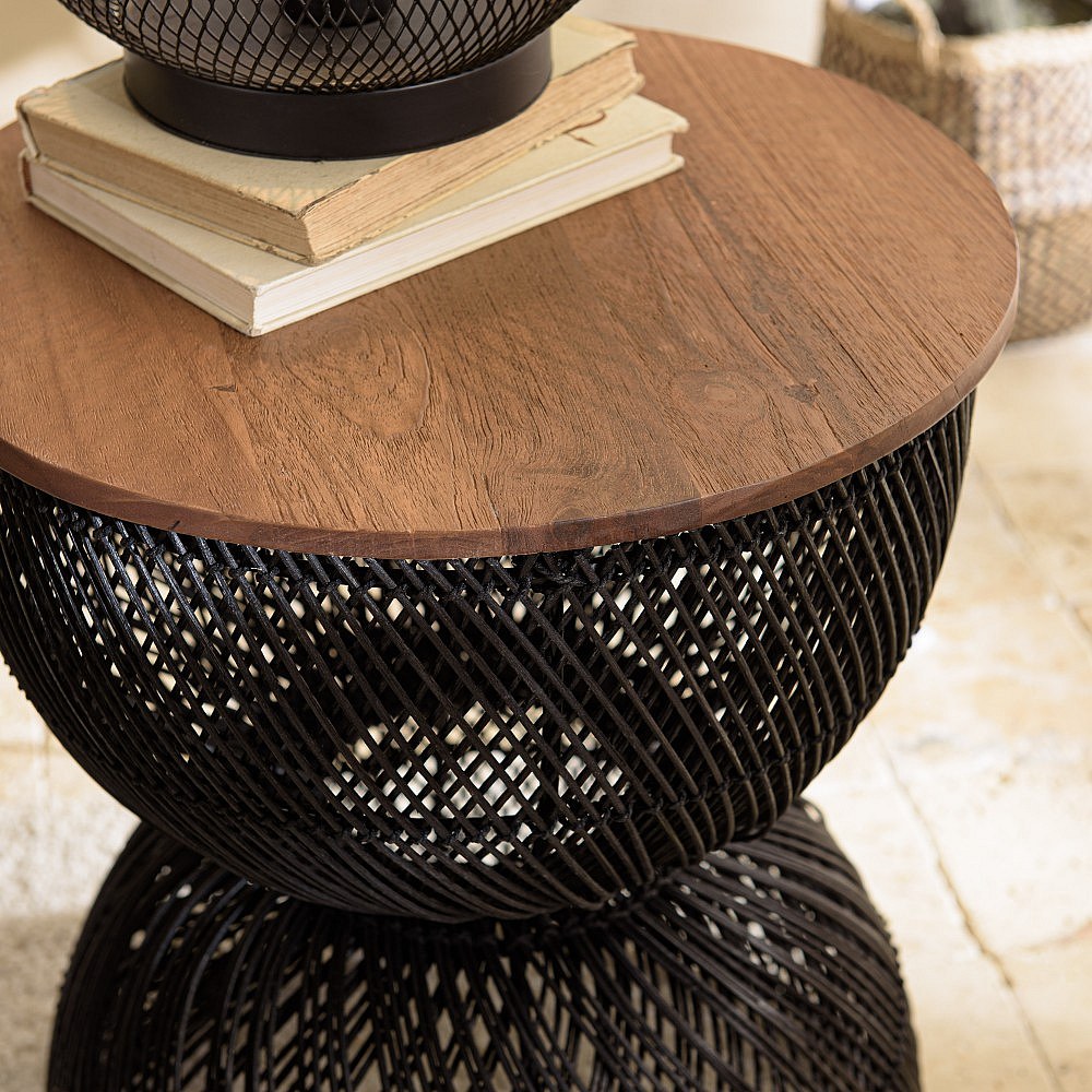 SIXTINE - Table d'appoint en rotin noir plateau en bois de teck recyclé