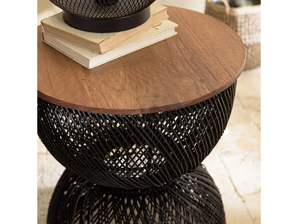 SIXTINE - Table d'appoint en rotin noir plateau bois de teck recyclé