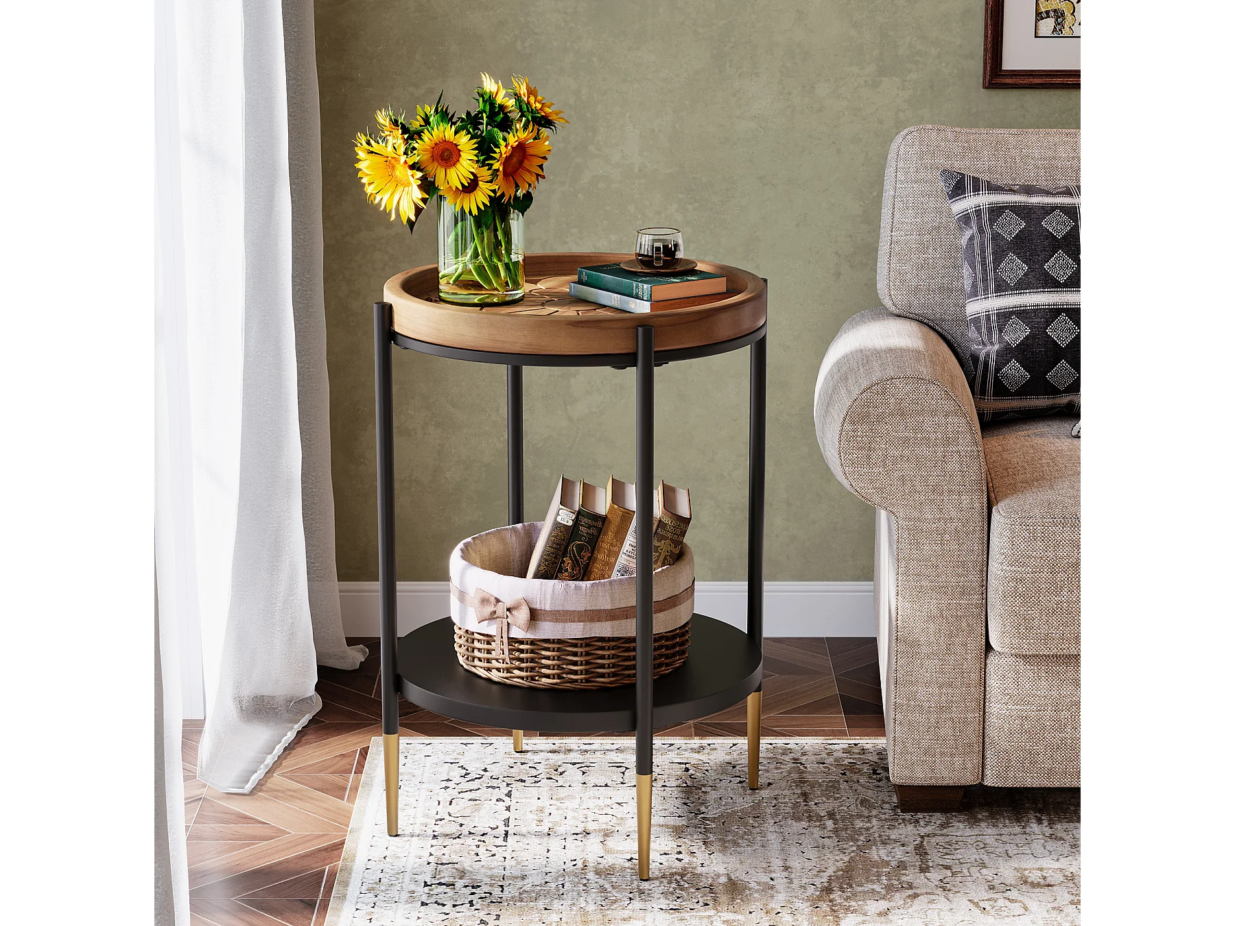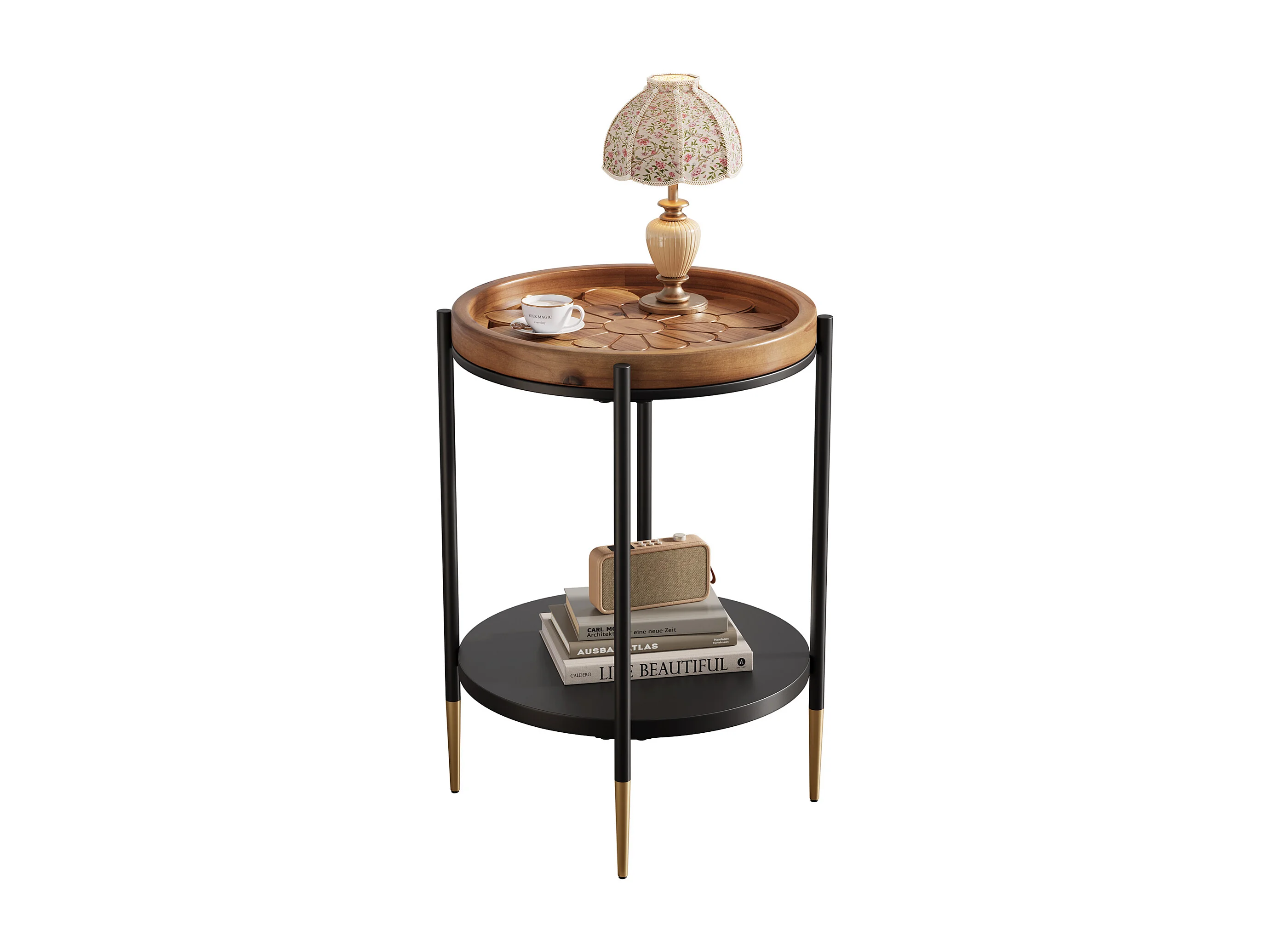 Table d'appoint ronde, table de chevet à 2 niveaux en bois massif et métal, style industriel pour petits espaces
