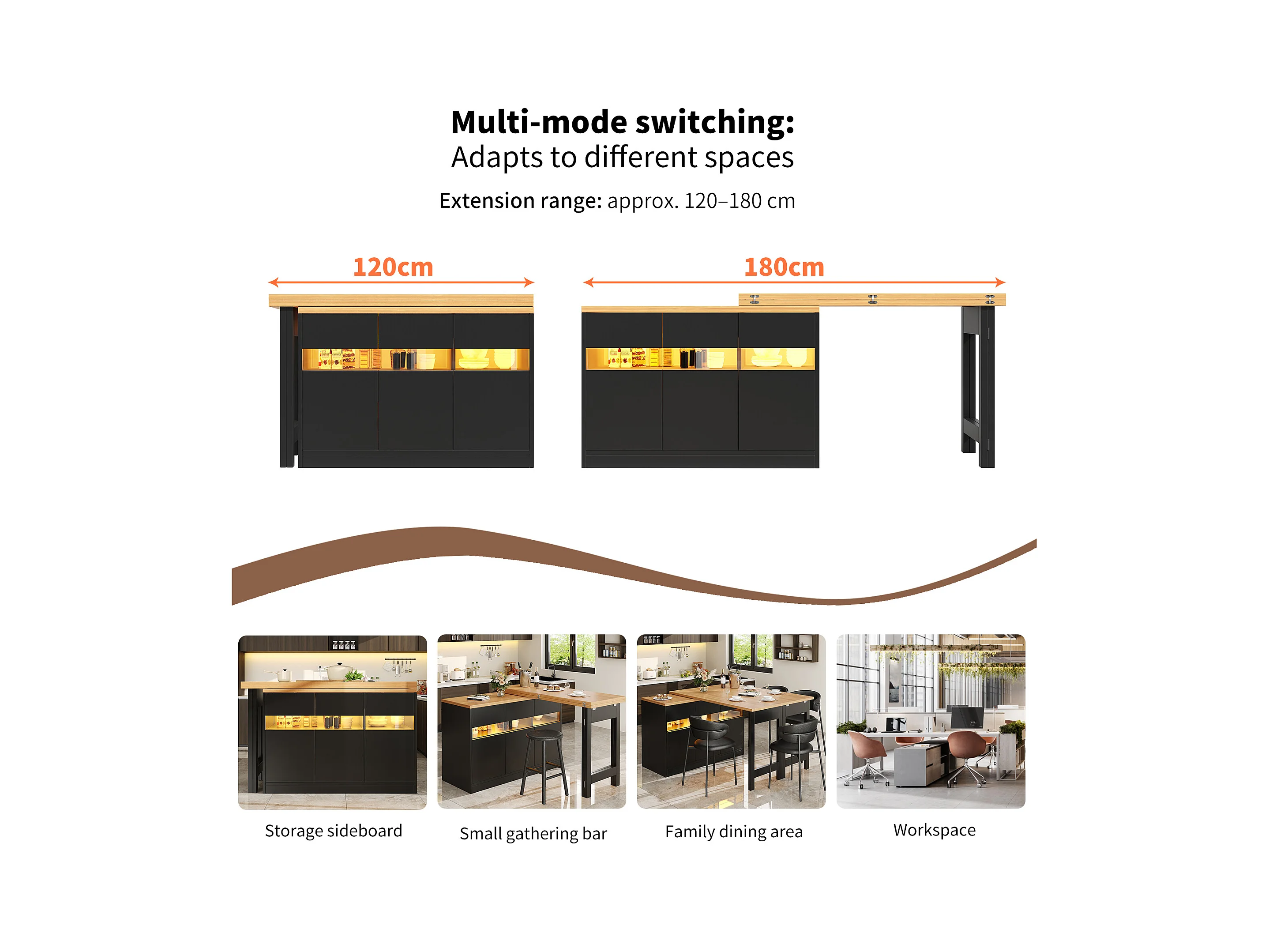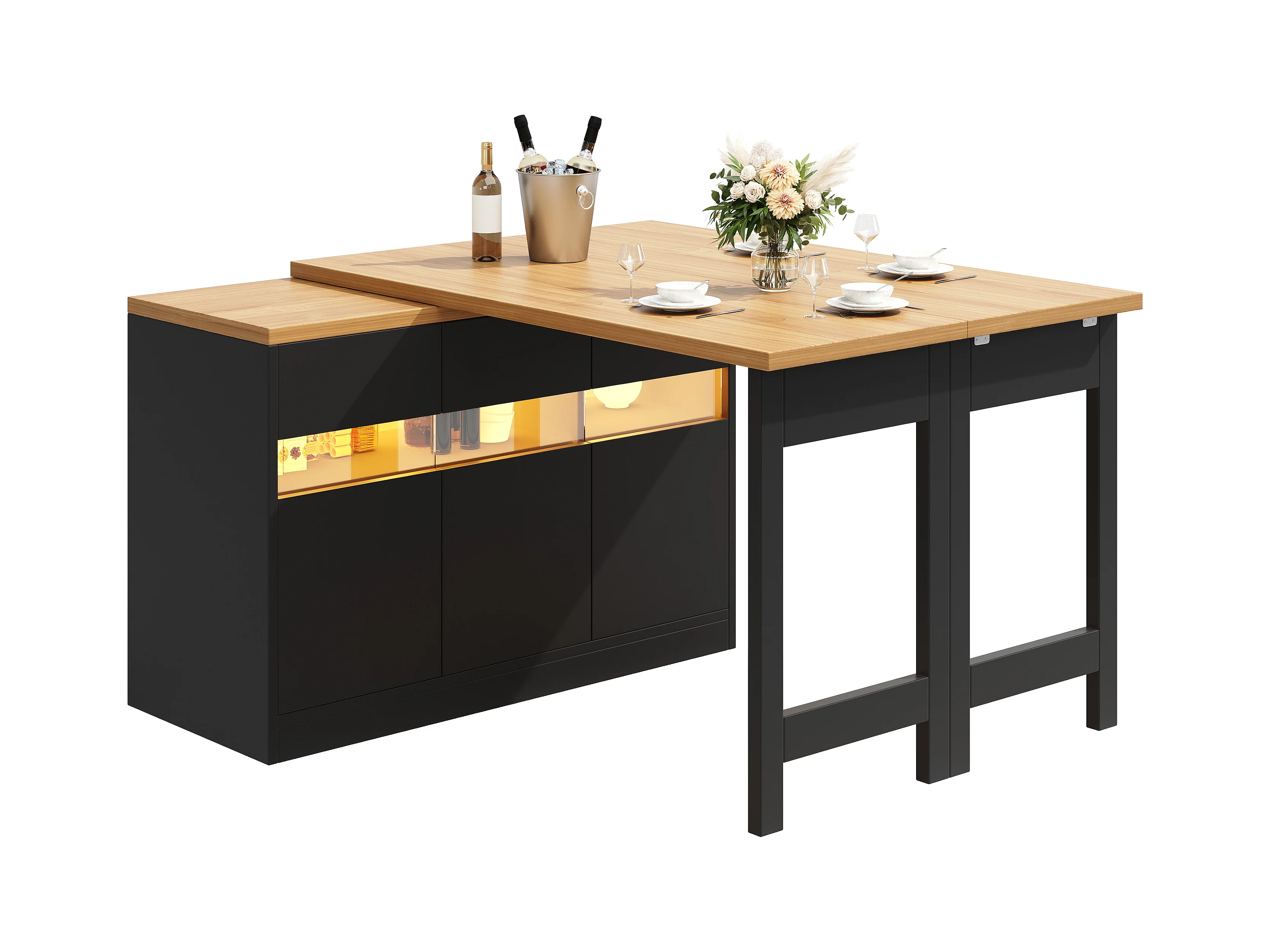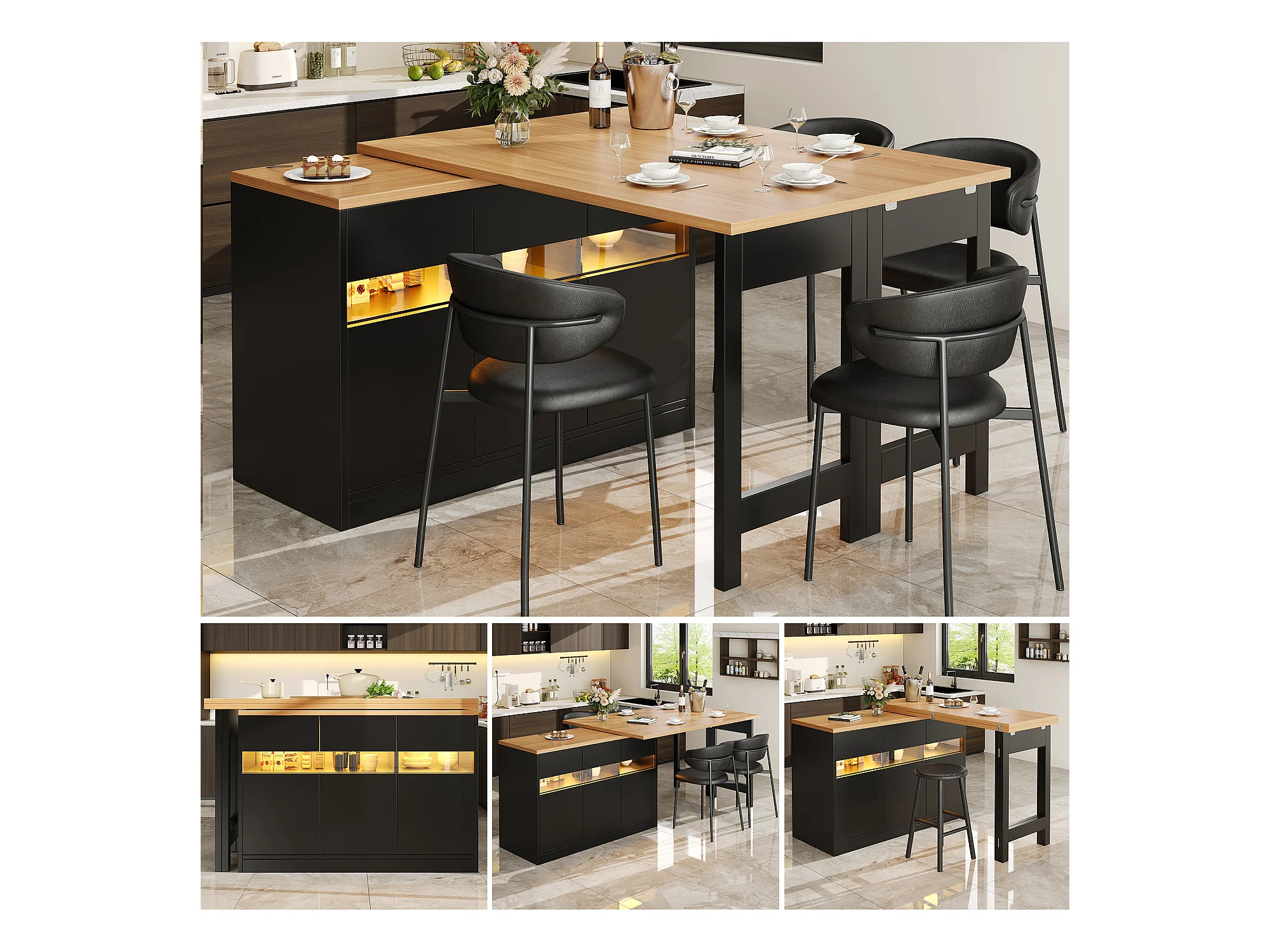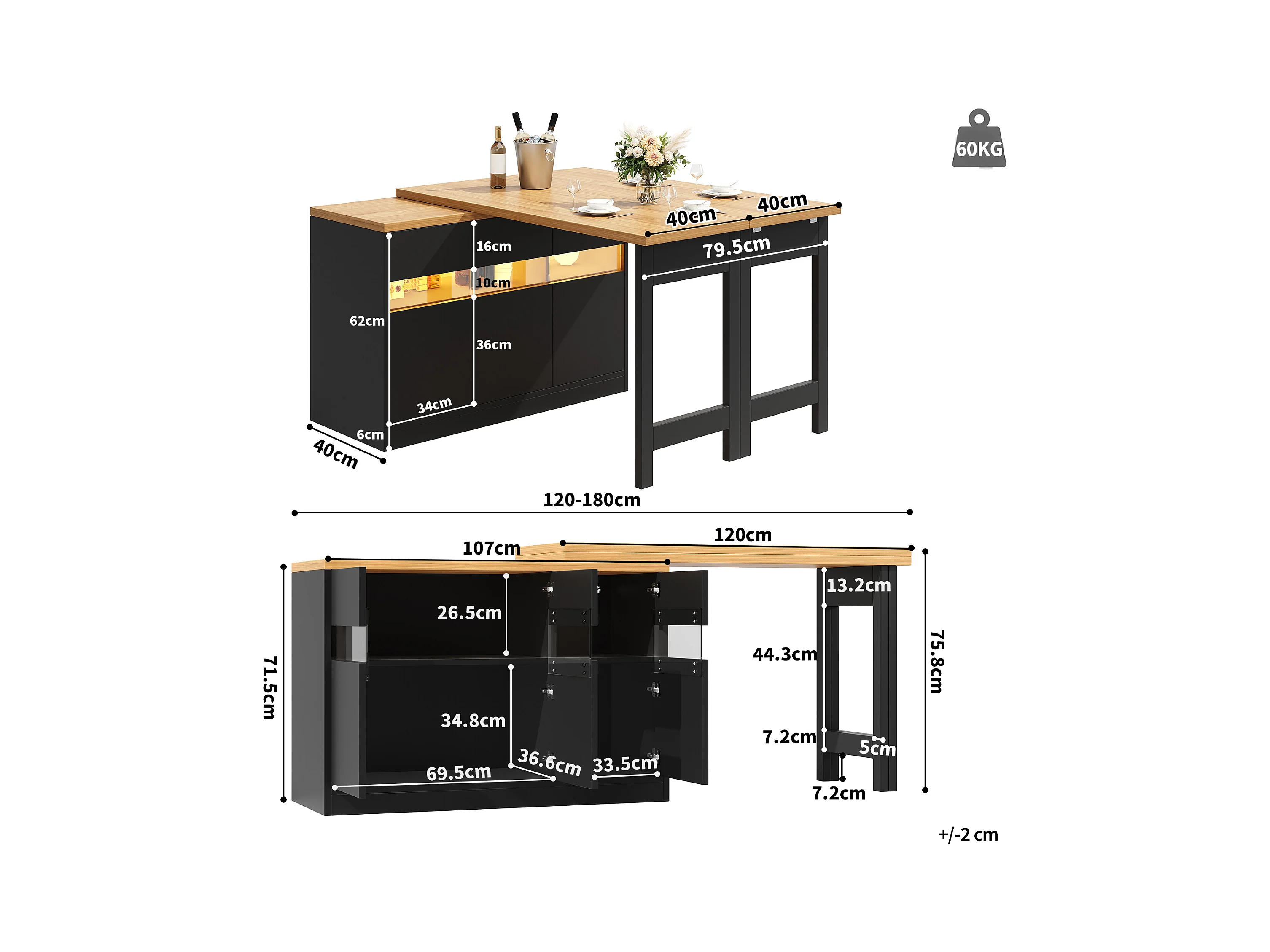 Table de bar extensible - 120/180 x 75.8 cm - avec Leds + 3 portes - rotation à 360° - MDF - noir