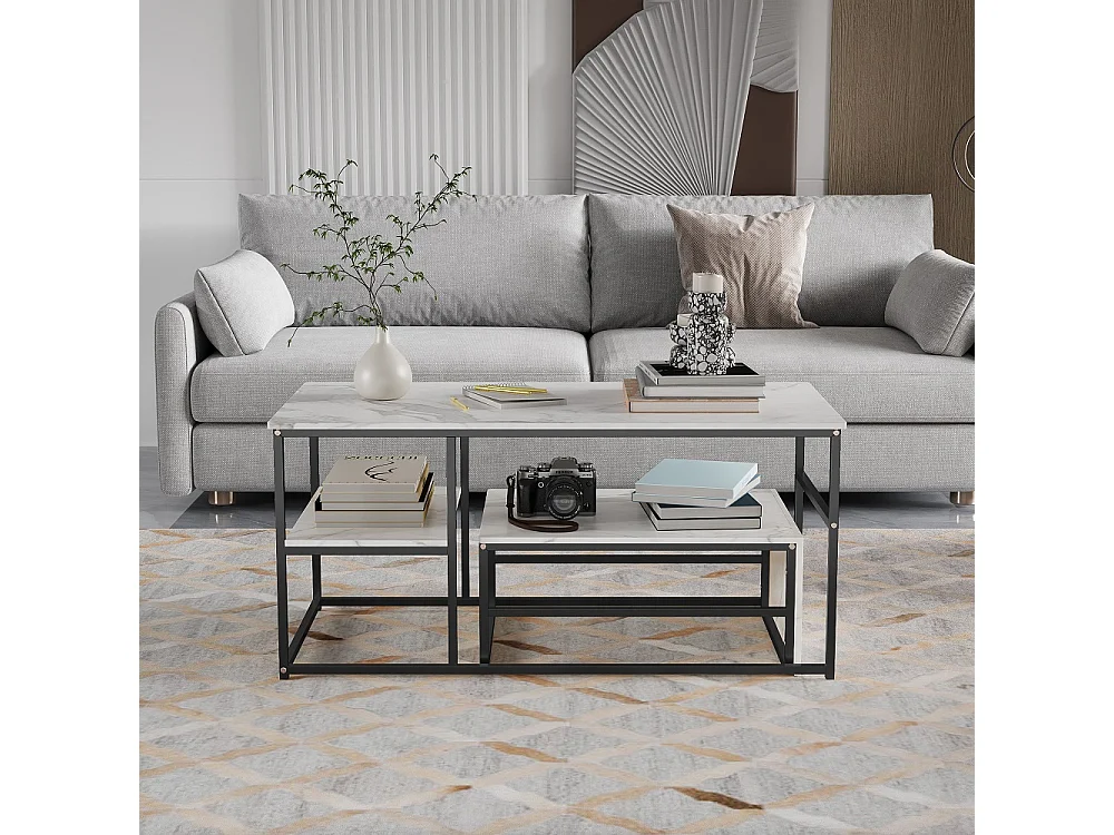 Table de canapé 2-en-1, tables à café empilables modernes - avec le haut du regard en marbre et le cadre en métal noir