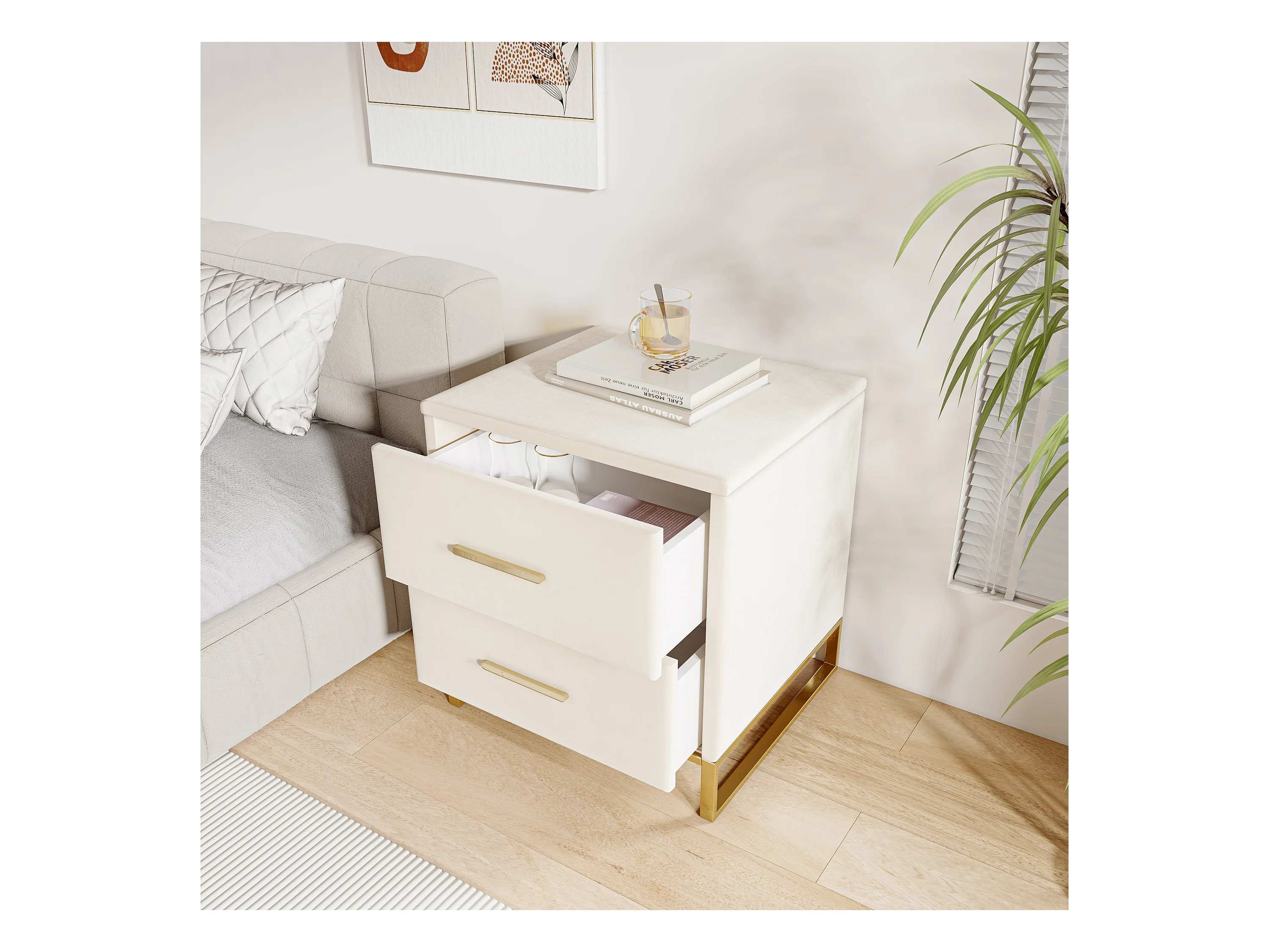 Table de chevet 2 tiroirs en velours beige avec base en métal doré – 40 x 40 x 50 cm