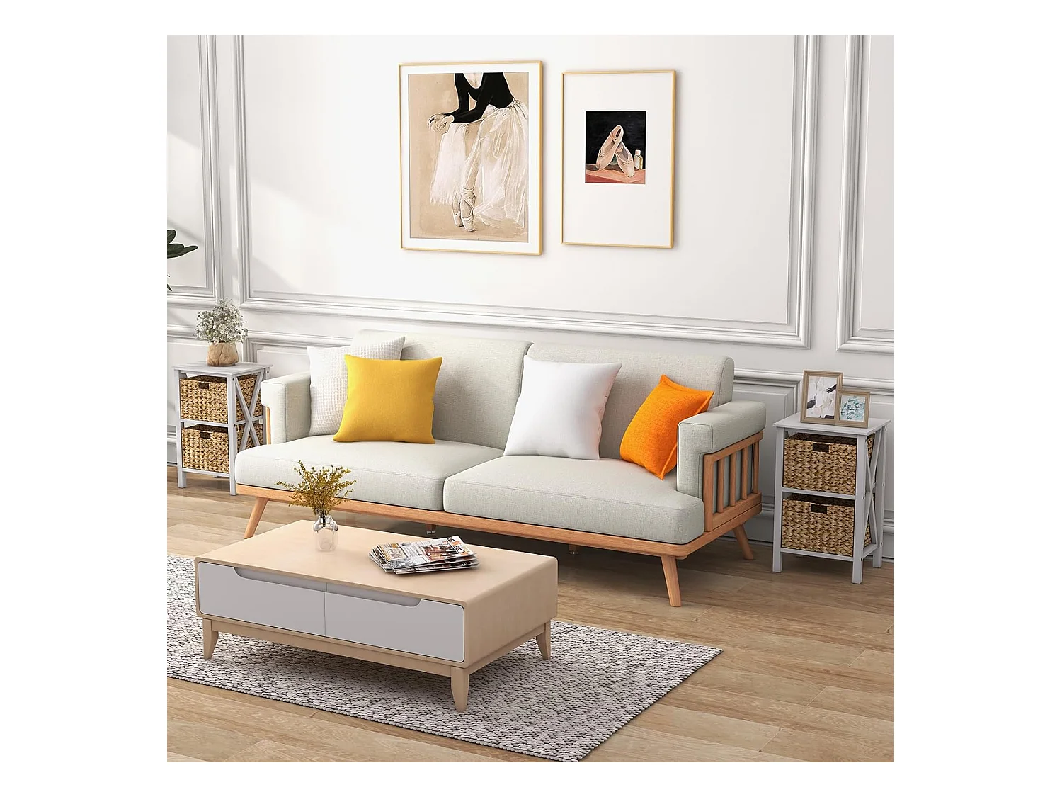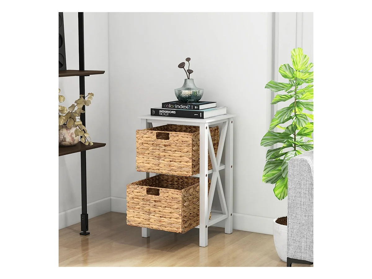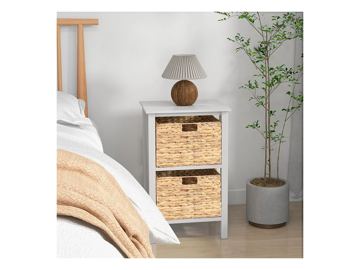 Commode 2 Tiroirs, Table de Chevet avec Pieds en Bois Massif, Poignée Noir Design, Tiroir en Rotin Bohème, Petite Commode Scandinave, Blanc(2 Tiroirs)