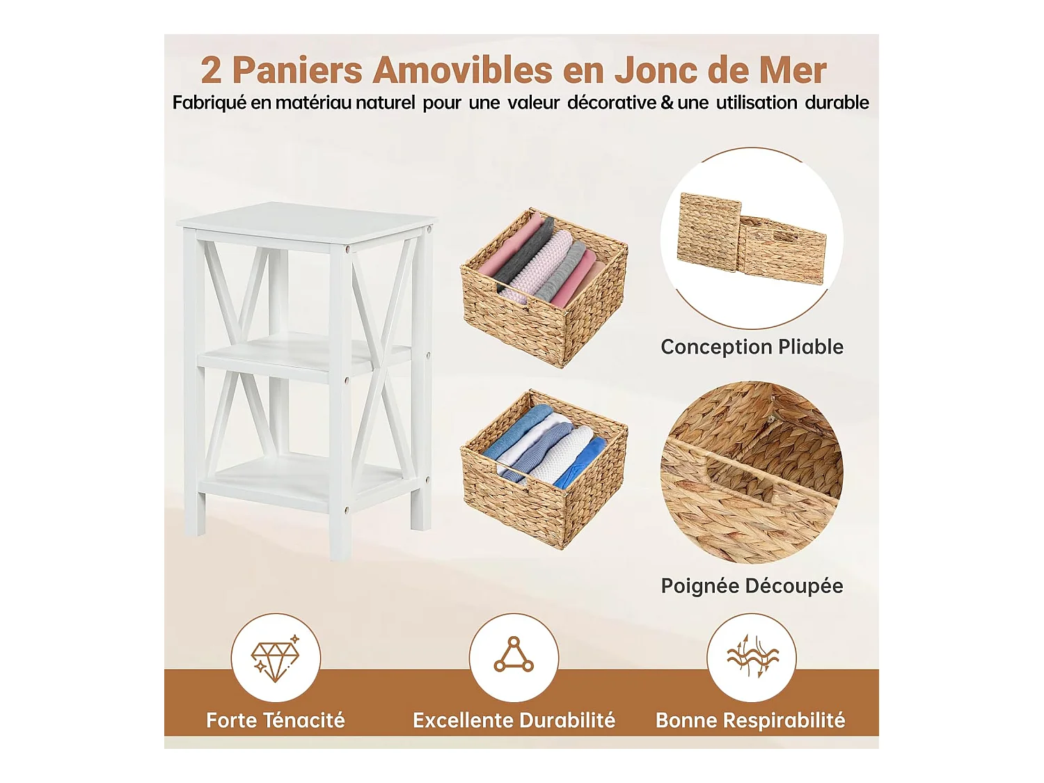 Table de Chevet 3 Niveaux (Lot de 2), Table de Nuit avec 2 Paniers en Herbe Marine, Design X, Table d'Appoint avec Pieds en Bois d'Acacia pour Chambre, Salon, 36 x 30 x 57 cm