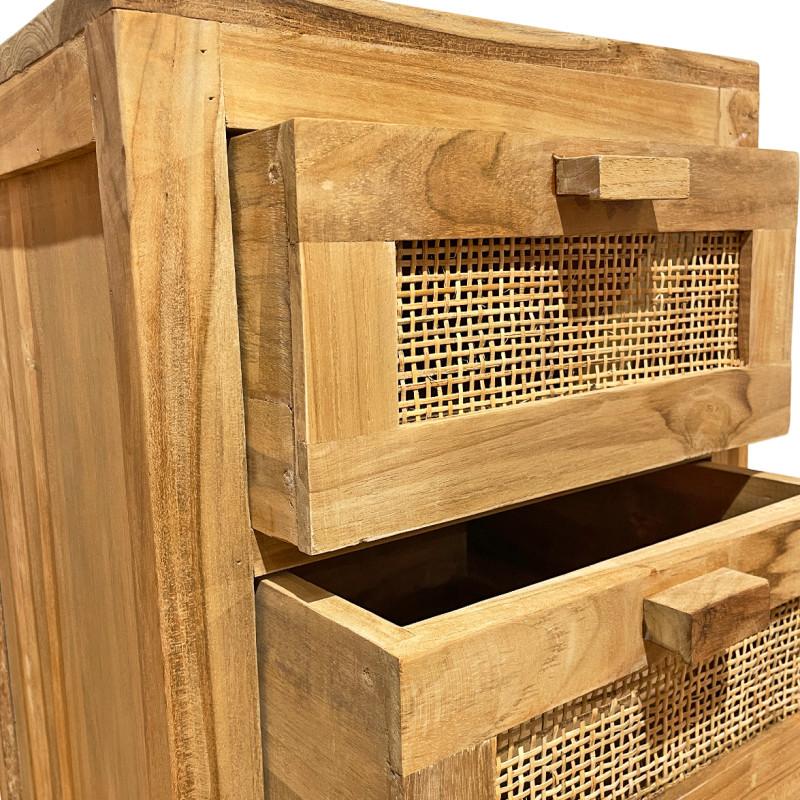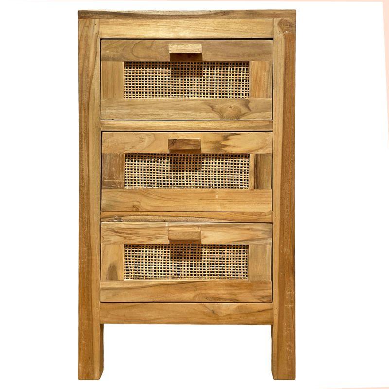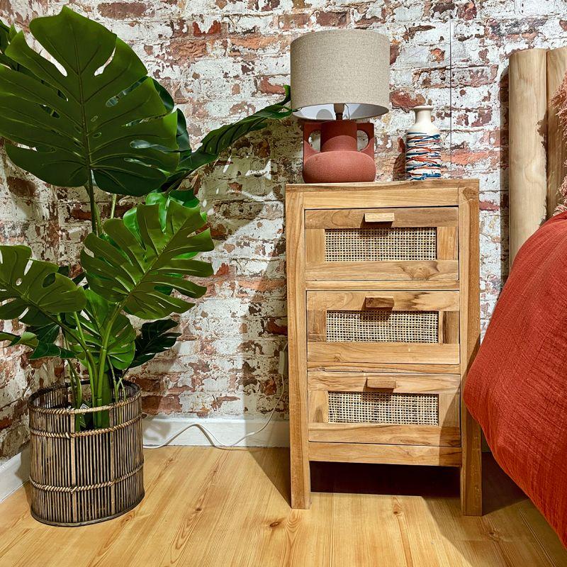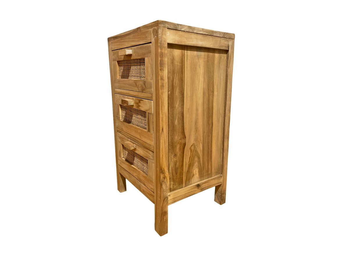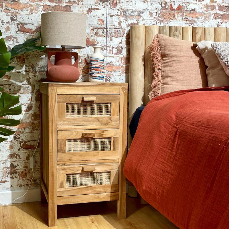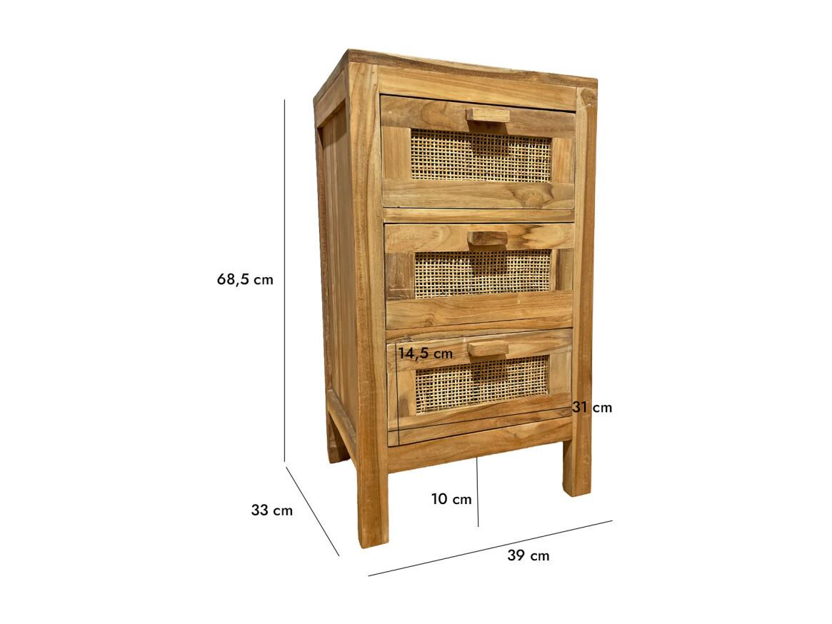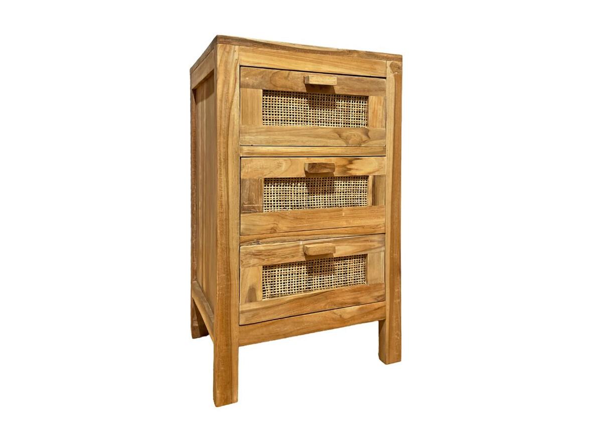 Table de chevet 3 tiroirs en teck massif et cannage rotin – CAMILO