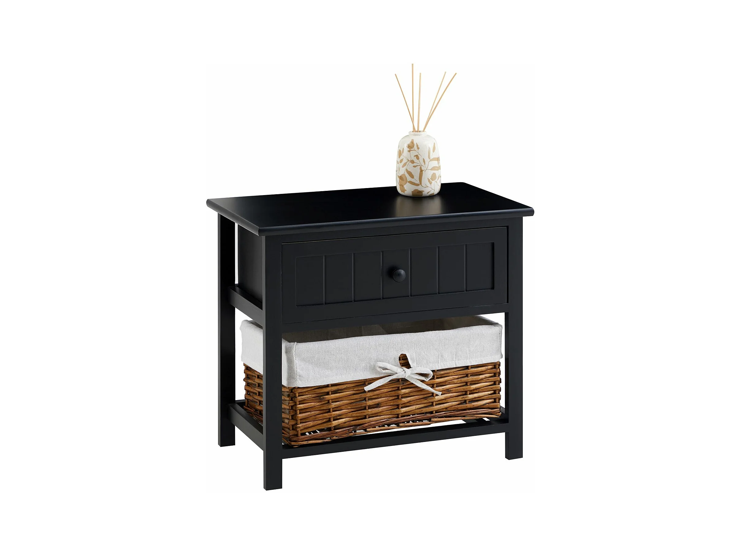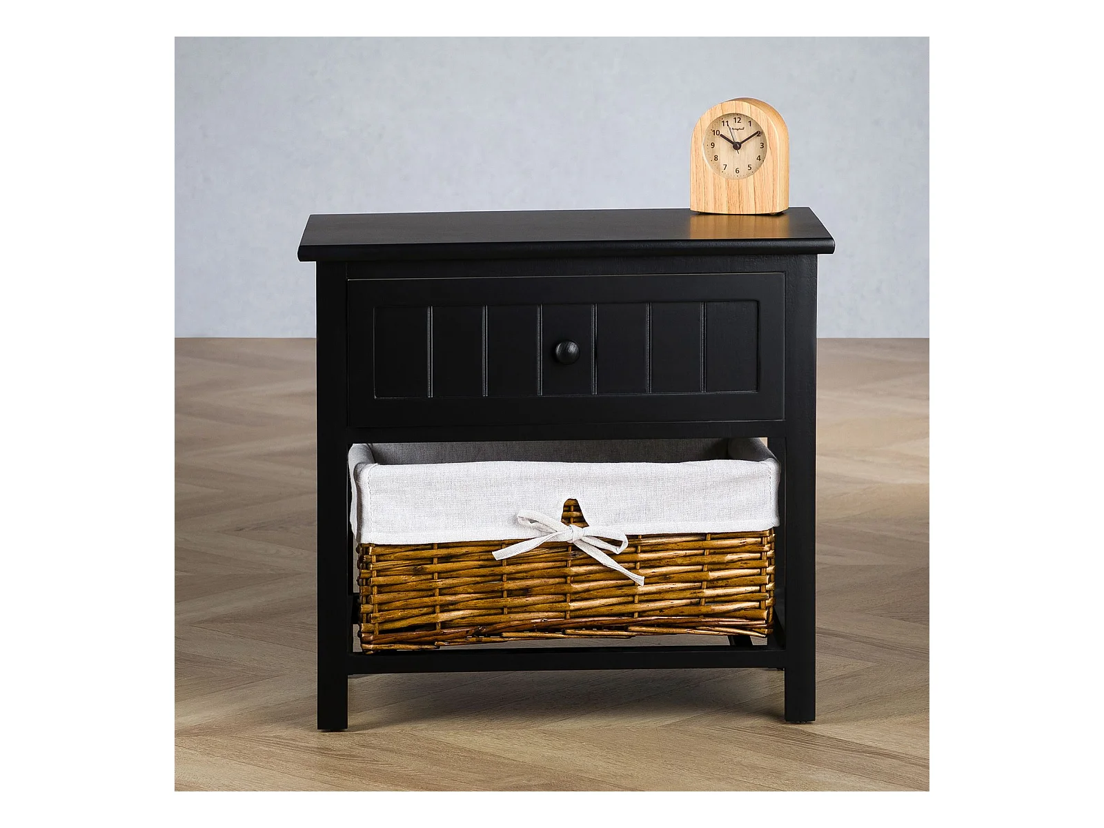 Table de chevet AKURE table de nuit en bois lasuré noir avec 1 tiroir et 1 panier en osier et insert en tissu blanc