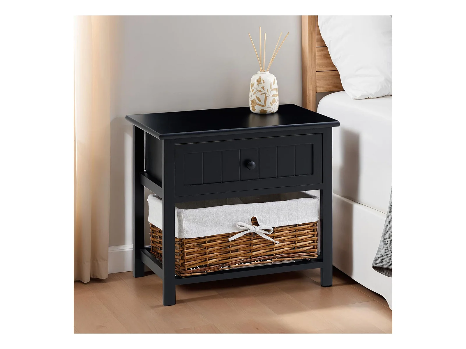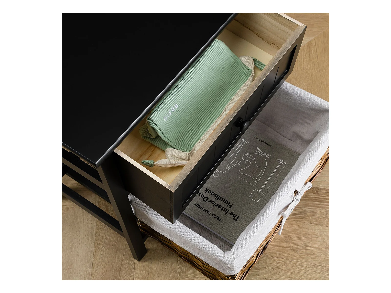 Table de chevet NOKOMIS table de nuit en bois avec 2 paniers en osier et insert en tissu blanc, meuble pour chambre lasuré noir