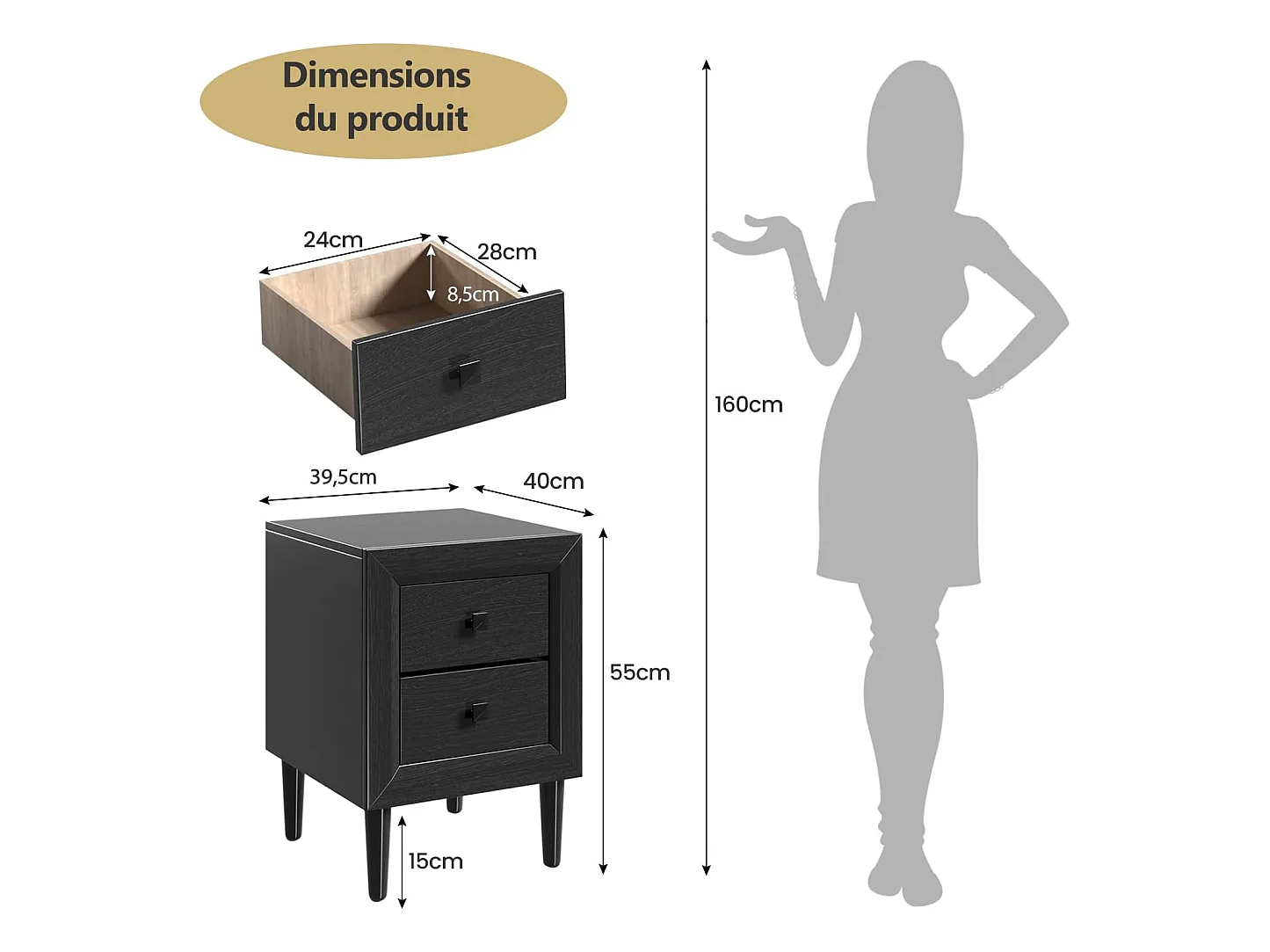 1 x Table de Chevet Moderne avec 2 Tiroirs, 40 x 39,5 x 55 CM, Table de Nuitavec Pieds en Bois Massif et Poignées, Noir