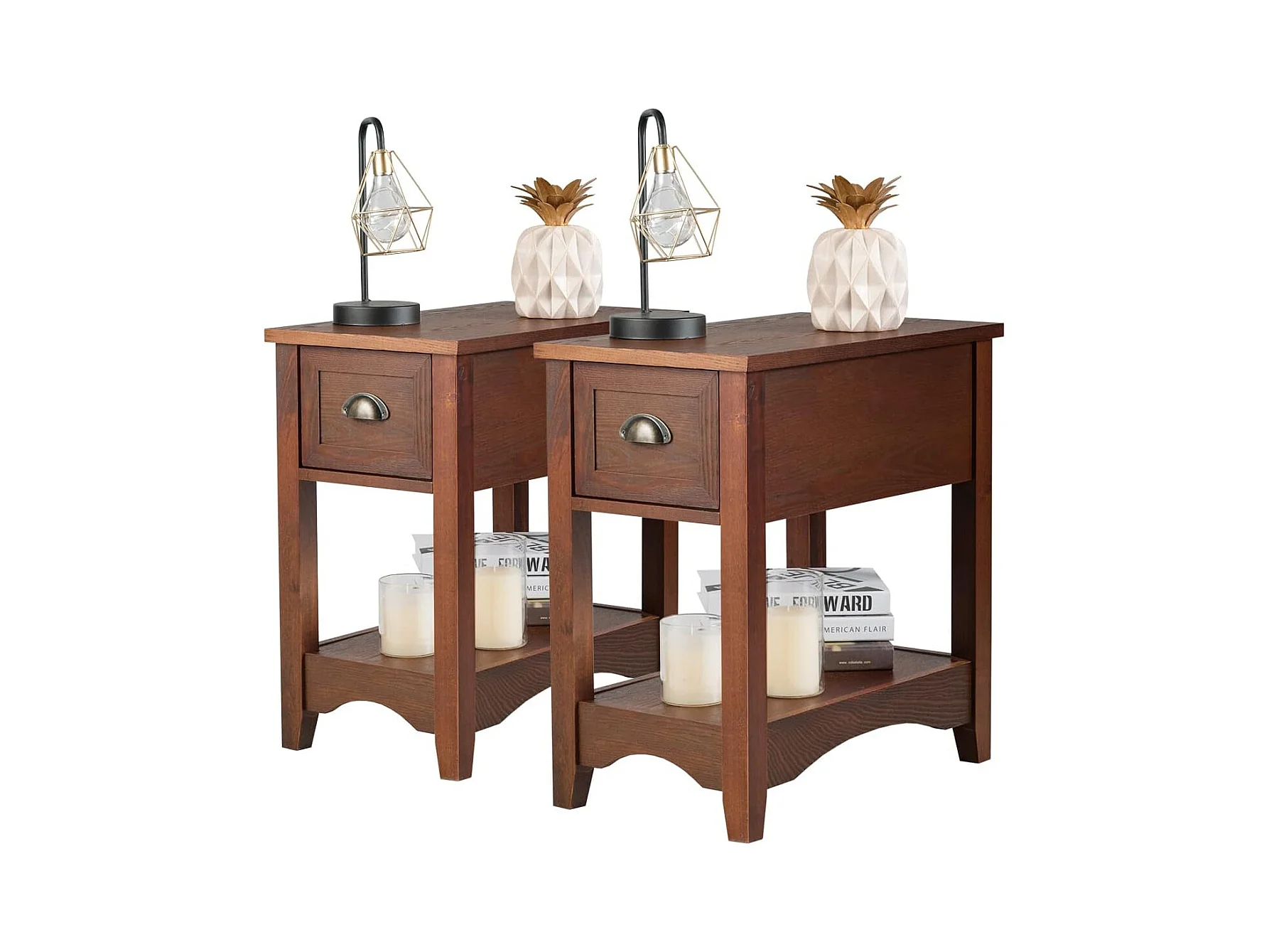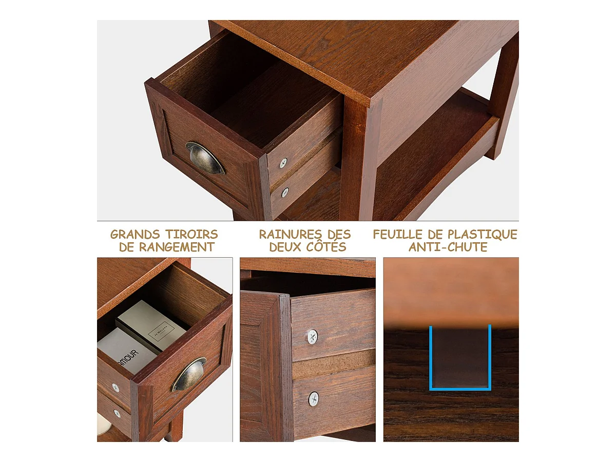 Table de Chevet avec Tiroir, Table d'Appoint Pieds en Bois d'Hévéa, Bout de Canapé Rétro pour Chambre, Salon, 56 x 33 x 58,5 cm (Brun rougeâtre, Lot de 2)