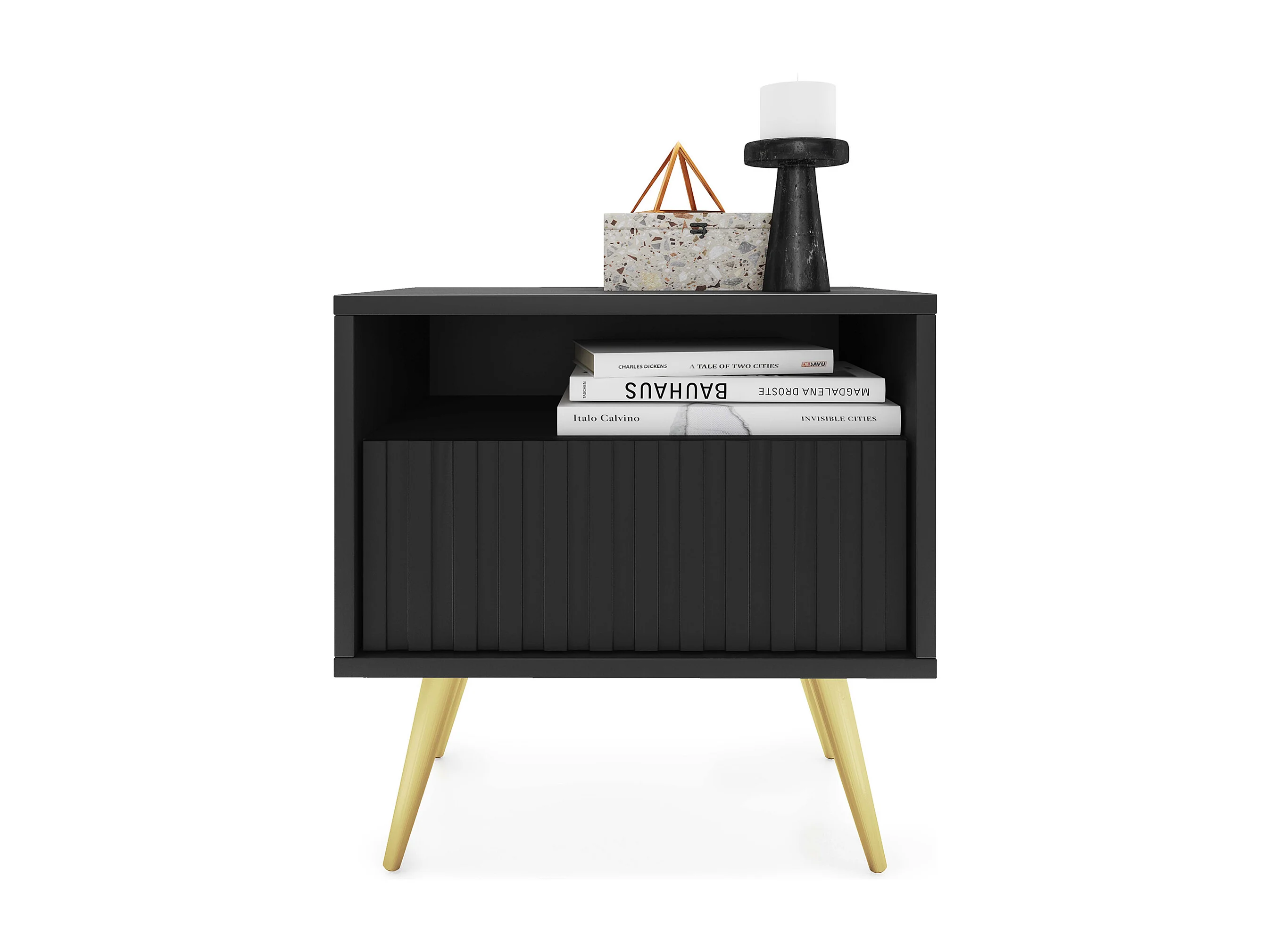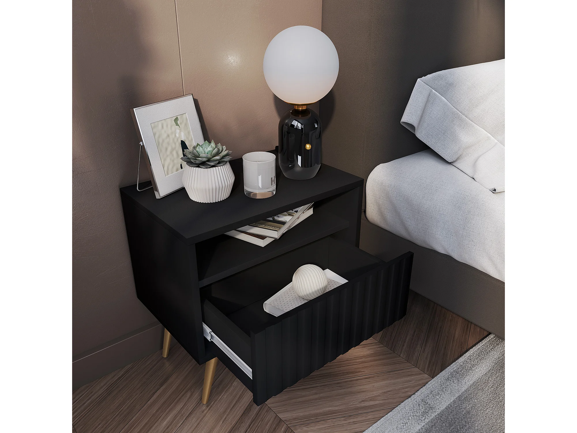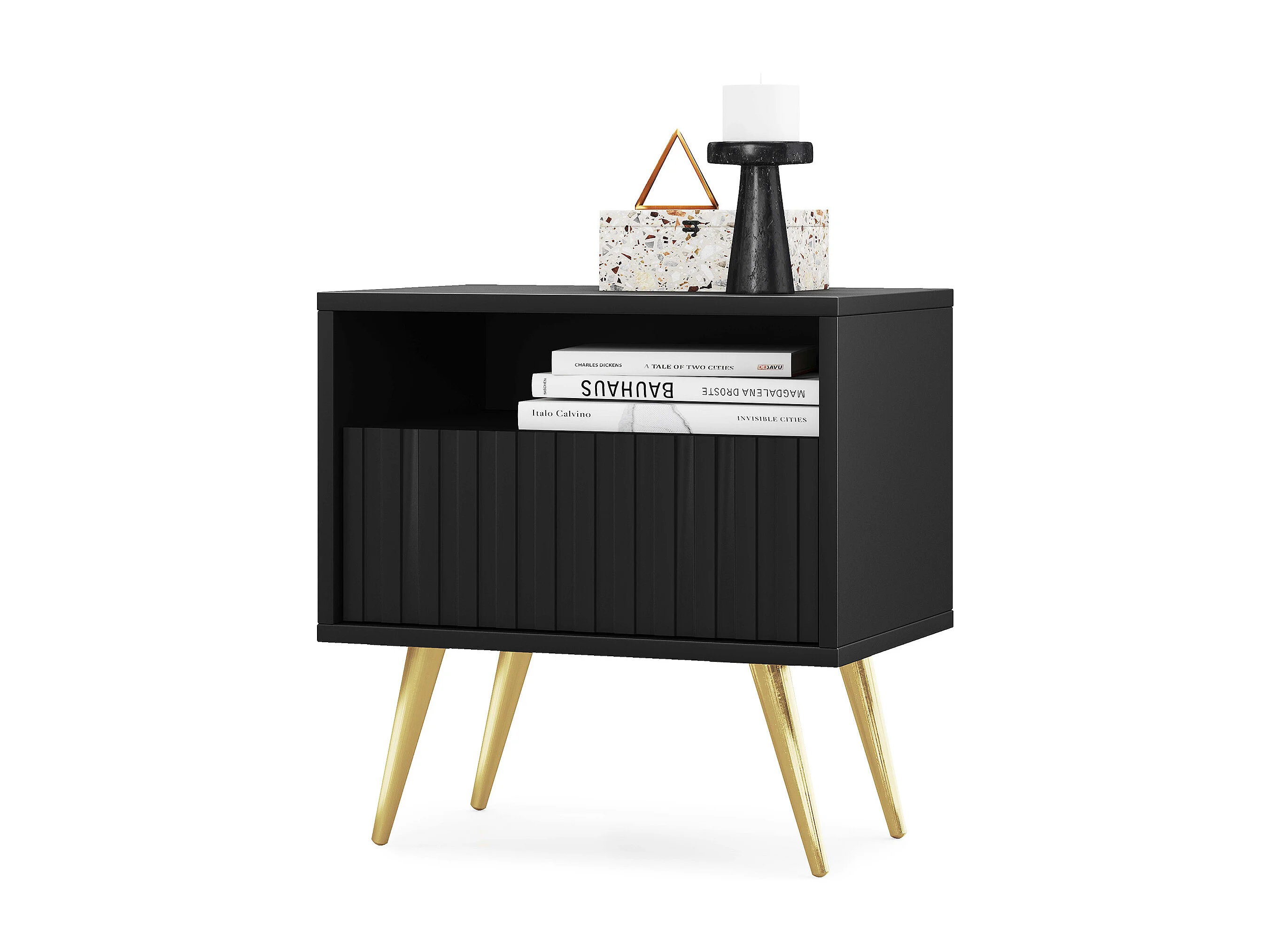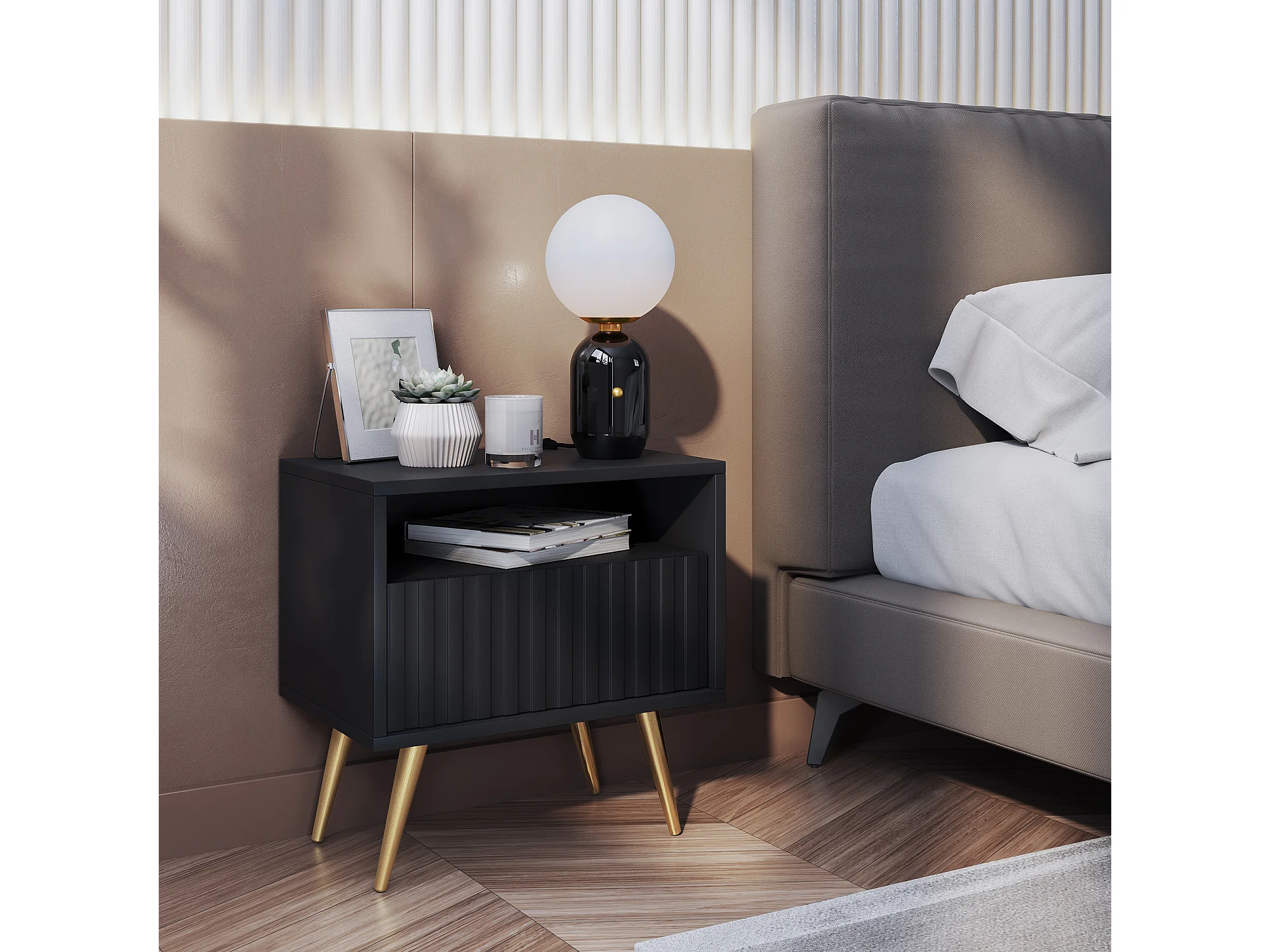 Table de chevet avec un tiroir - façade à lamelles - noir avec pieds dorés - BELLO