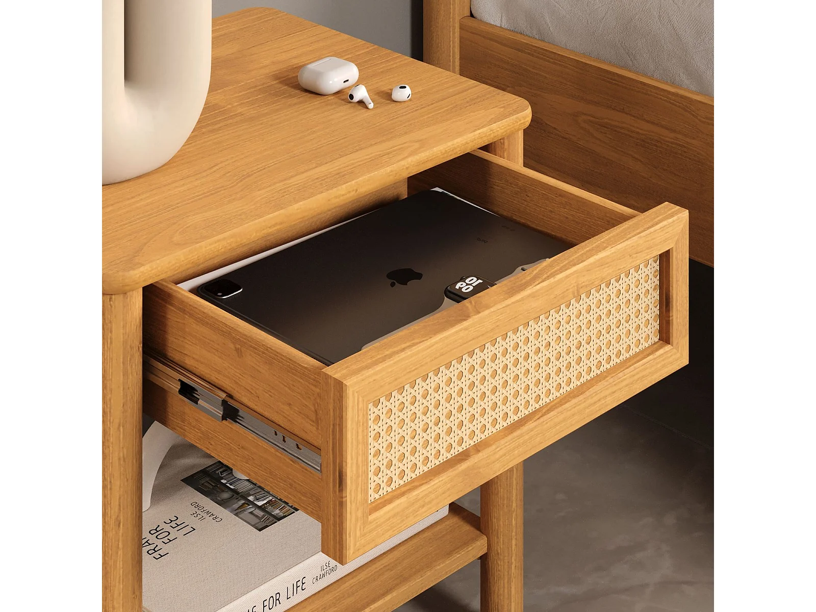 Table de Chevet CEFIRA avec 1 Tiroir en Bois Massif Couleur Chêne, Design Élégant en Rotin, avec 1 Étagère