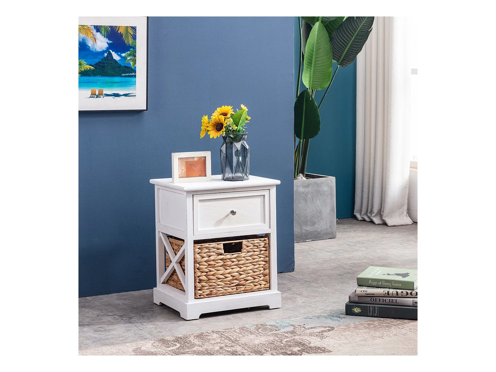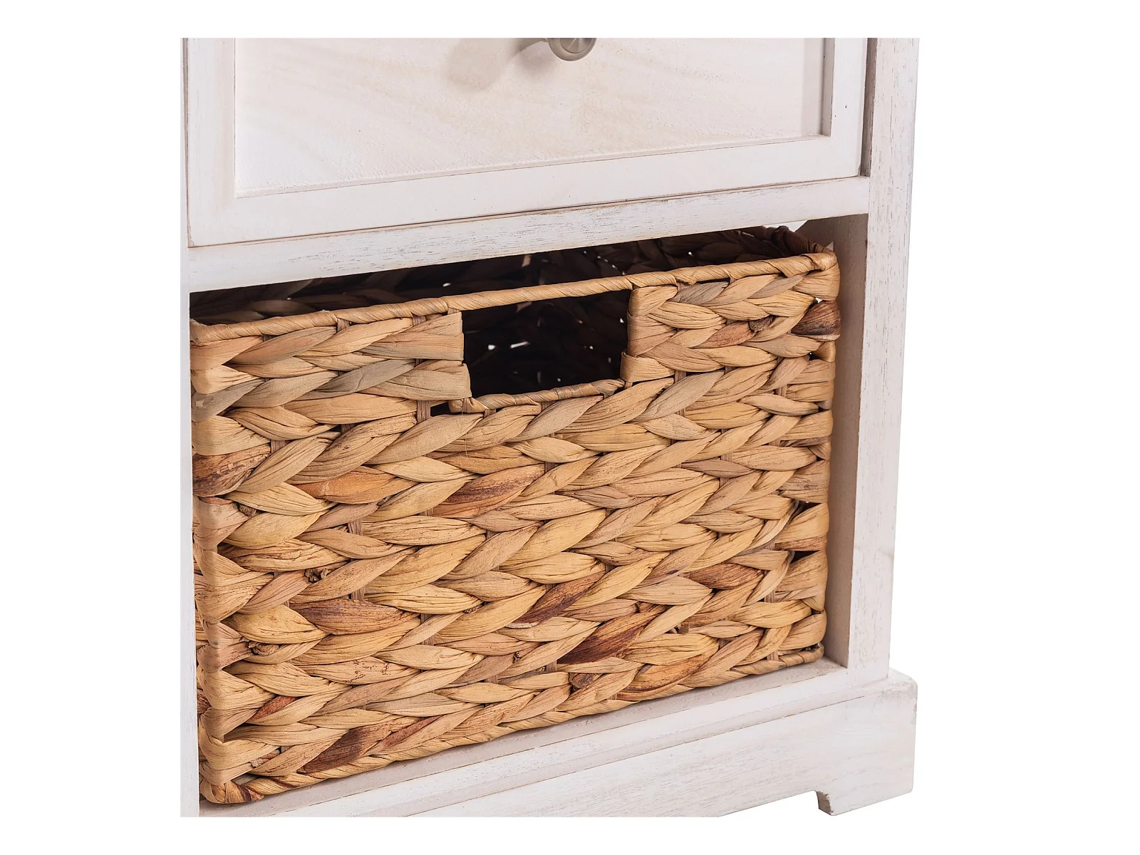 Table de chevet CHEYENNE petite commode de nuit avec 1 tiroir et 1 panier tressé en bois de paulownia blanc style maison de campagne