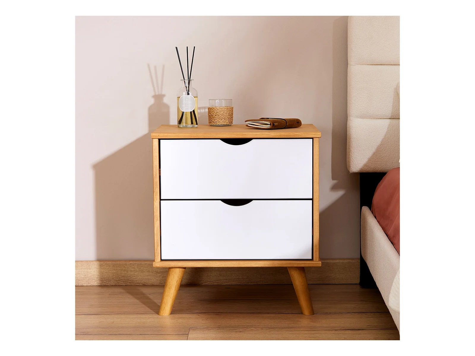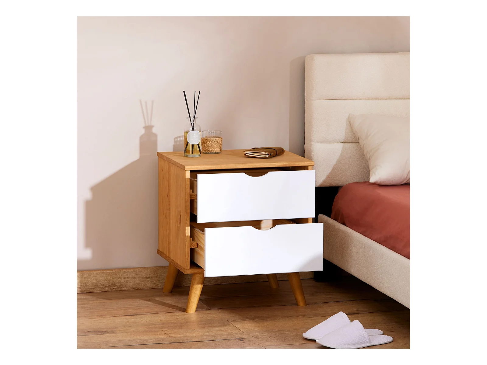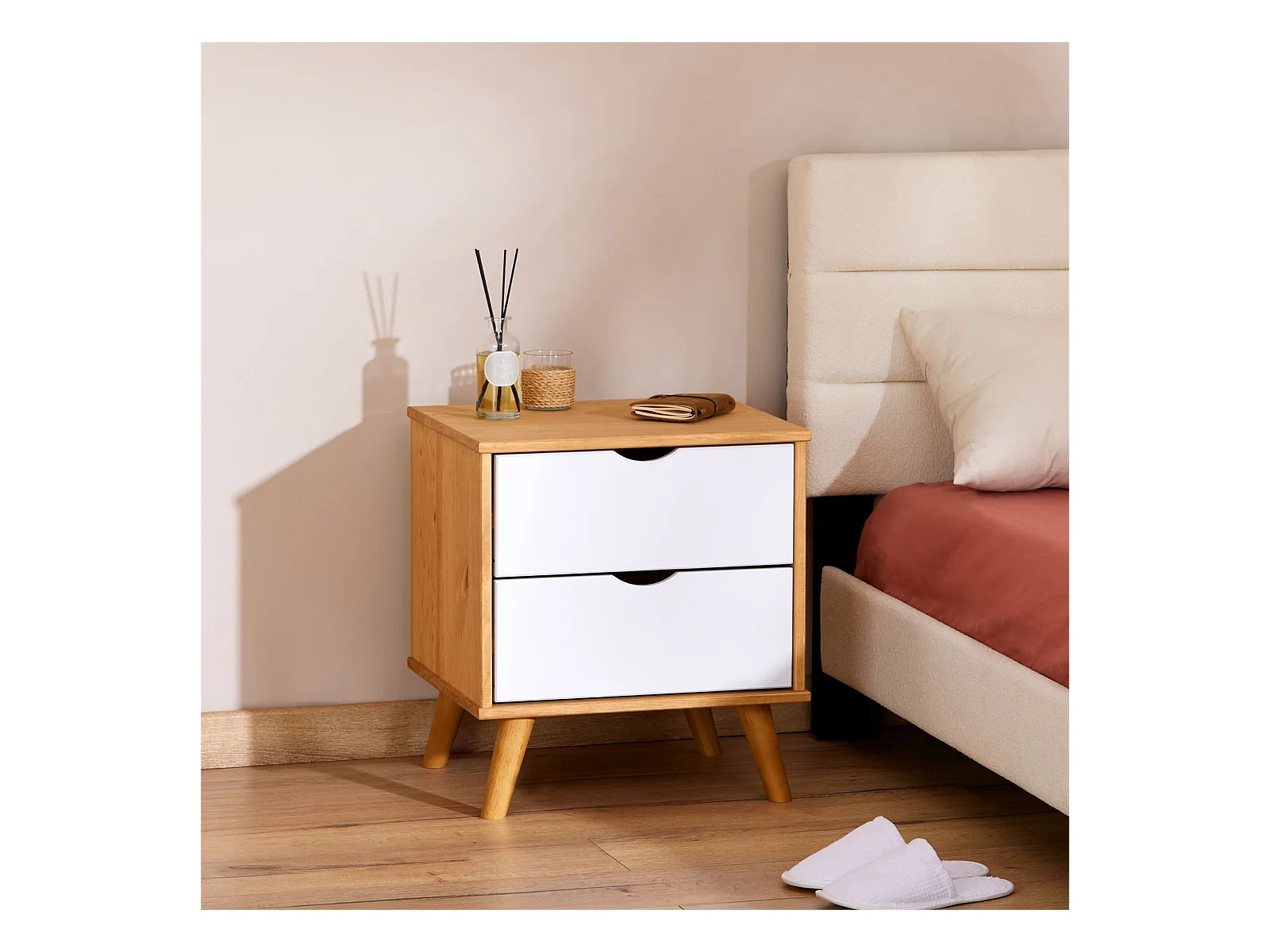 Table de chevet COLIMA en pin massif avec 2 tiroirs, table de nuit en bois sur pieds coloris blanc et naturel
