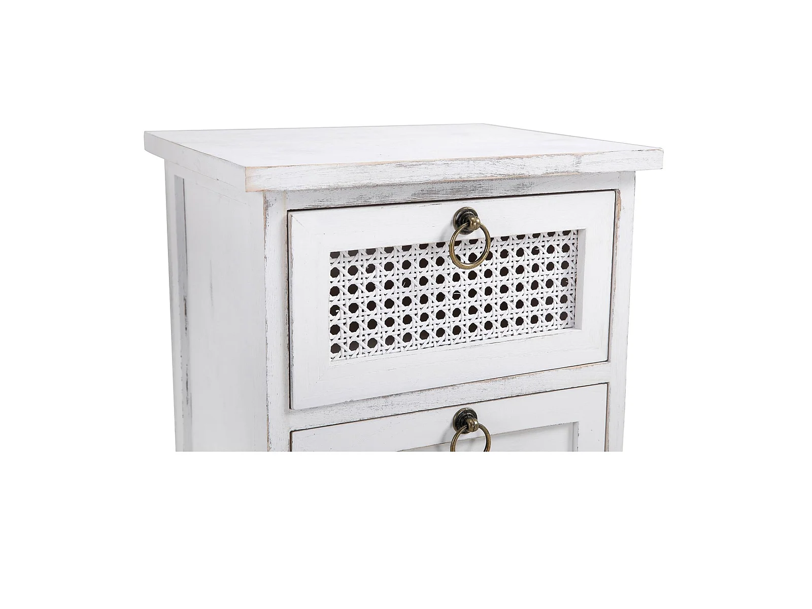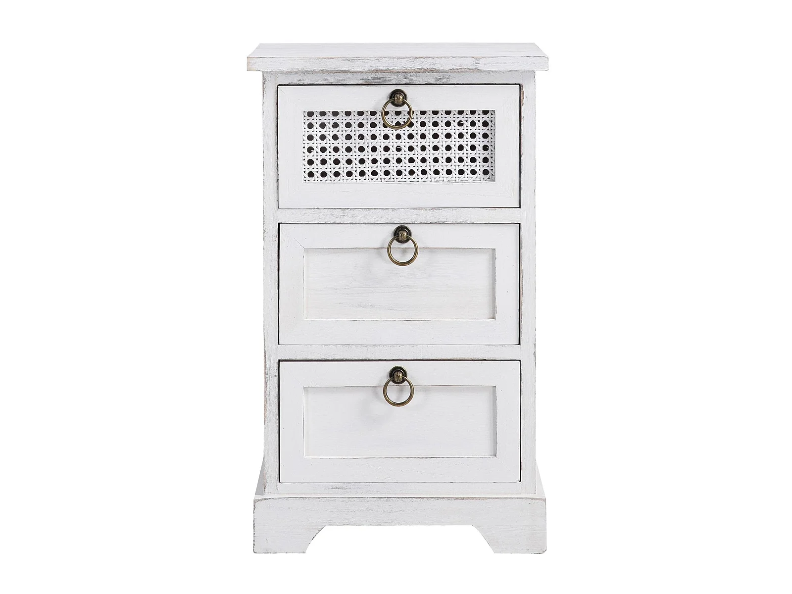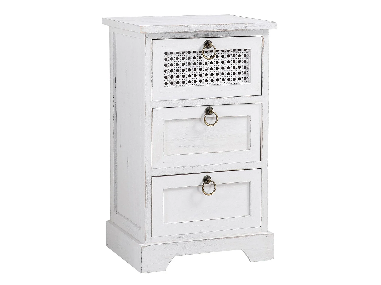 Table de chevet IRMA petite commode de nuit avec 3 tiroirs, en bois paulownia blanc style shabby chic vintage bohême déco en rotin