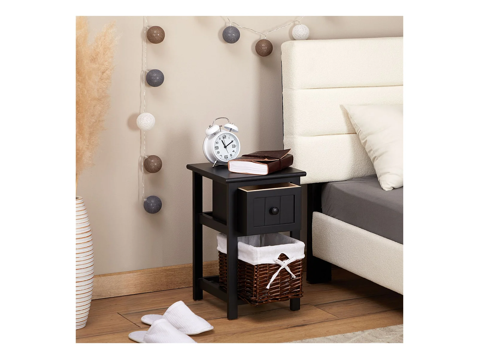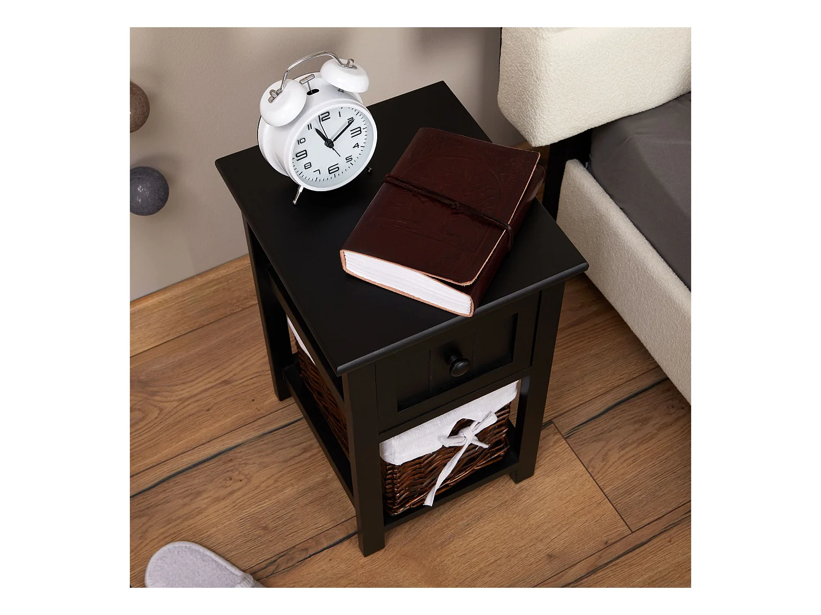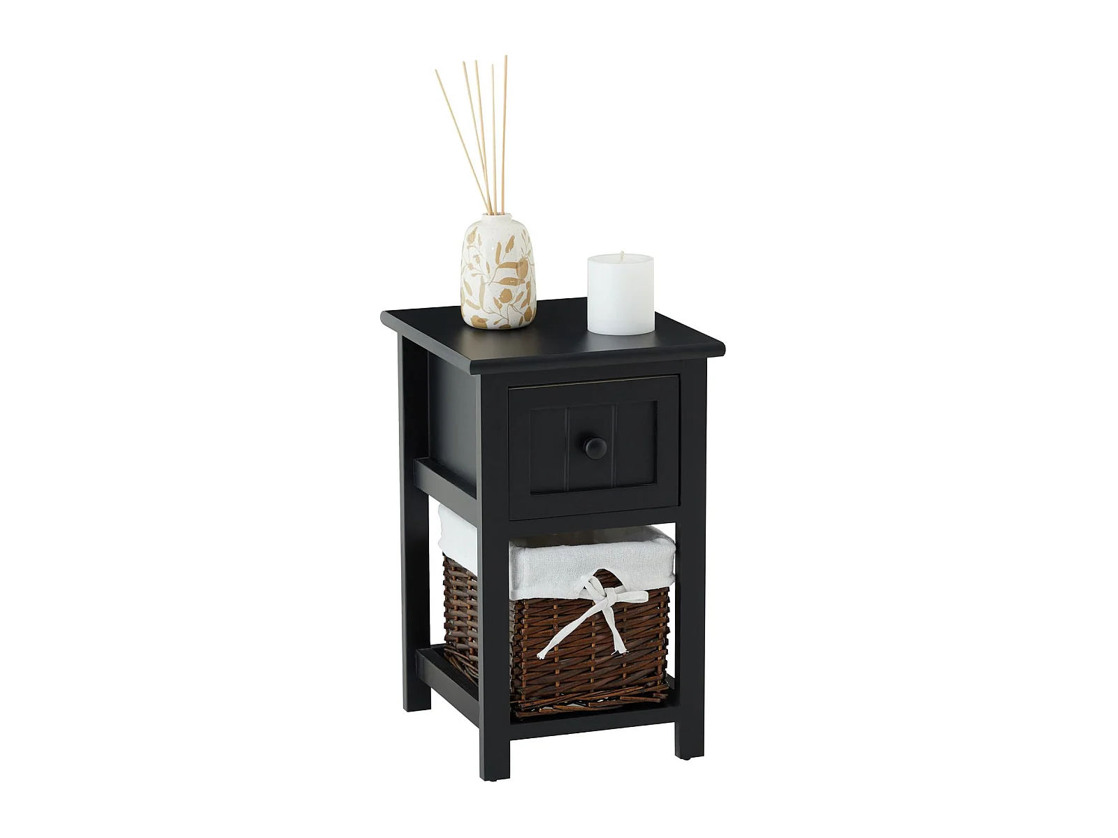 Table de chevet MESSINA table de nuit en bois noir avec 1 tiroir et 1 panier en osier et insert en tissu blanc
