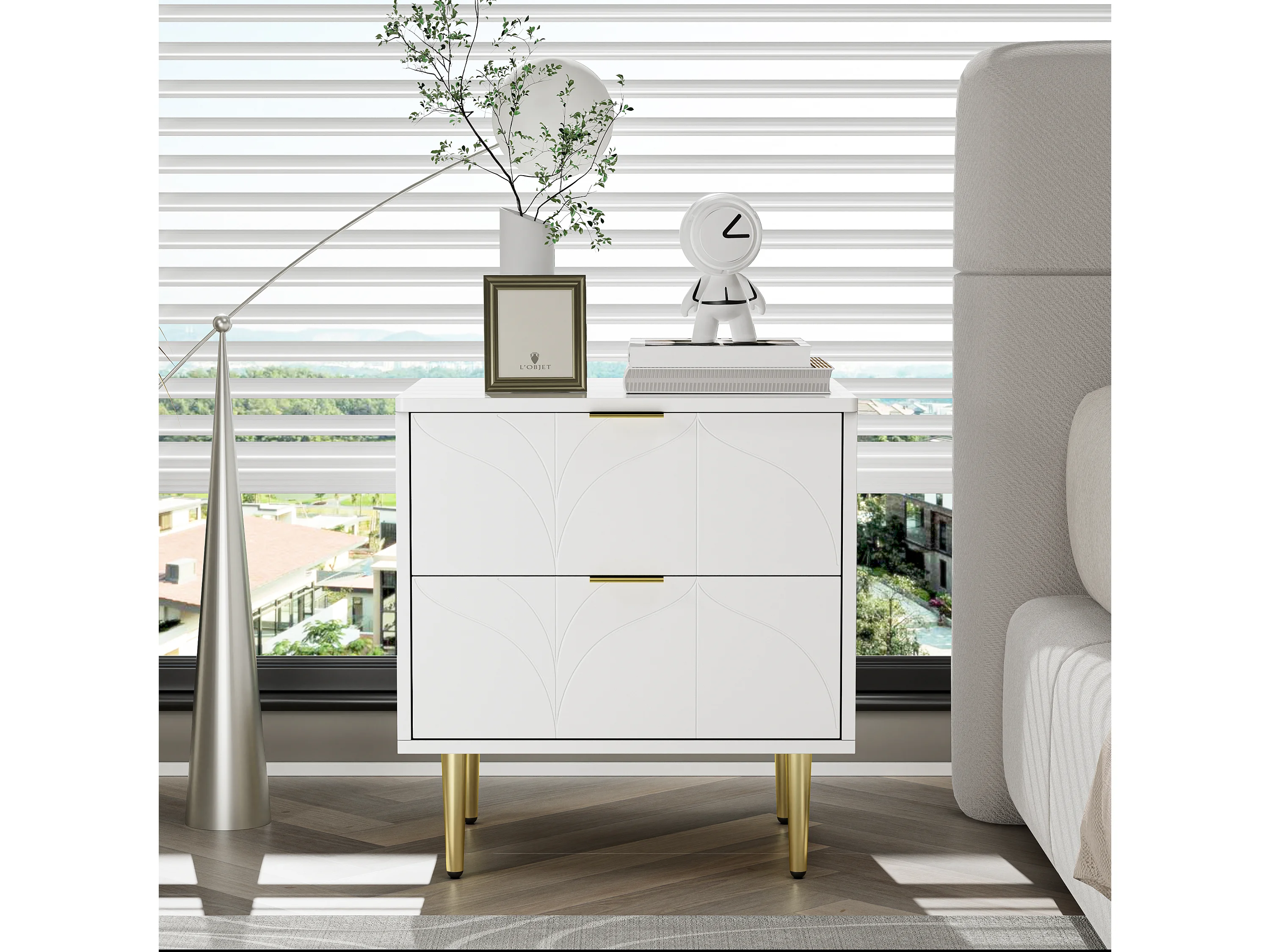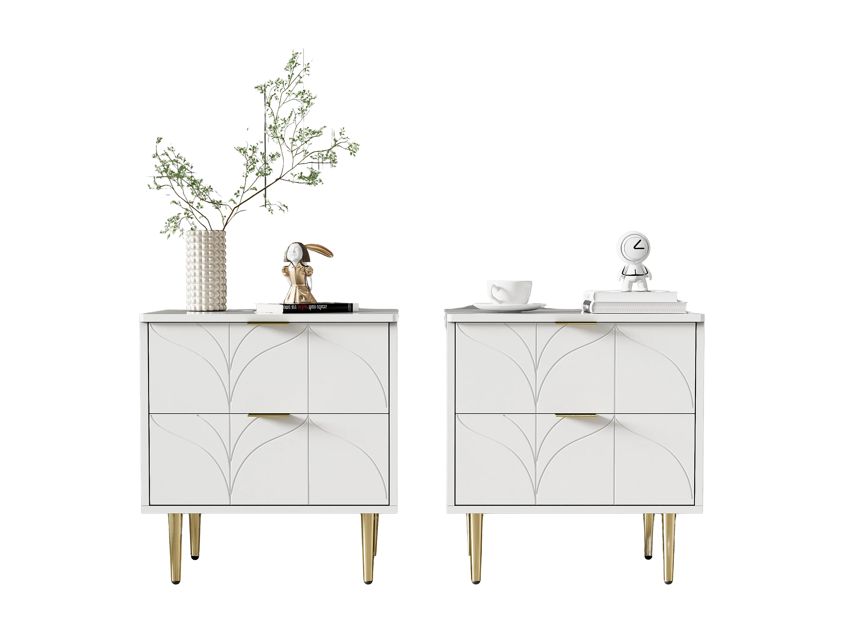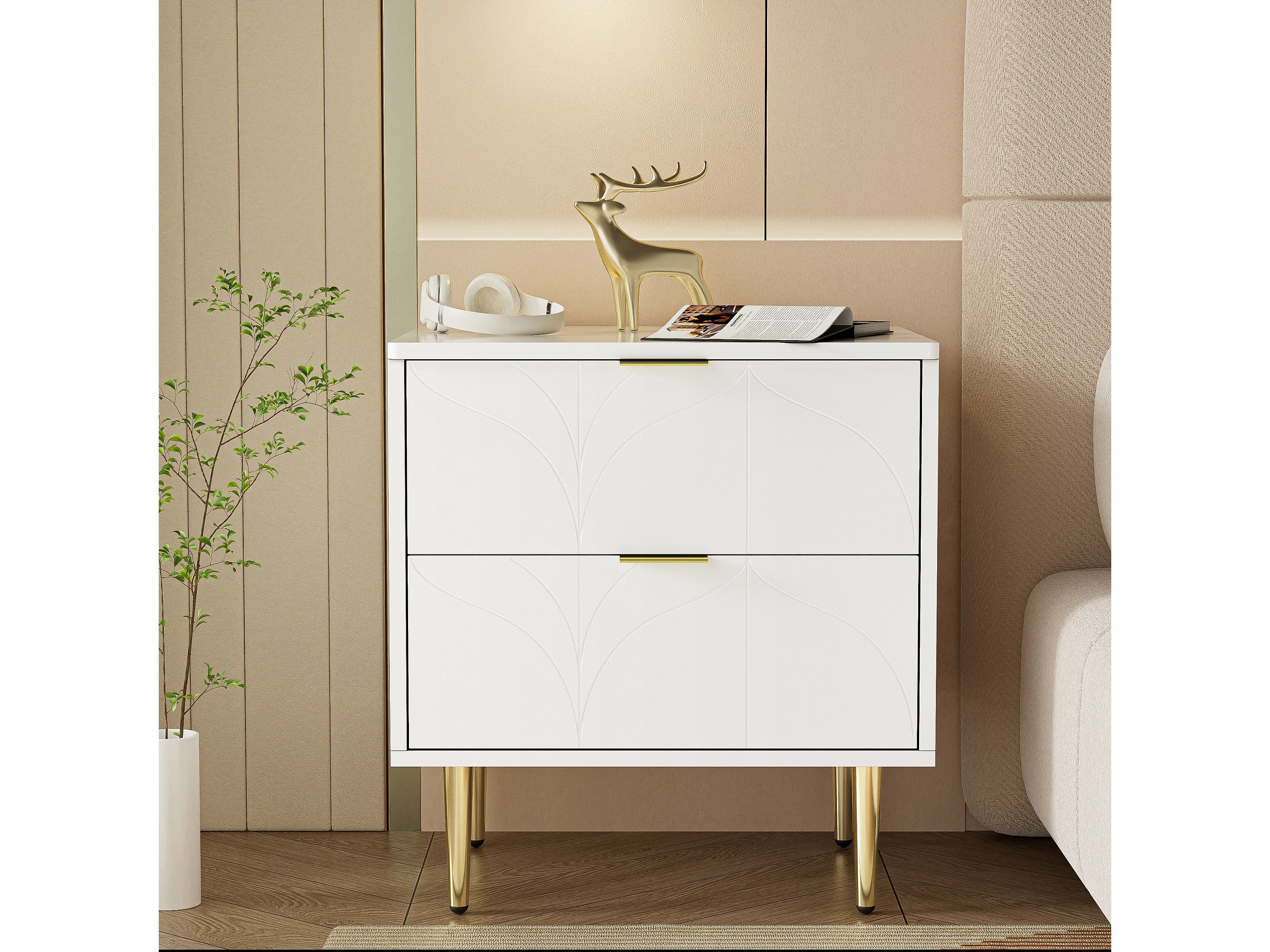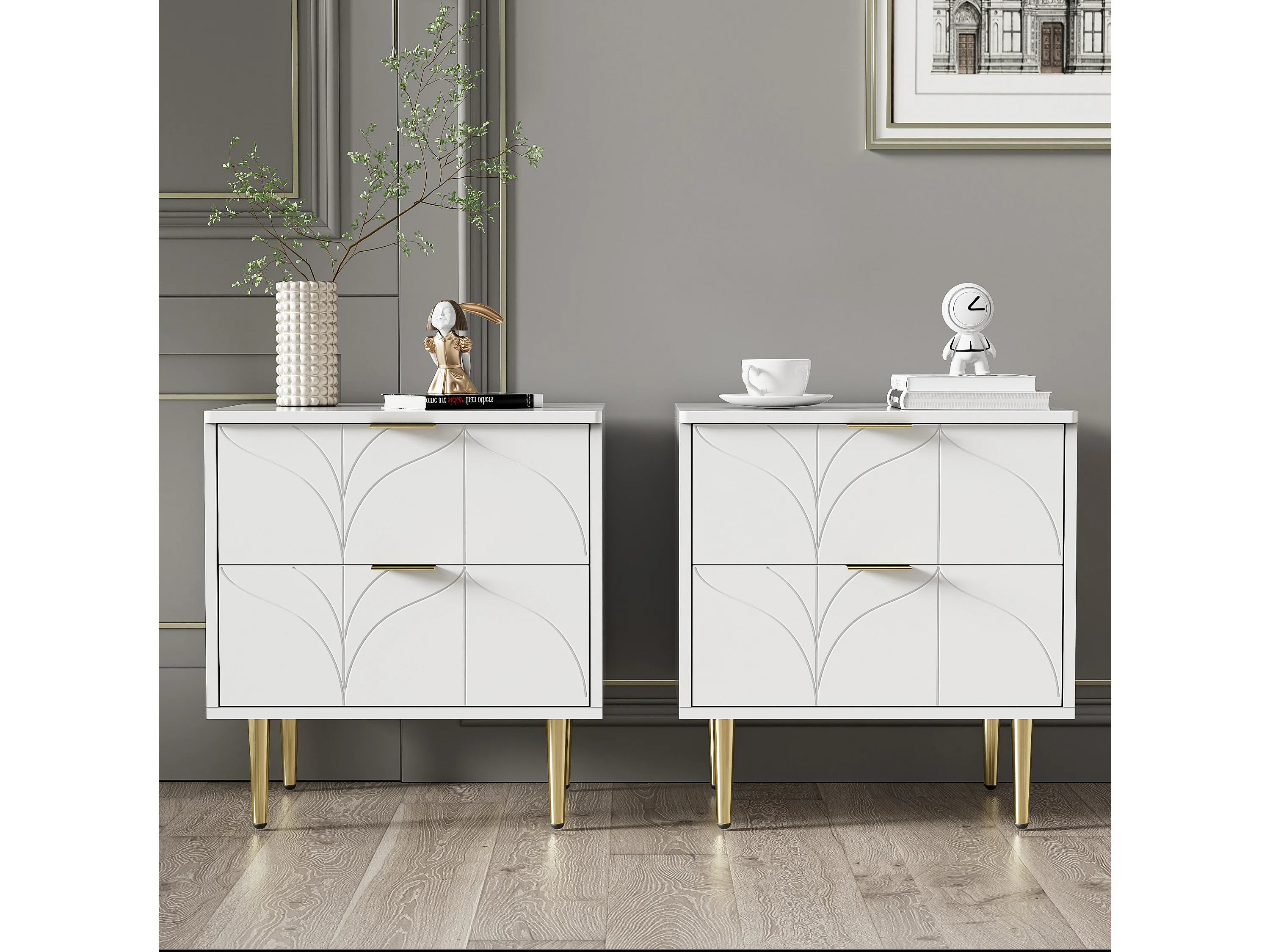 Table de chevet moderne, lot de 2, pieds et boutons dorés, motif floral, 2 tiroirs, laquée, coins avec design anti-chocs, blanc (50x40x54cm)
