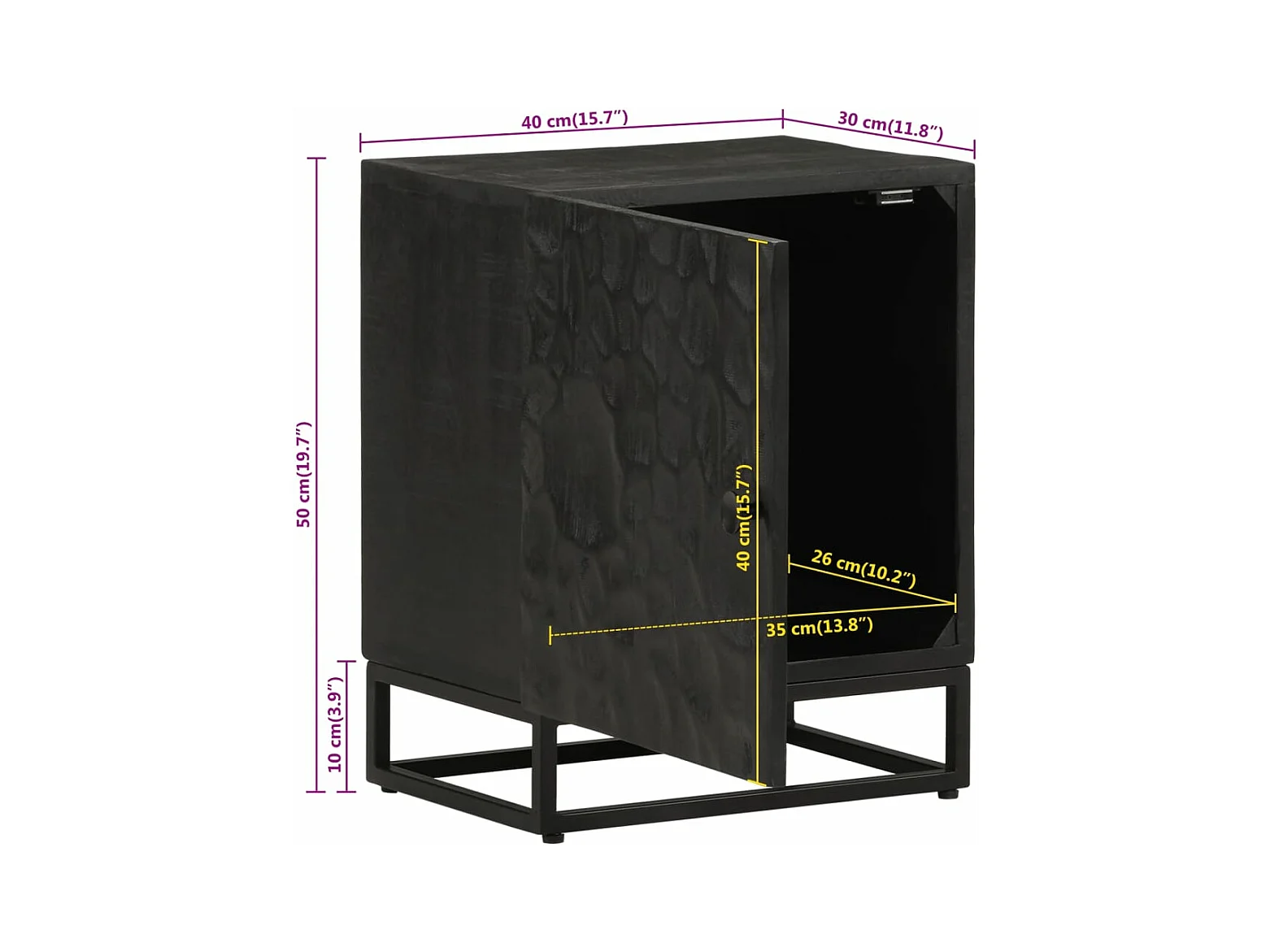 Table de chevet noir 40x30x50 bois massif manguier et fer