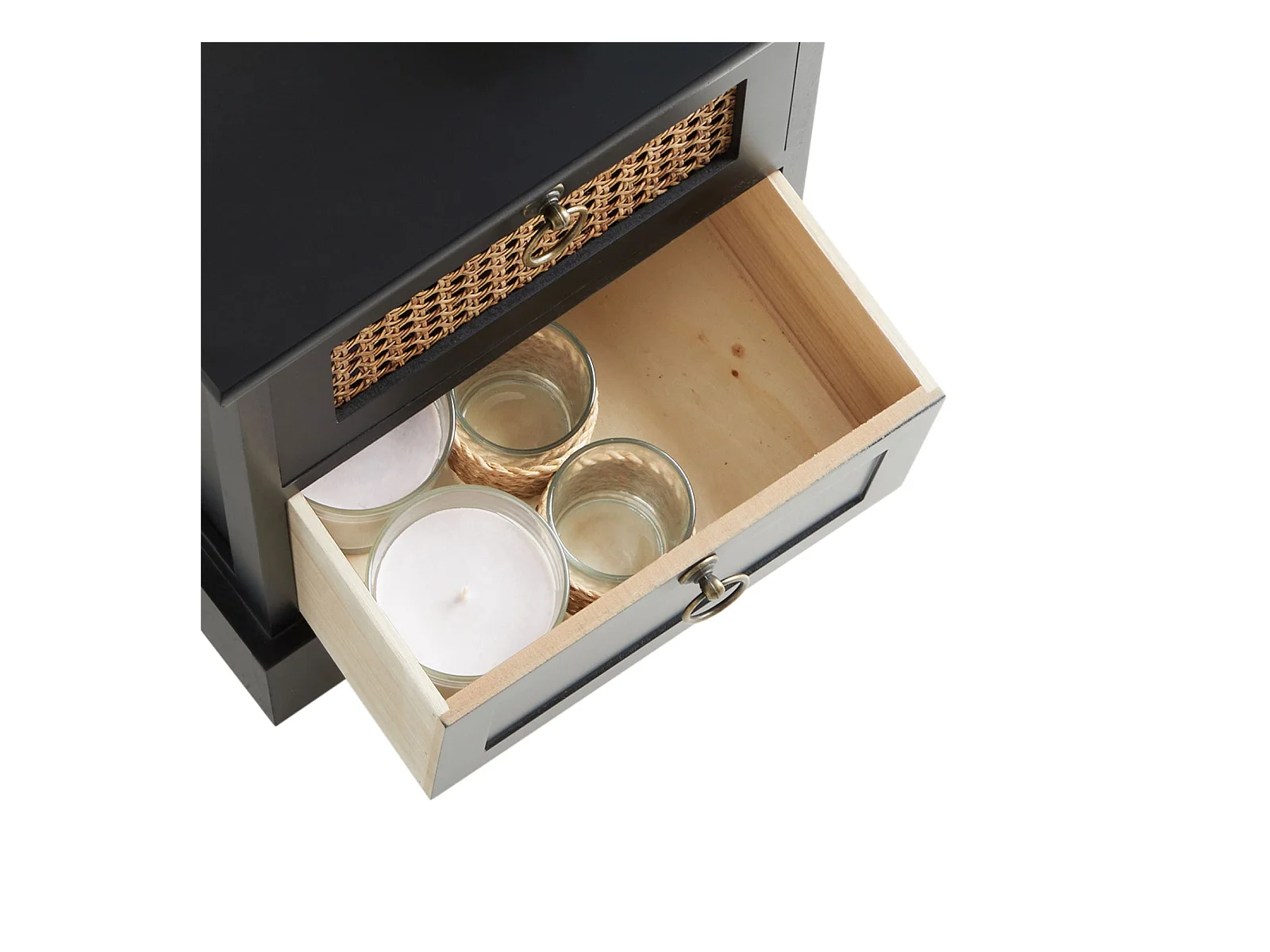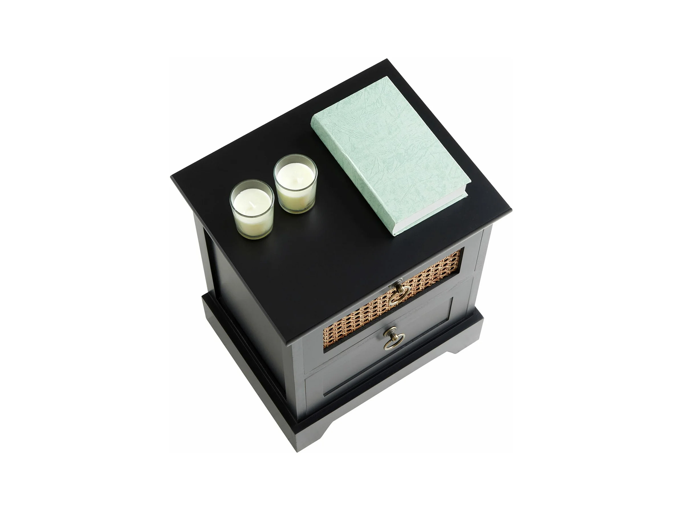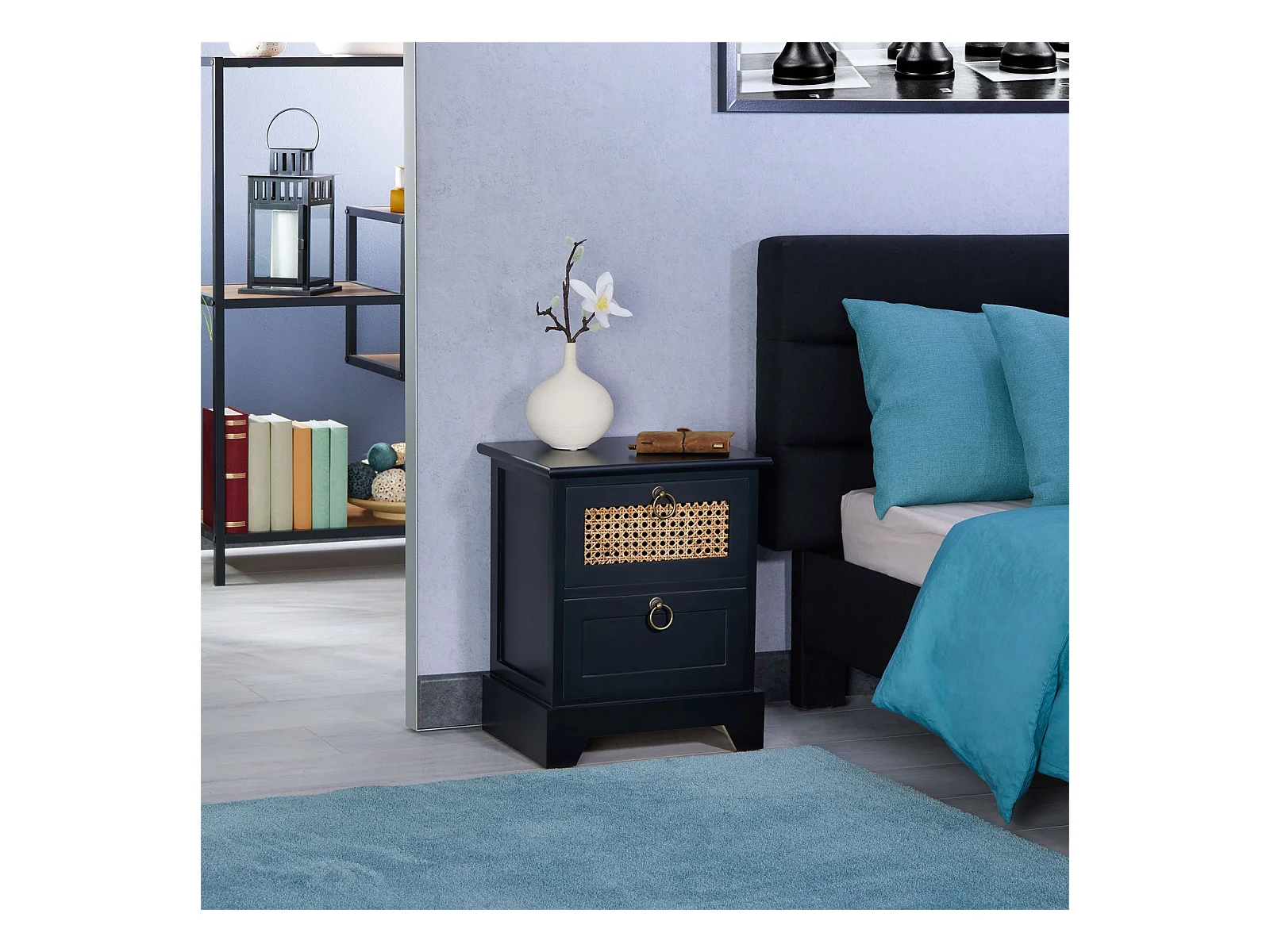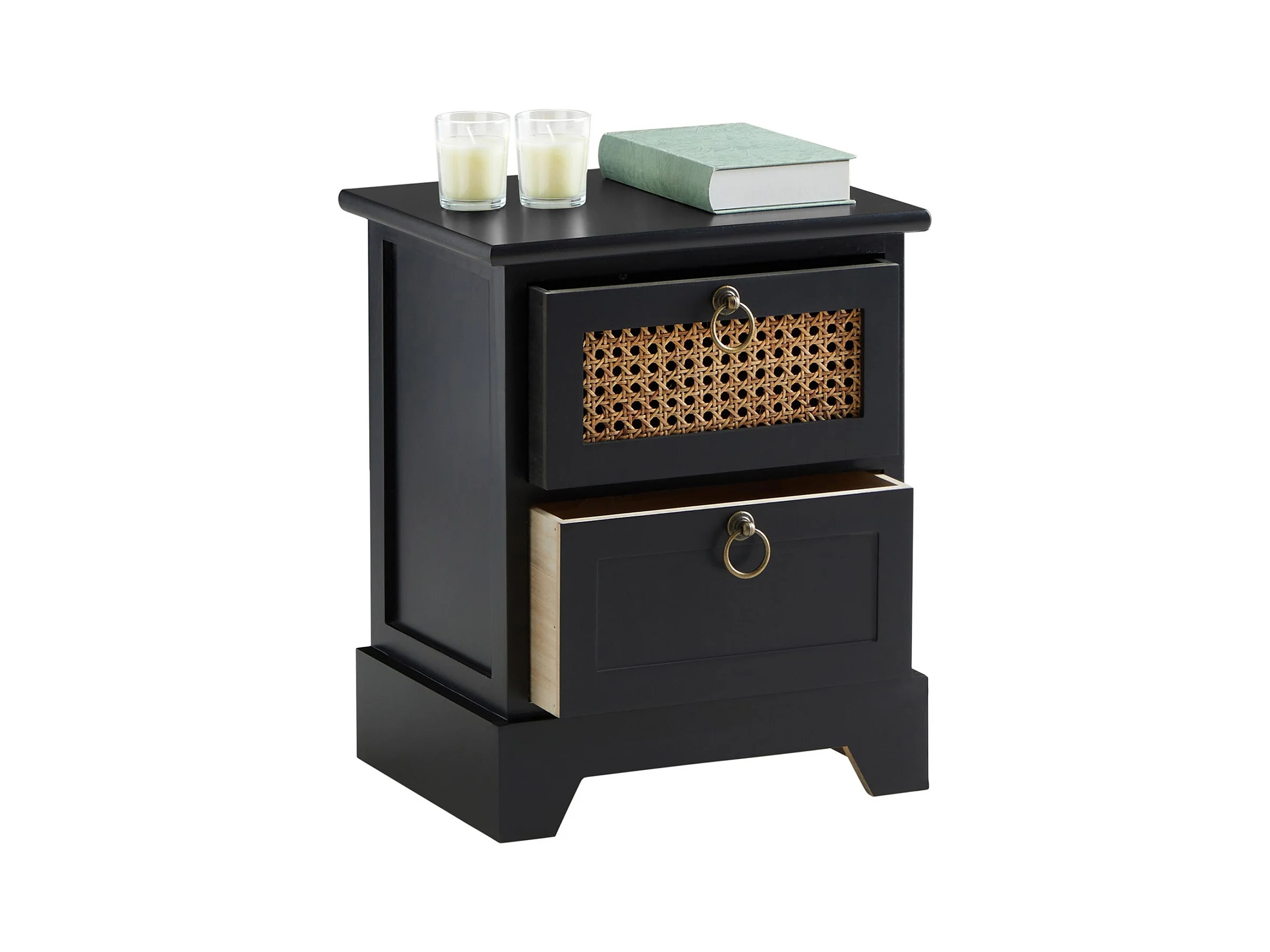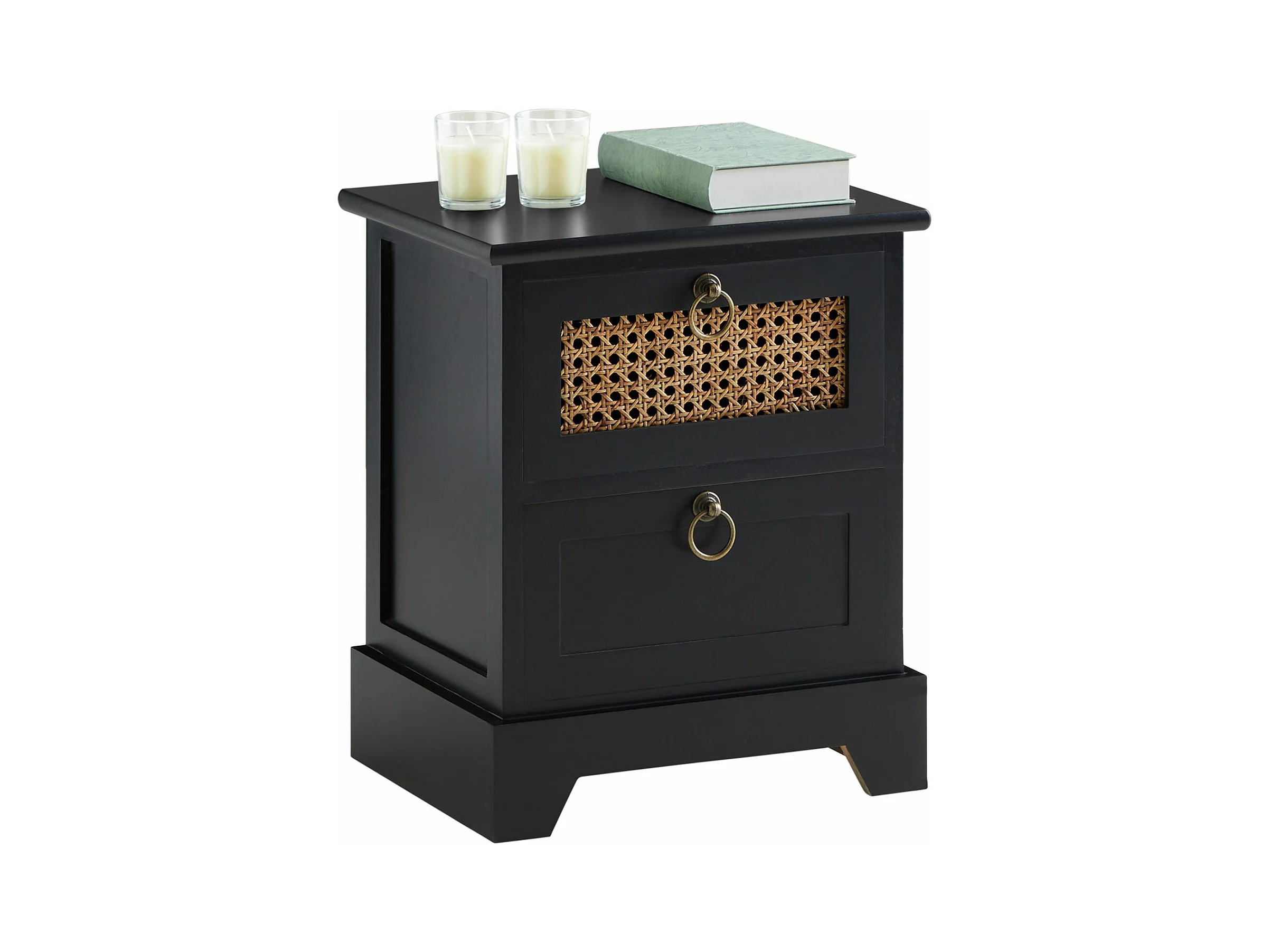 Table de chevet PADMA 2 tiroirs, table de nuit design vintage en bois lasuré noir et cannage en rotin