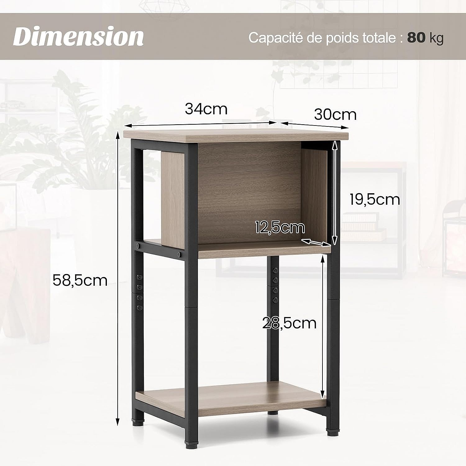 1 Table de Chevet, Table d'Appoint Compacte 3 Niveaux, 2 Compartiments, Table de Nuit Étroite pour Petits Espaces, Chambre à Coucher, Salon, 34 x 30 x 58,5 cm (1)