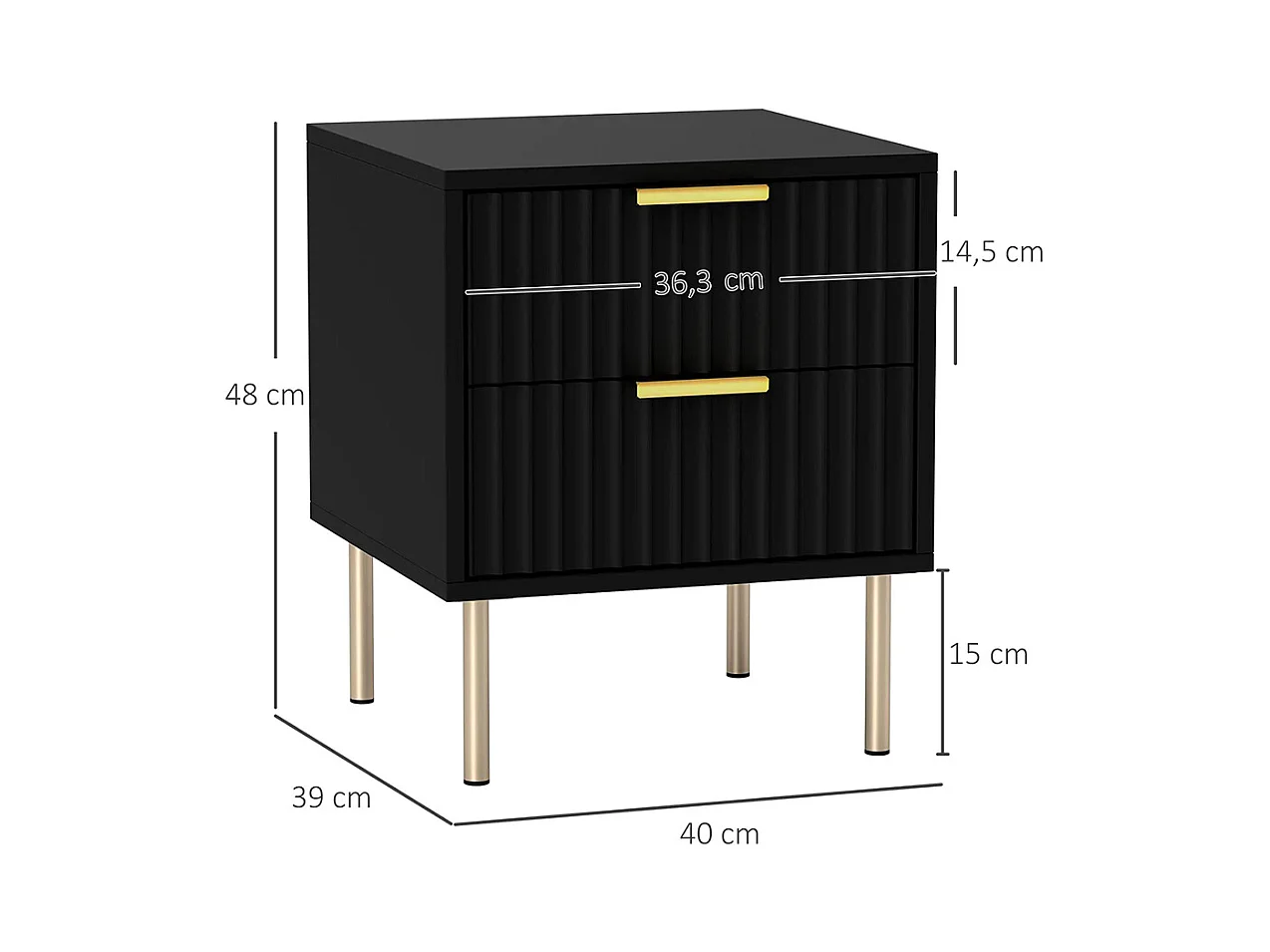 Table de chevet, table de chevet avec rainures, équipée de 2 tiroirs et de pieds en acier, couleur noire.