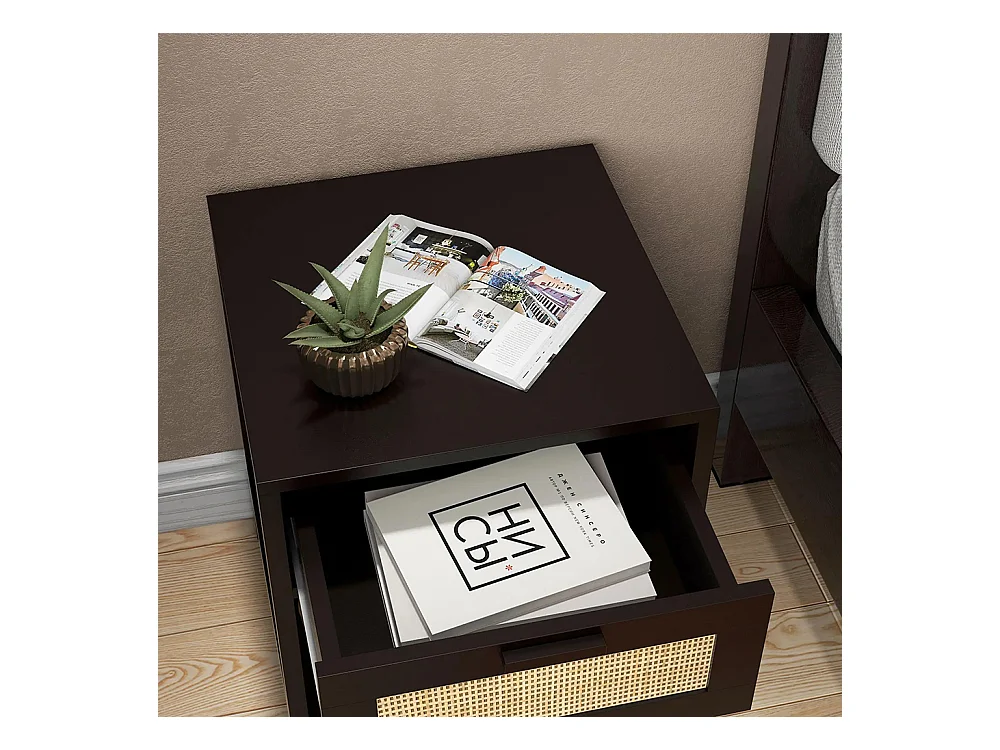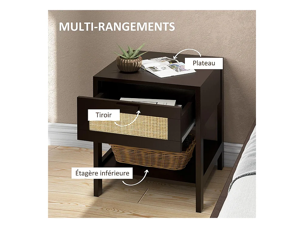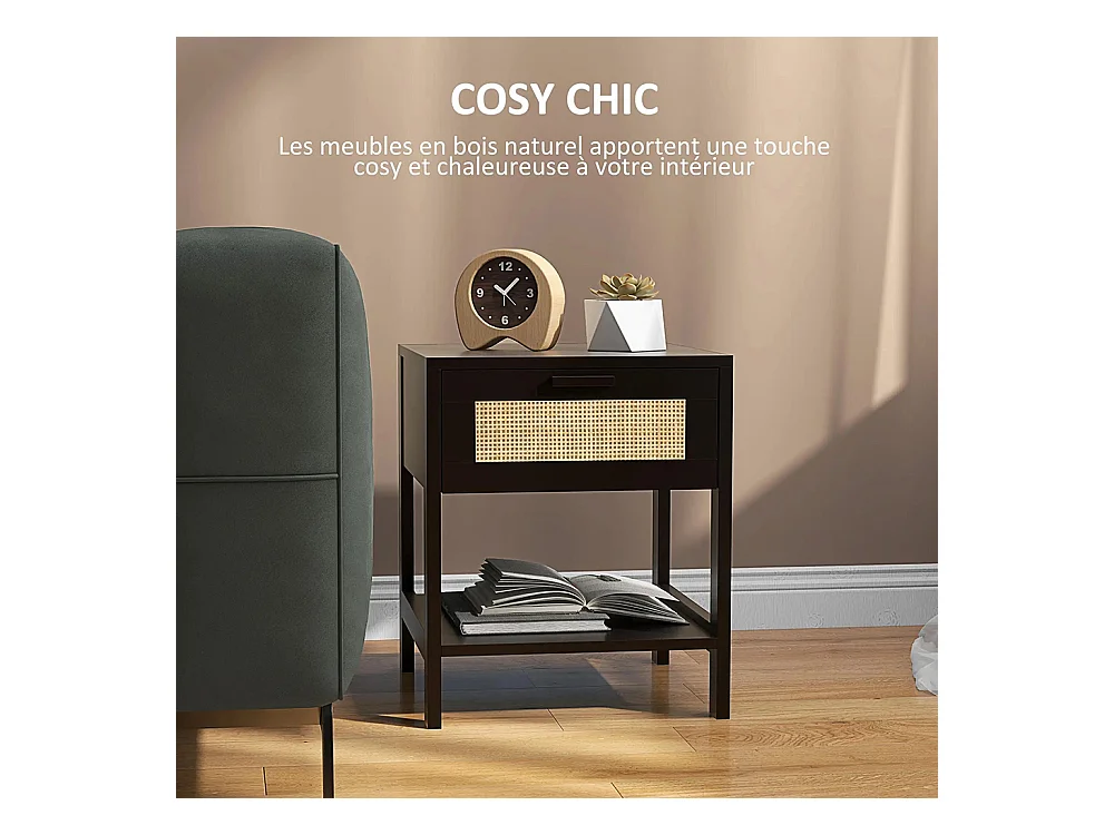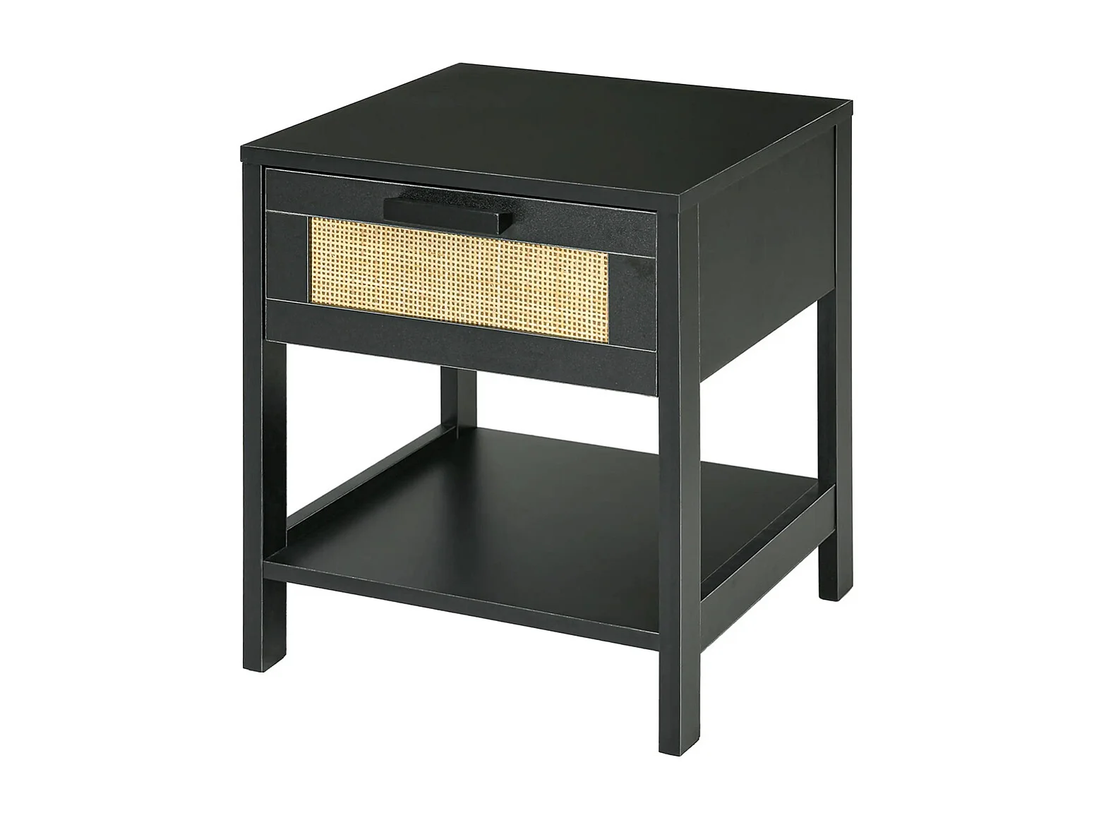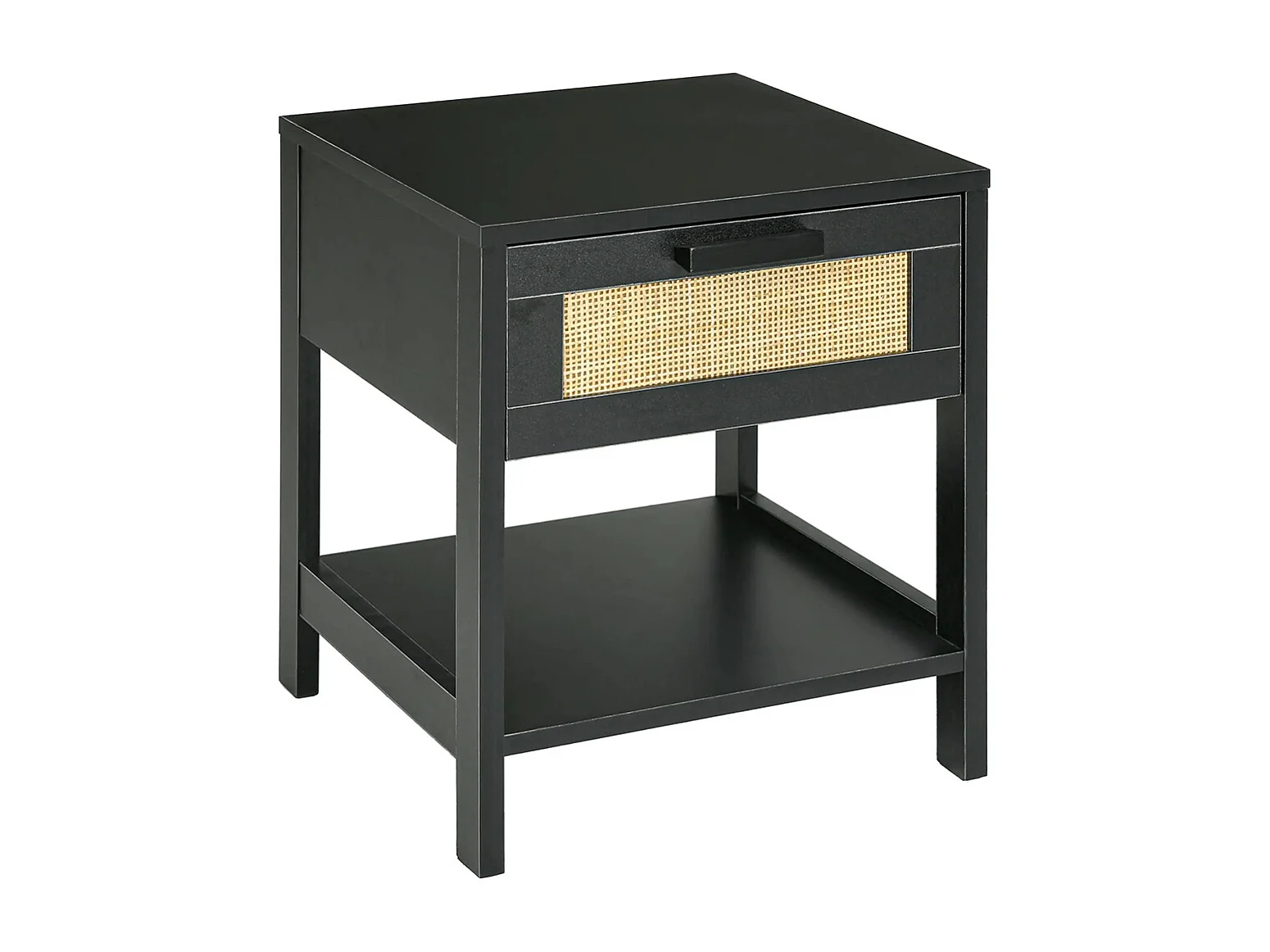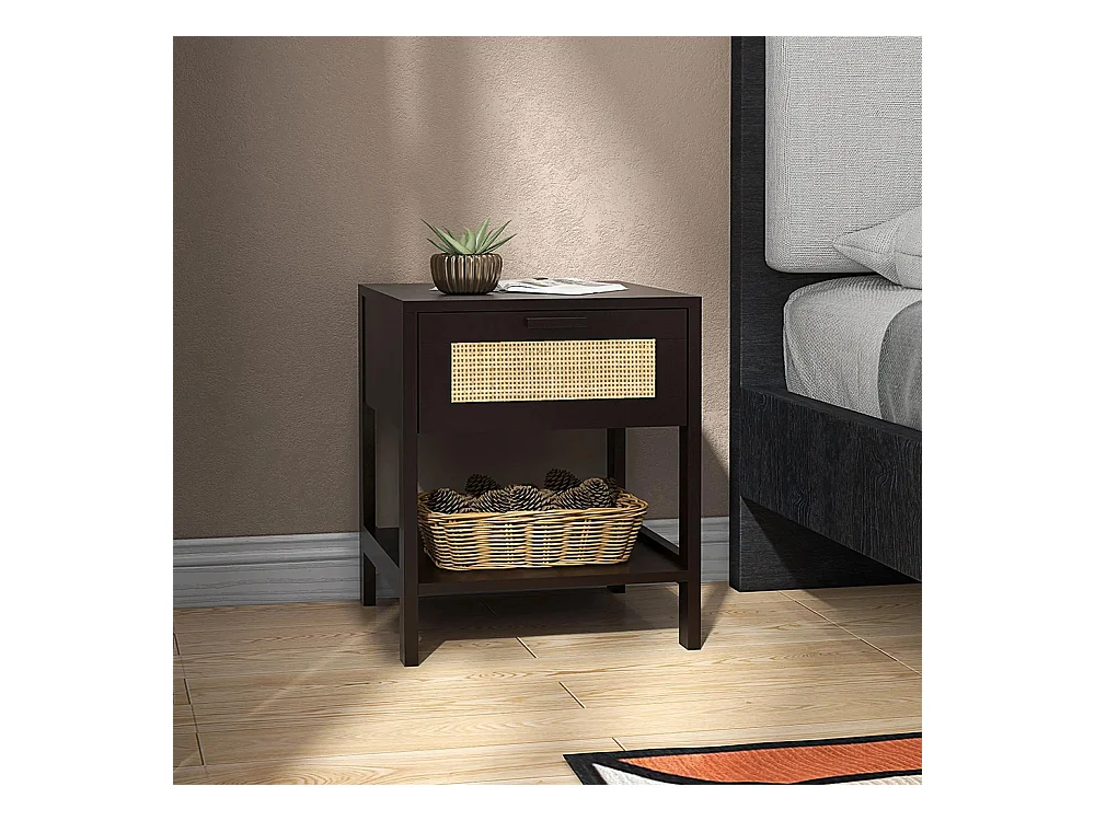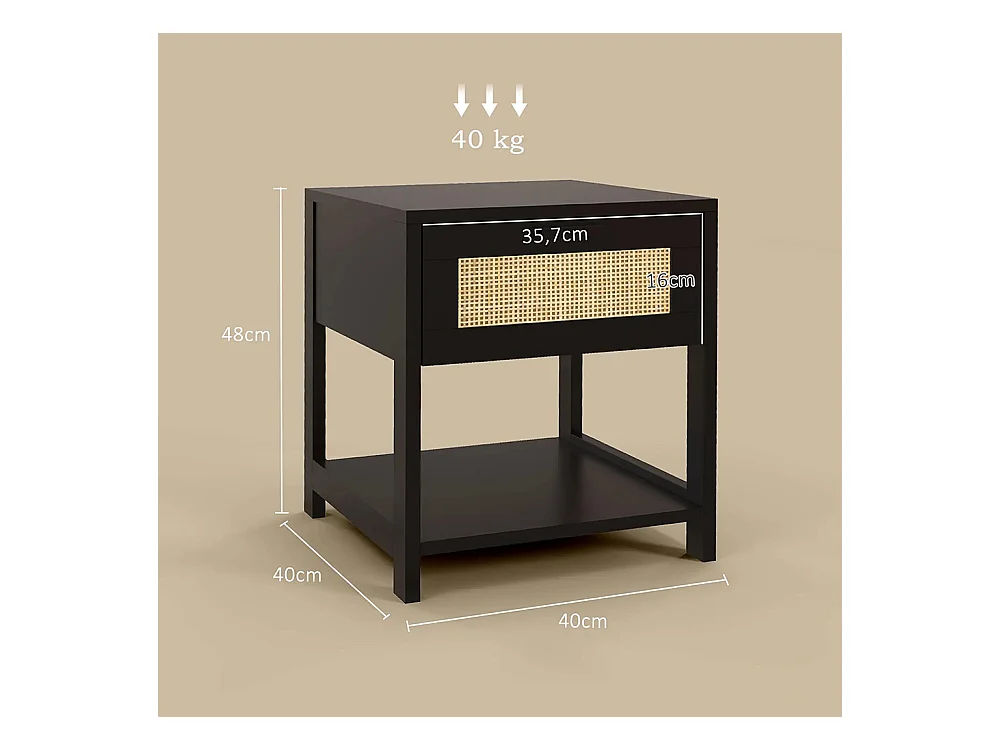 Table de chevet table de nuit avec tiroir et étagère, cannage en rotin, dim. 40L x 40l x 48H cm, noir