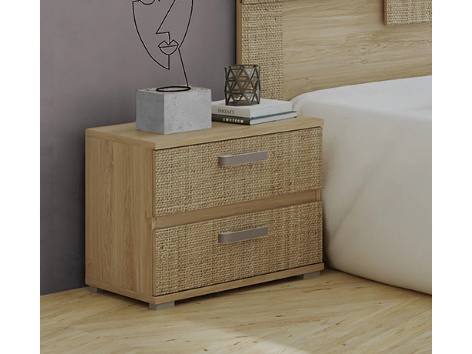 Chevet table de nuit design scandinave tiroir + niche bois pin panneaux particules motif chevrons blanc aspect chêne clair