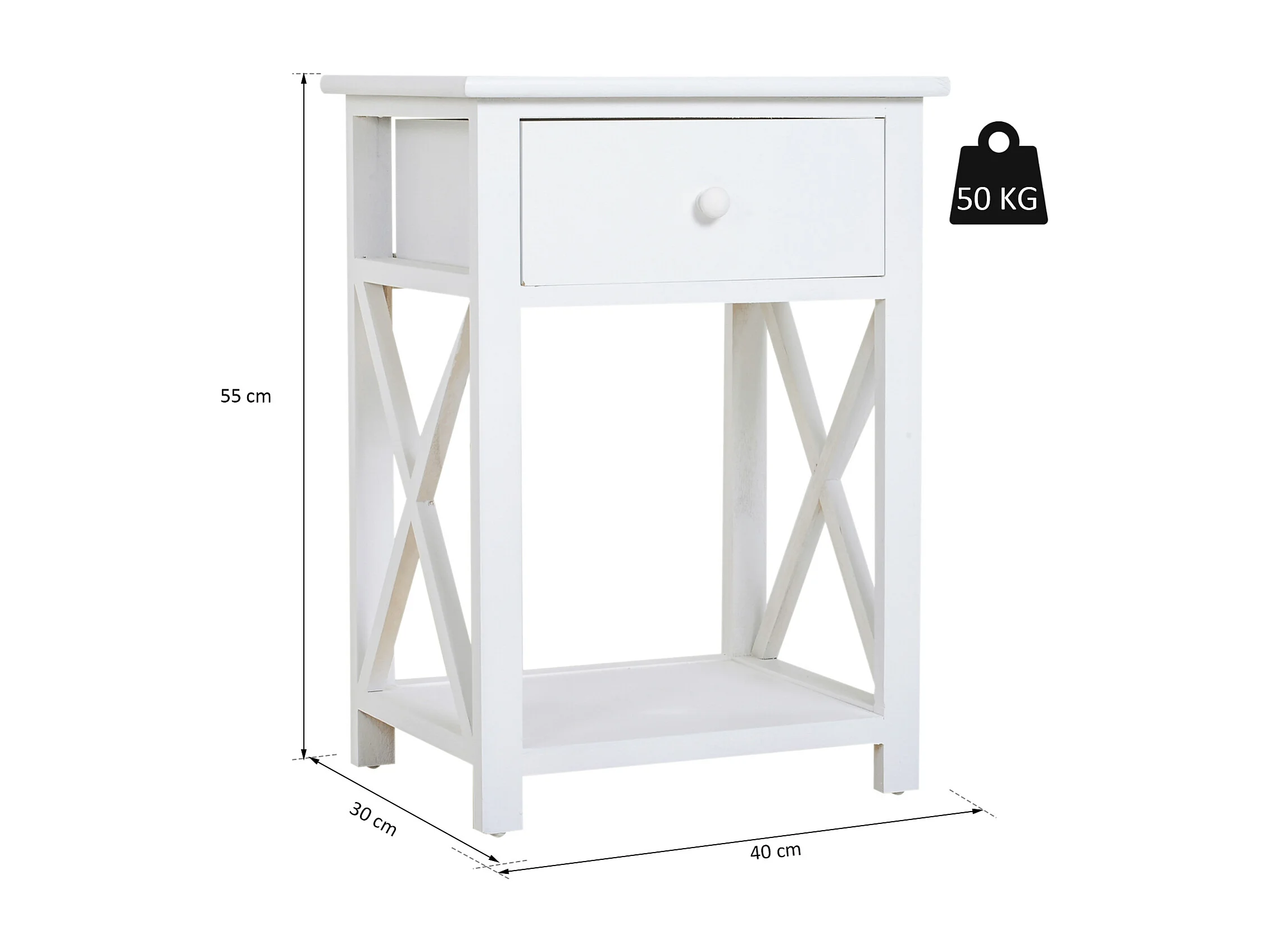 Table de chevet table de nuit style cosy avec croix latérales tiroir et étagère bois et MDF blanc