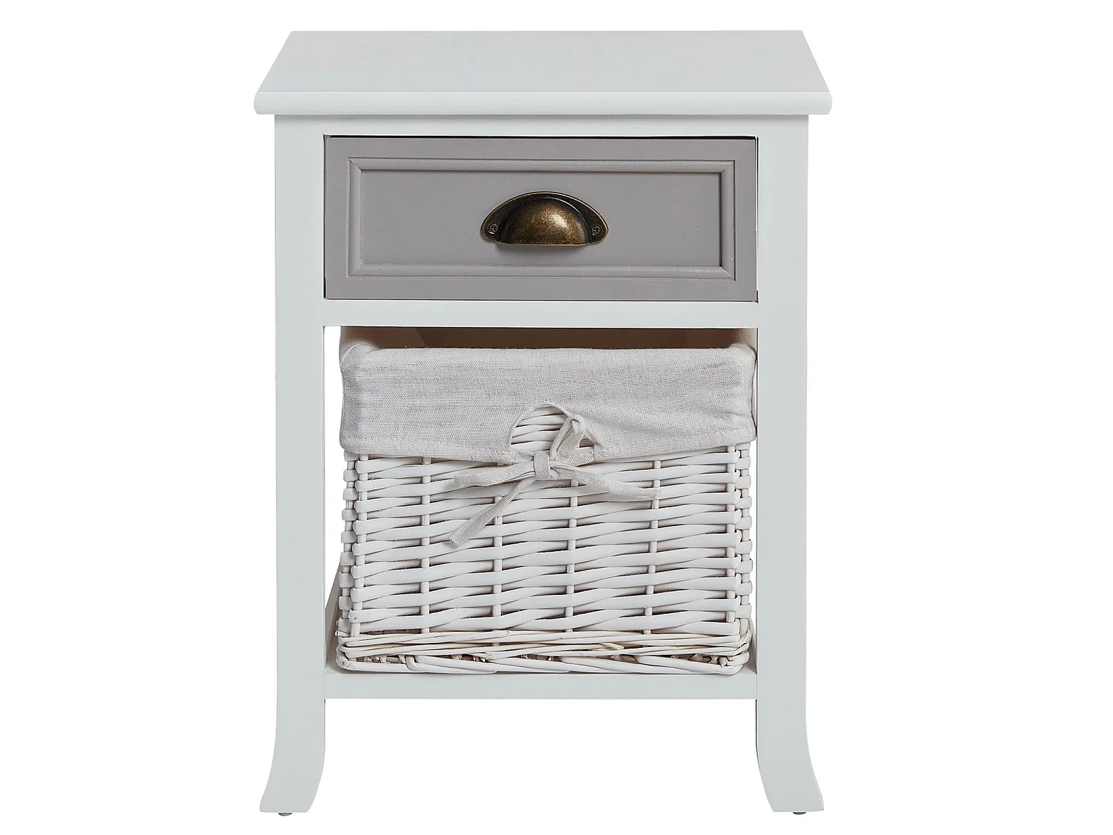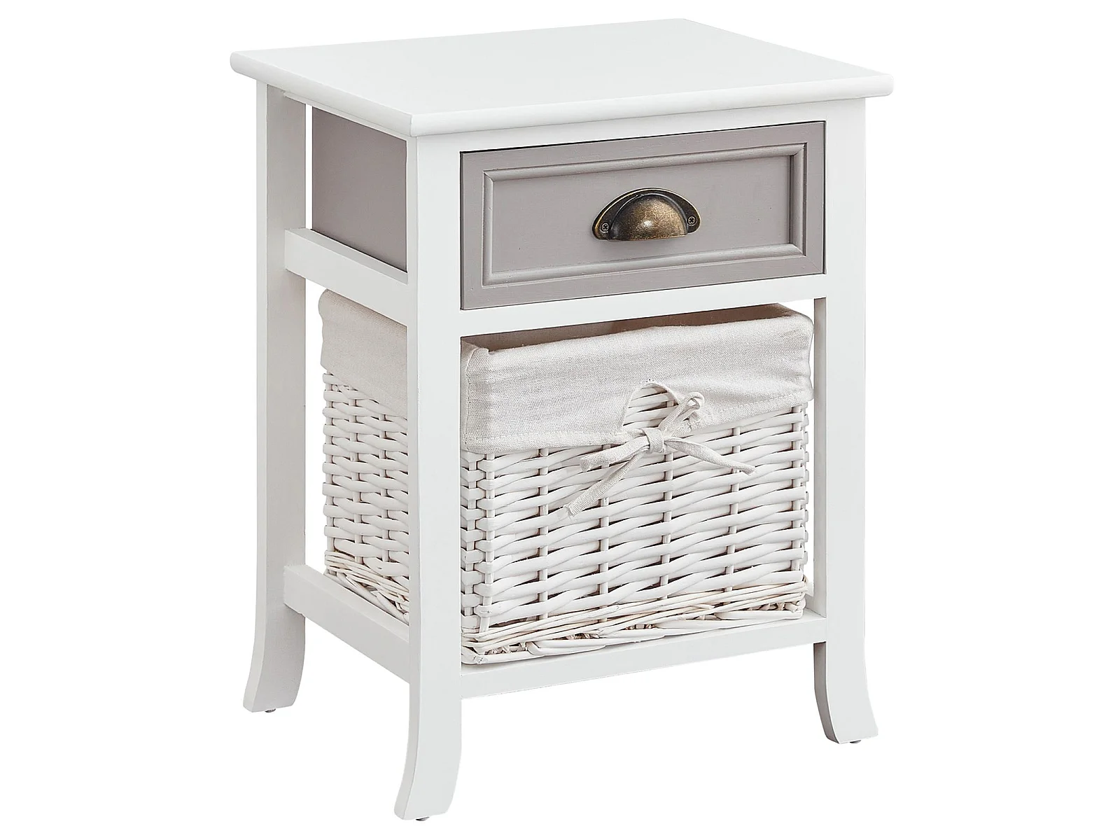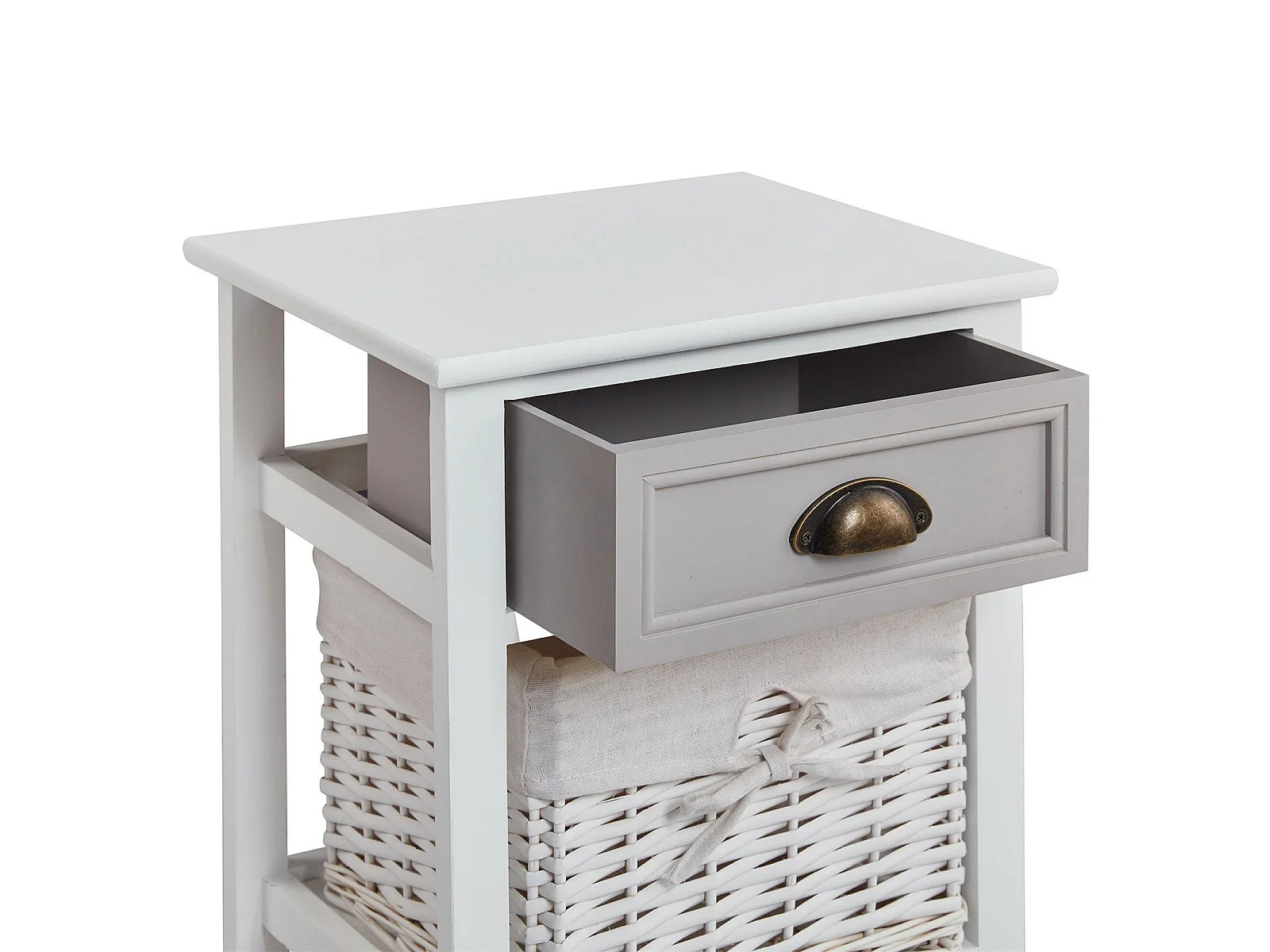 Table de chevet NUSCO table de nuit en bois lasuré blanc avec 1 tiroir et 3 paniers en fibre naturelle et insert en tissu blanc