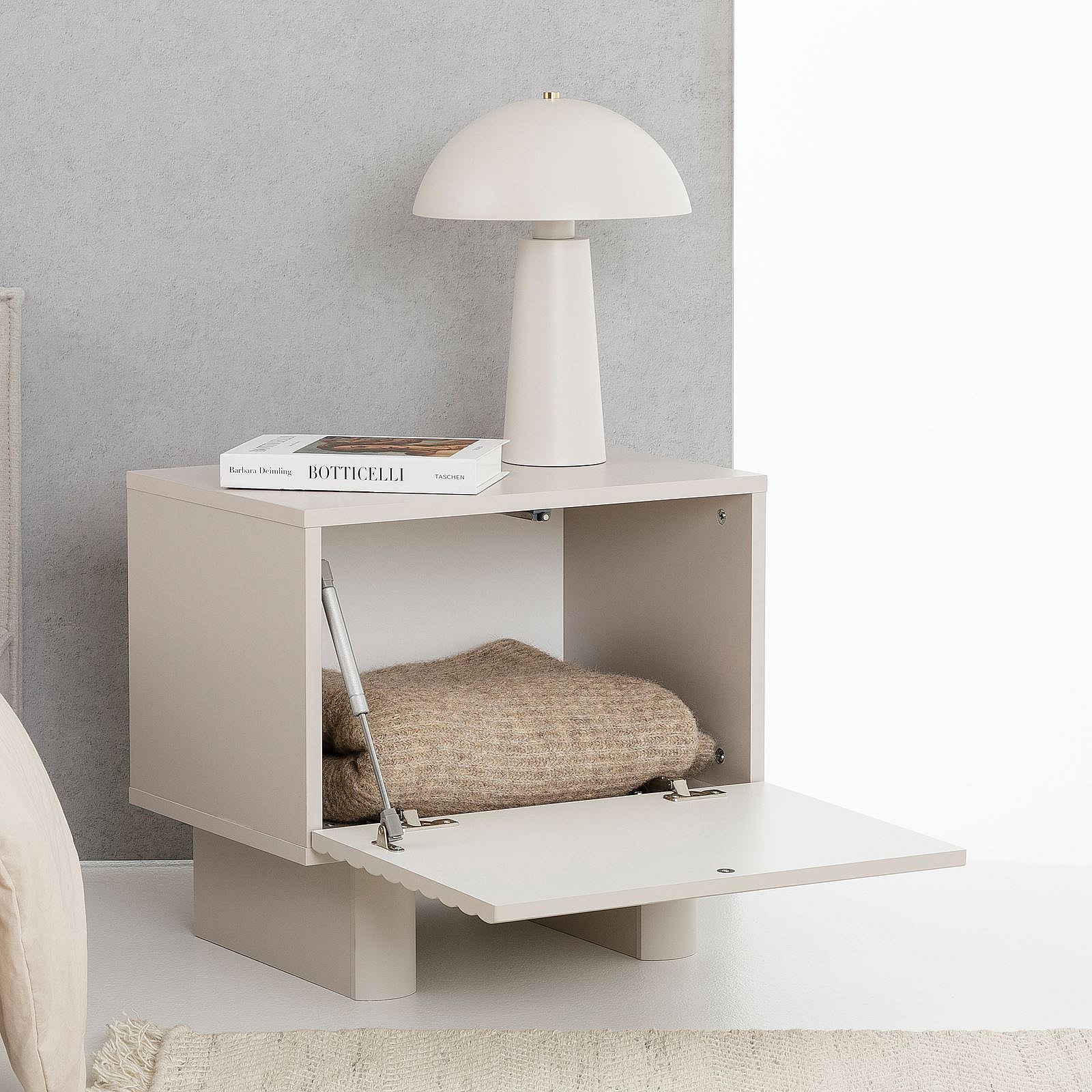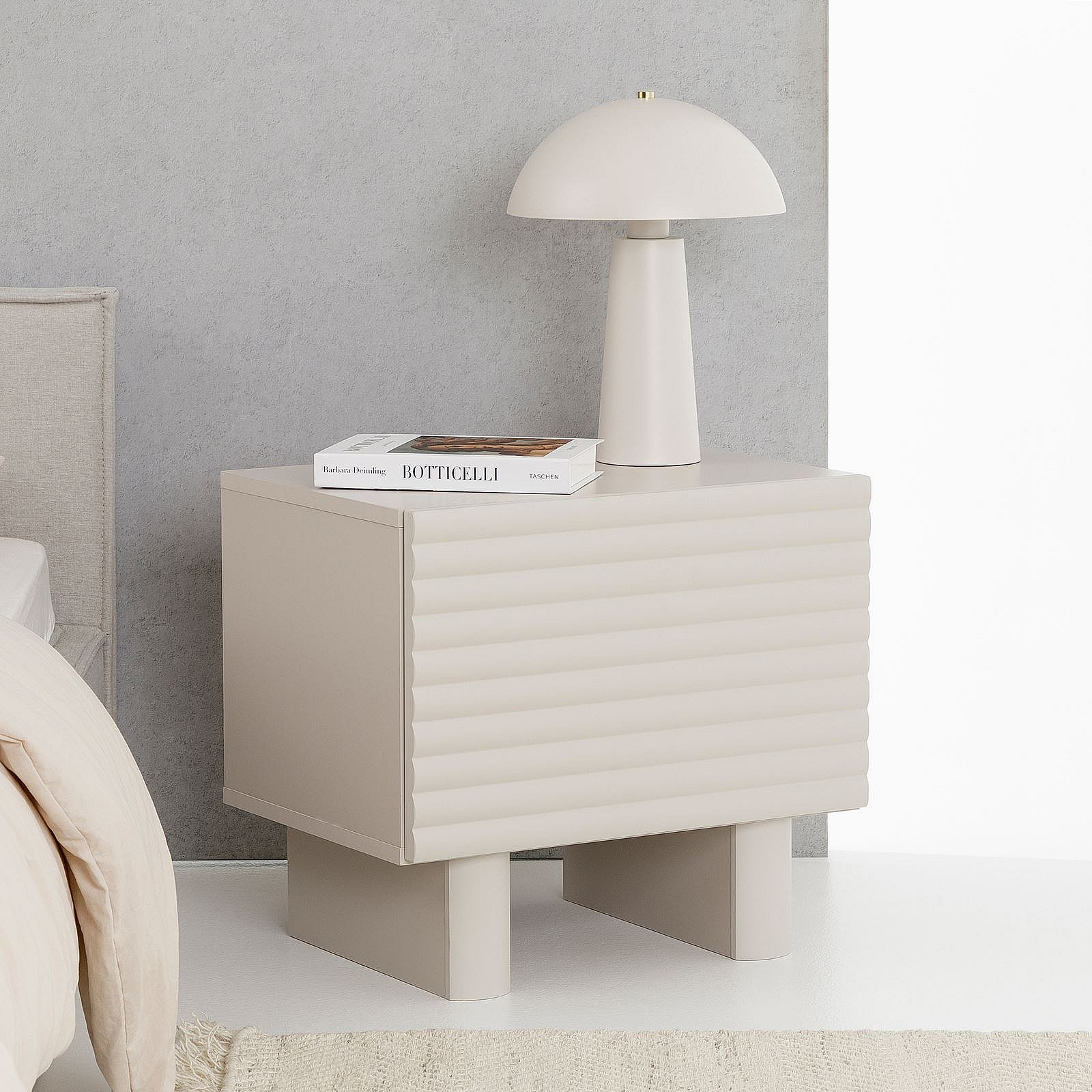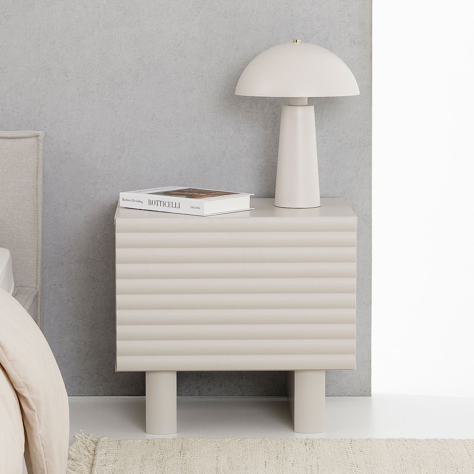 Table de chevet TURKU H 46 cm avec 1 Porte Style Cannelé, Couleur Blanc Cachemire, Design Moderne