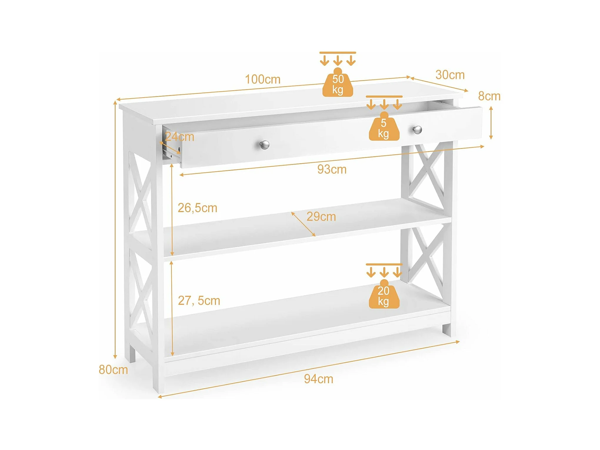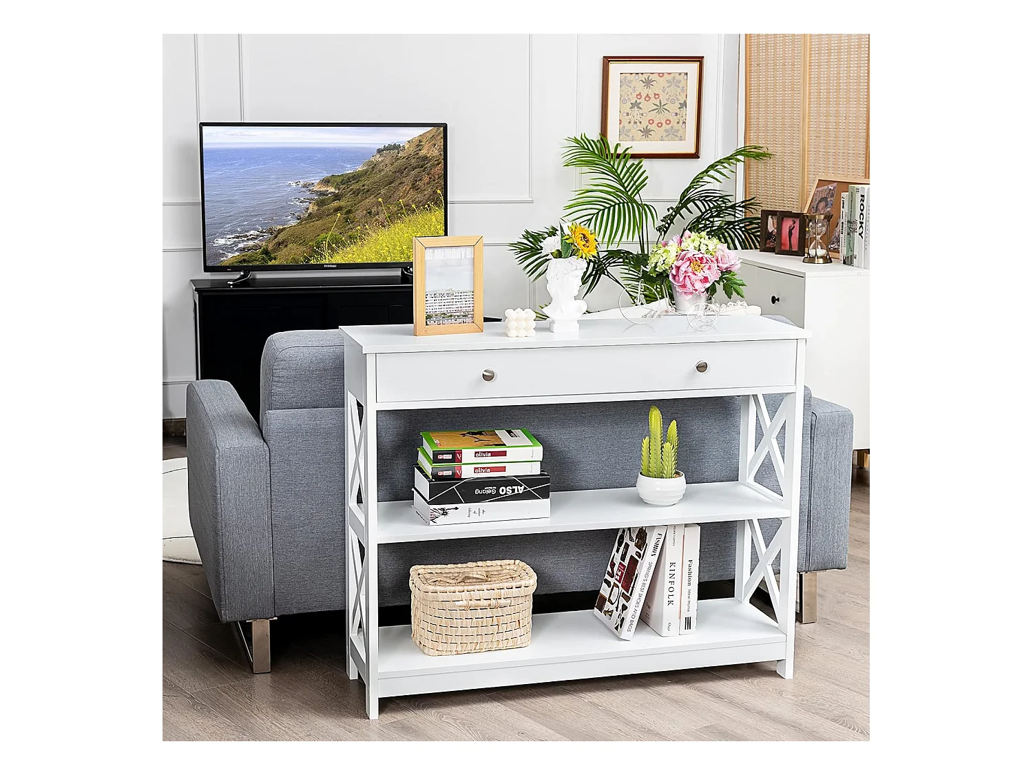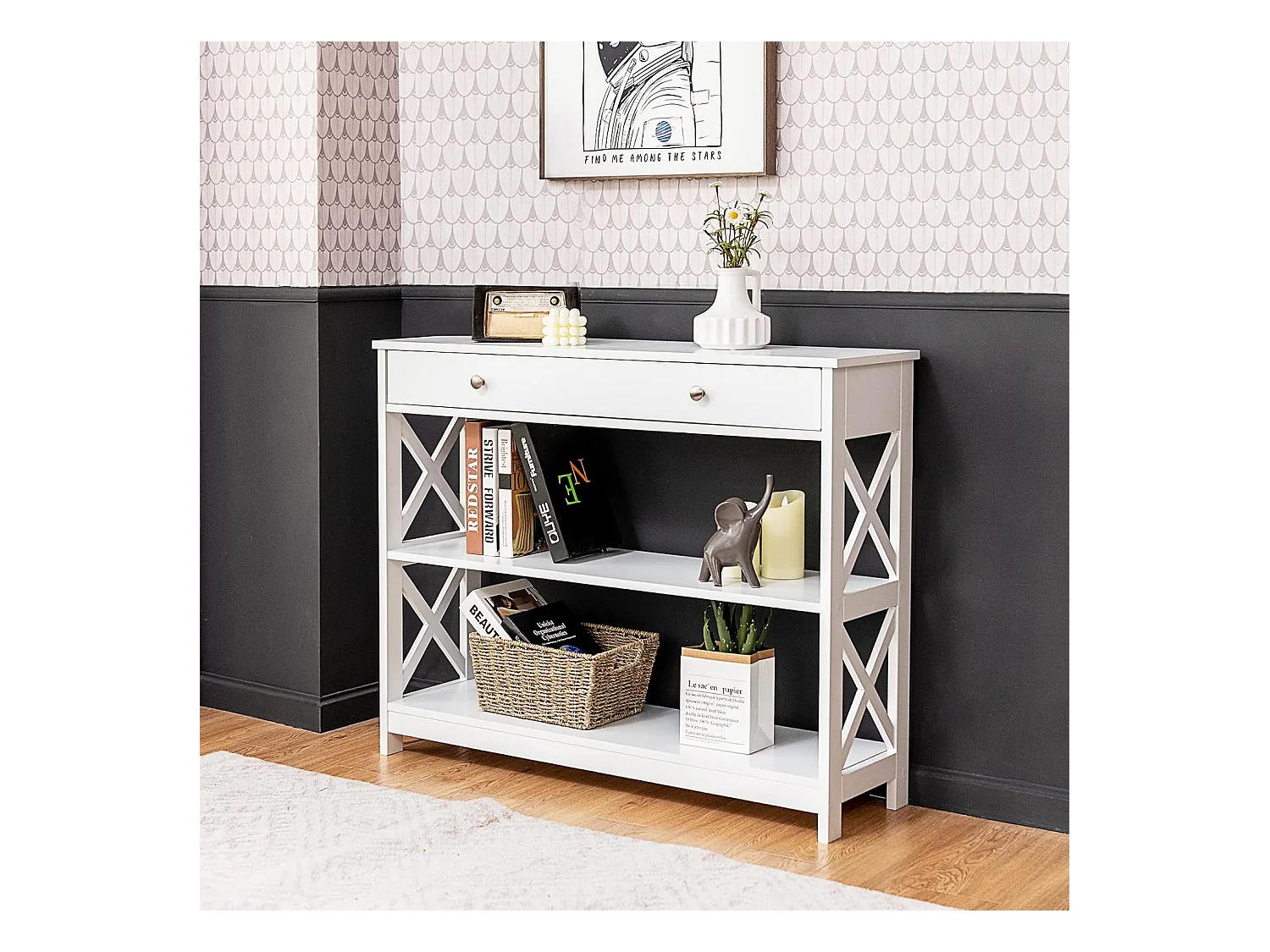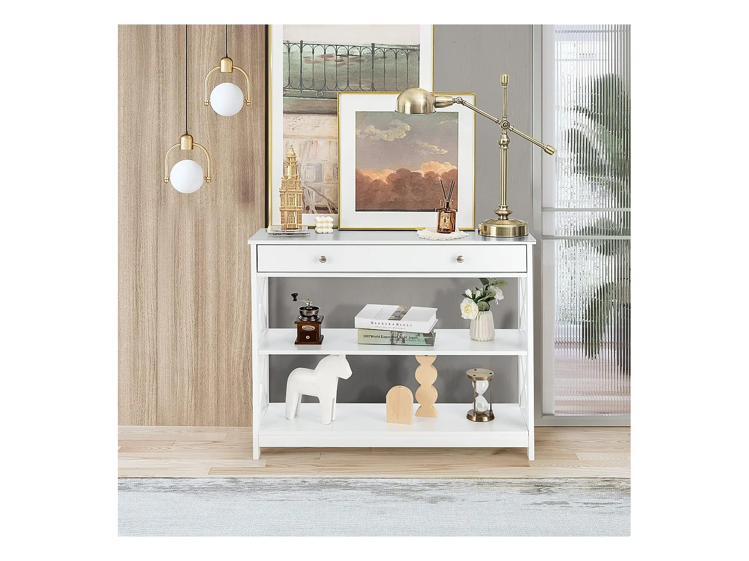 Table de Console à 3 Niveaux, Console Meuble avec Tiroir et 2 Étagères de Rangement de Motif en X, Console Entrée pour Couloir, Salon, Entrée, 100x30x80CM (Blanc)