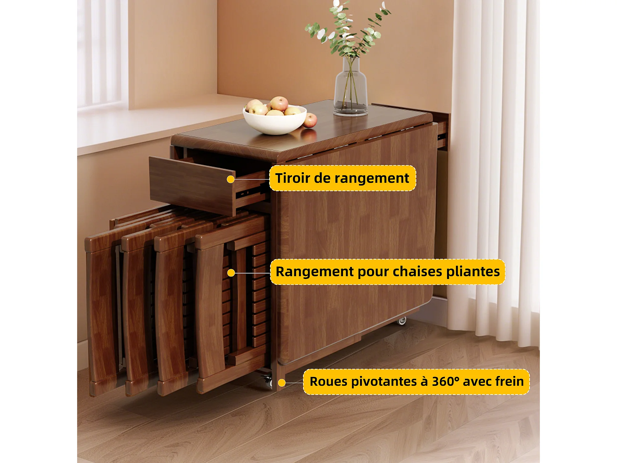 Table de cuisine 130 cm extensible en bois avec 4 chaises pliantes, avec espace de rangement et roulettes pivotantes à 360°, pour 2 à 6 personnes, noyer
