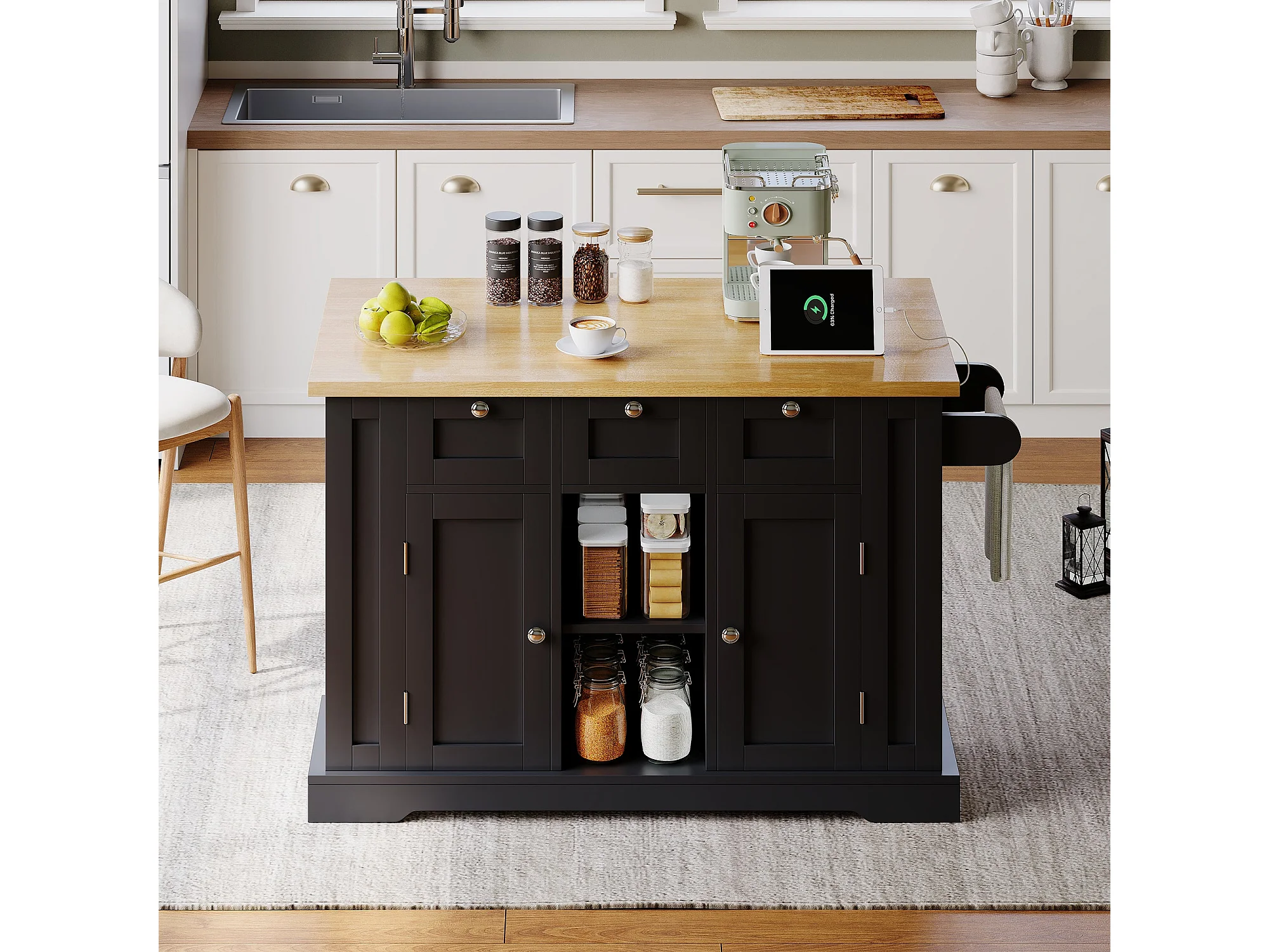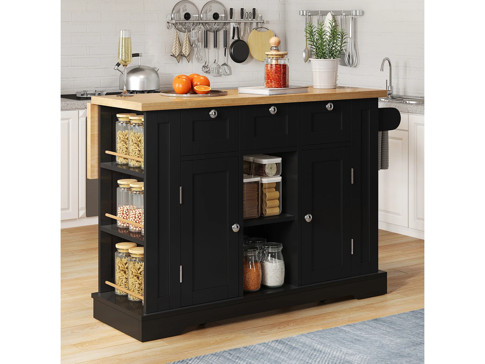 Table de cuisine mobile 132 cm, plan de travail rabattable, prise intégrée, cuisine salle à manger