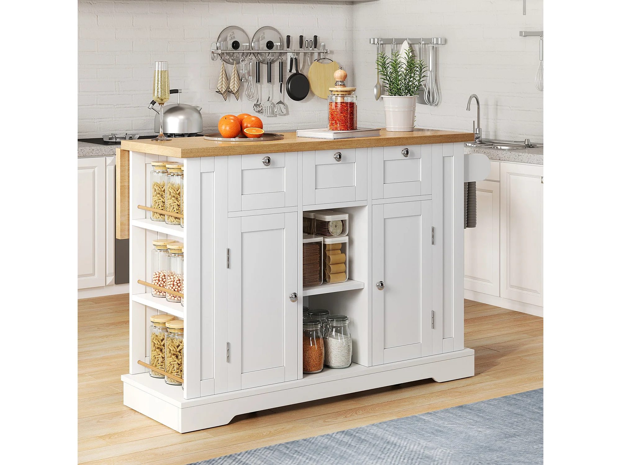 Table de cuisine mobile, style campagne, meuble multifonctionnel, tiroir, porte-épices, 5 roulettes, prise intégrée, cuisine / salle à manger / maison