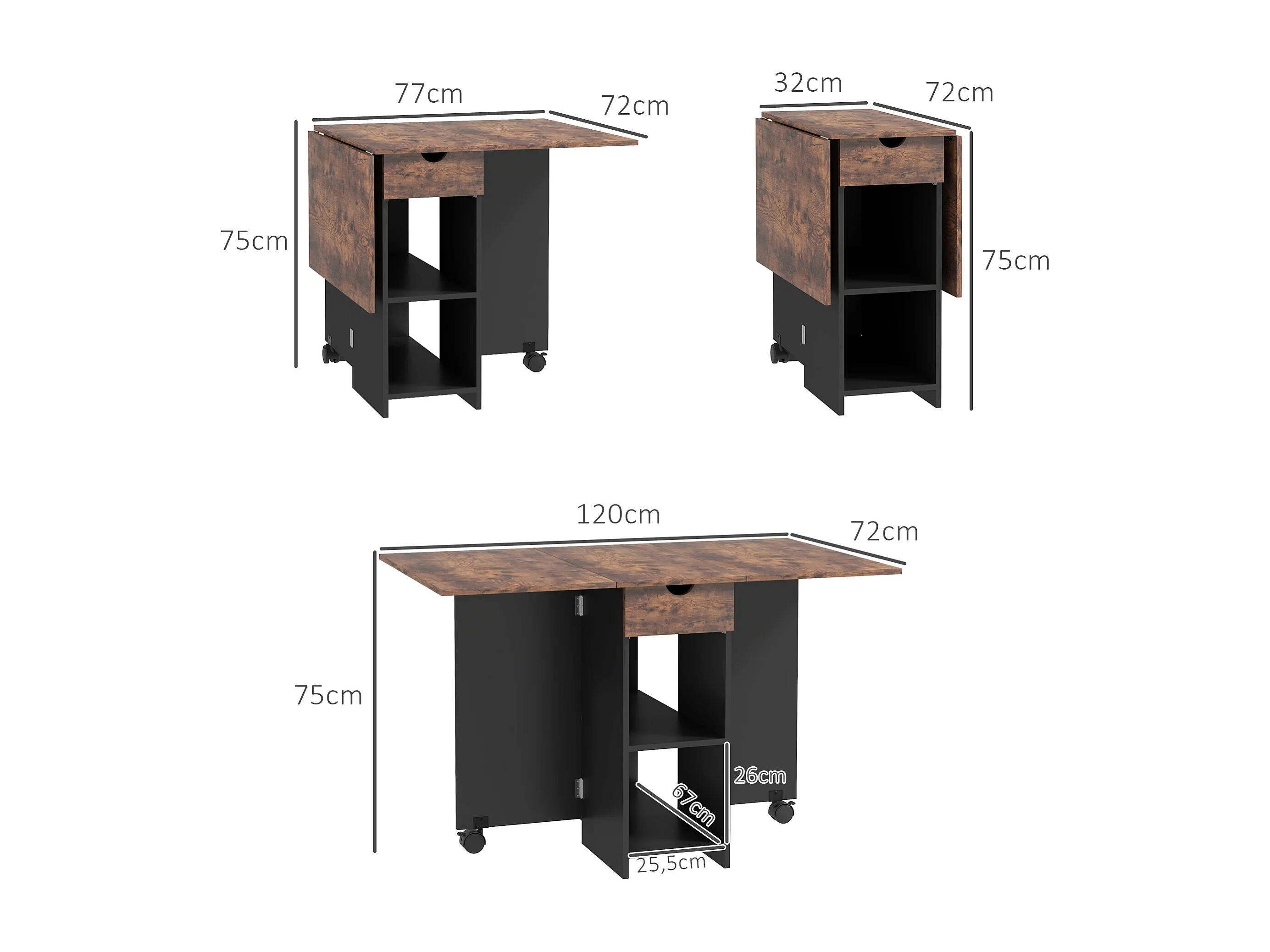 Table de cuisine rabattable - table à manger pliable 2-4 personnes - étagères, tiroir - noir effet bois