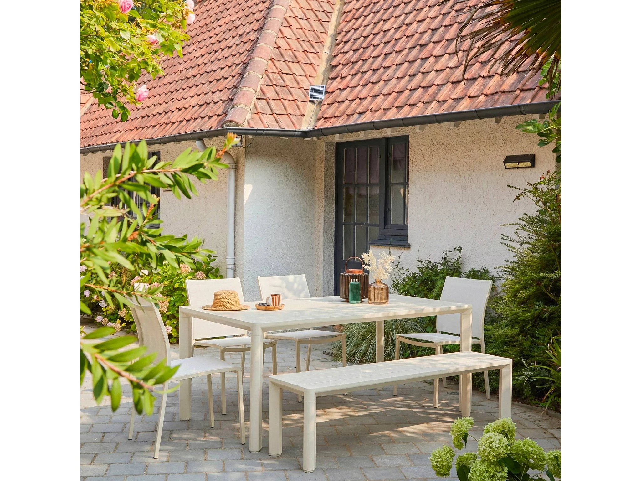 Table de jardin aluminium + 4 assises + 1 banc aluminium et textilène beige. 220 x 100 x 75 cm