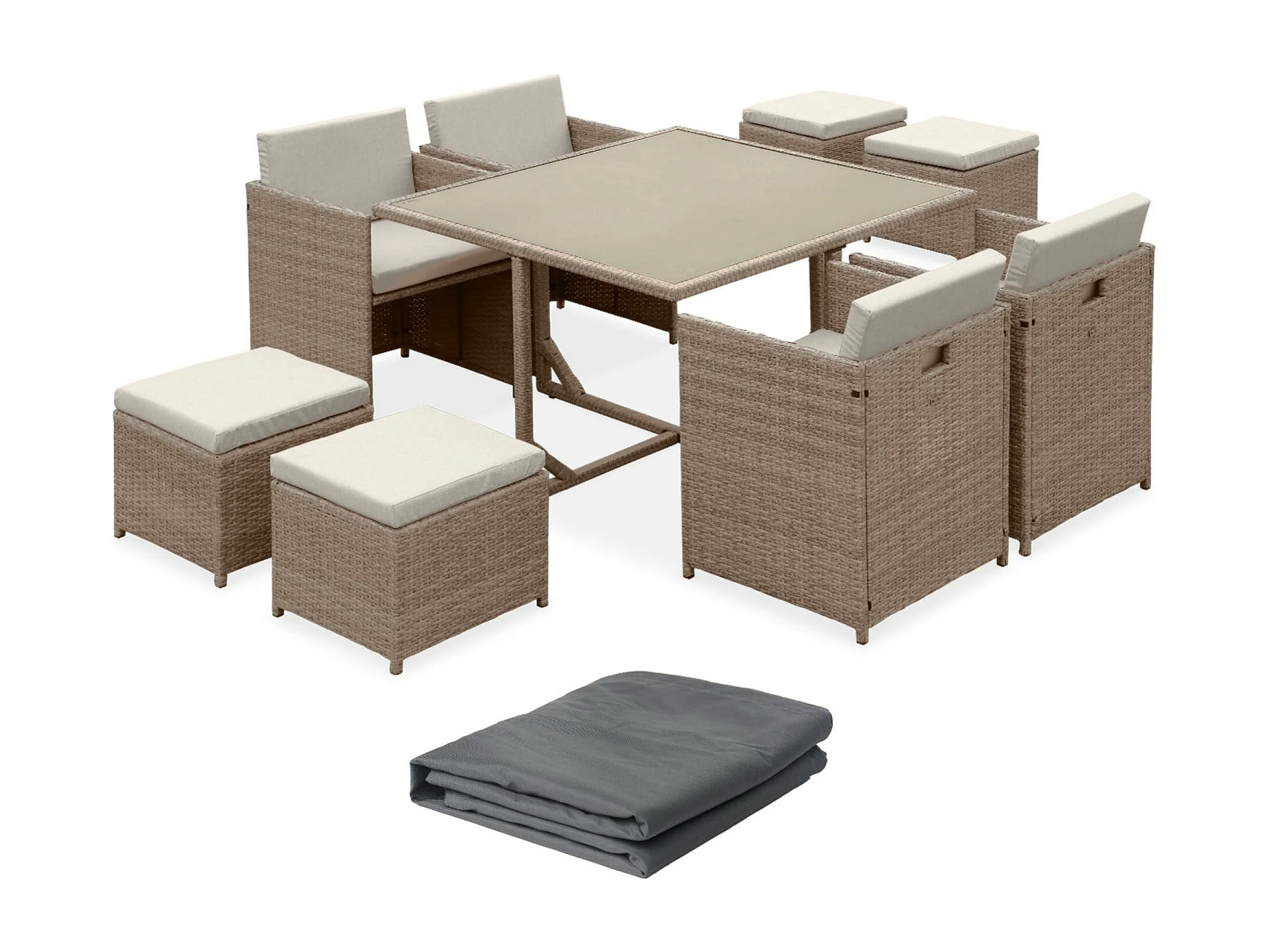 Table de jardin encastrable résine tressée + 8 assises + Housse de protection coussins beige. table encastrable