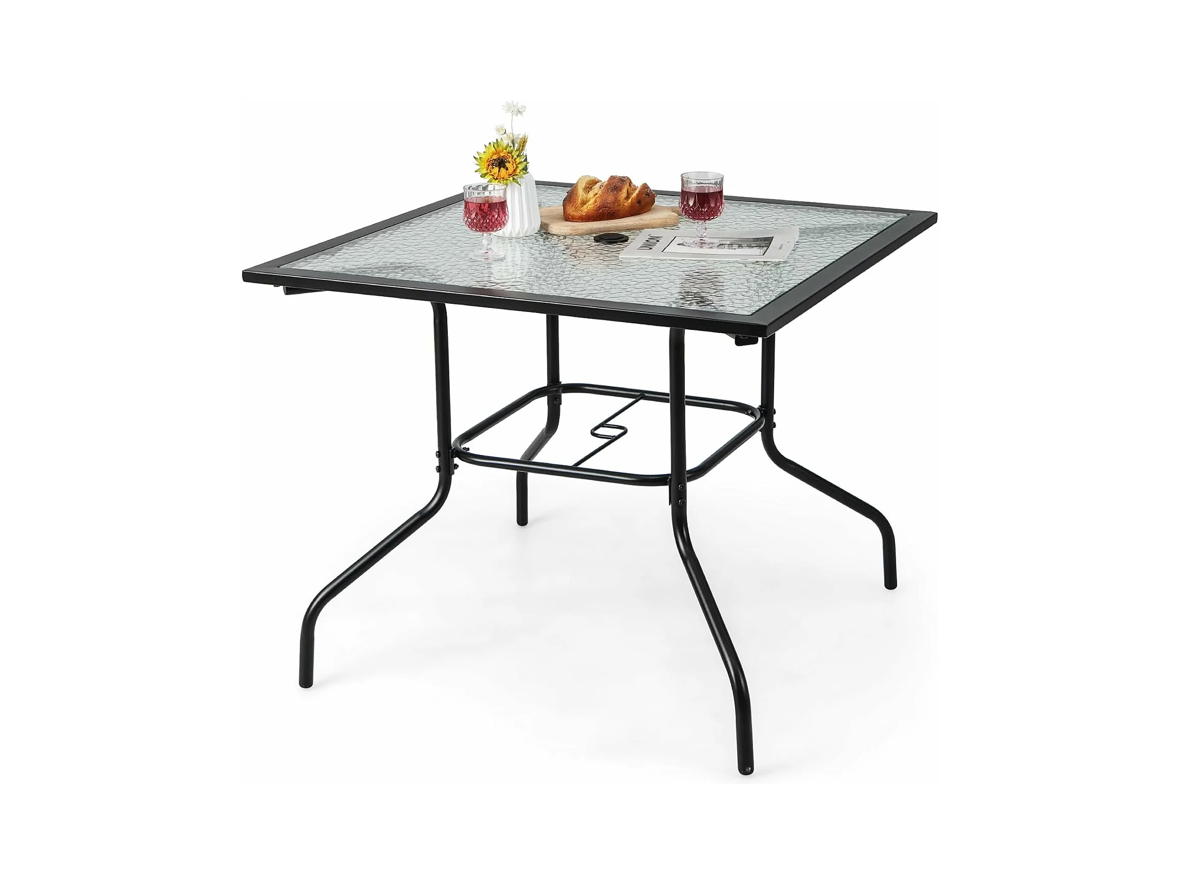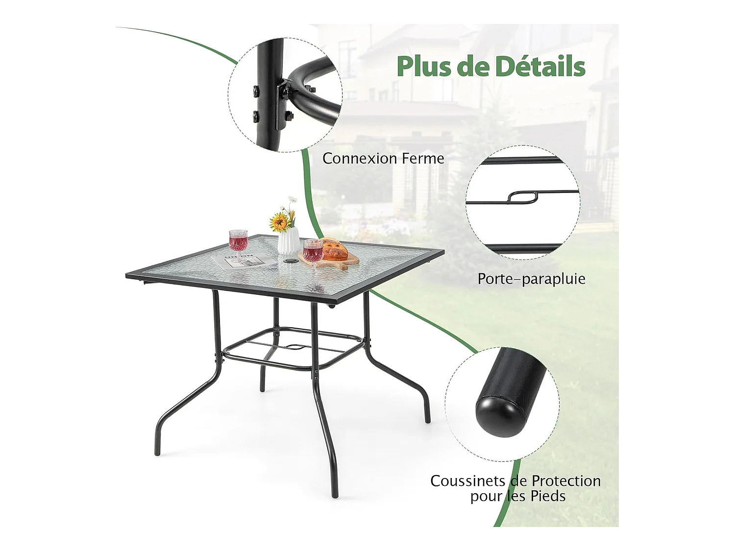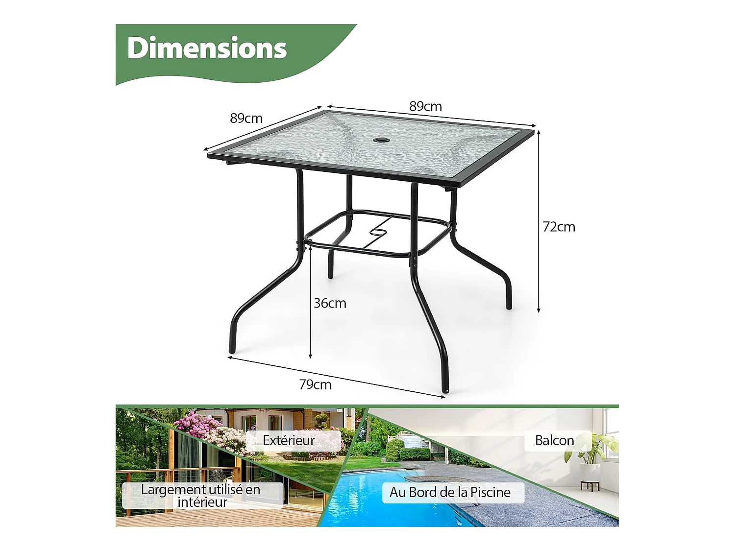 Table de Jardin en Verre Trempé 89 x 89 CM, Table d'Appoint avec Trou pour Parasol 38 MM, Cadre en Métal Robuste, Table Basse Carrée Extérieure pour Patio, Piscine