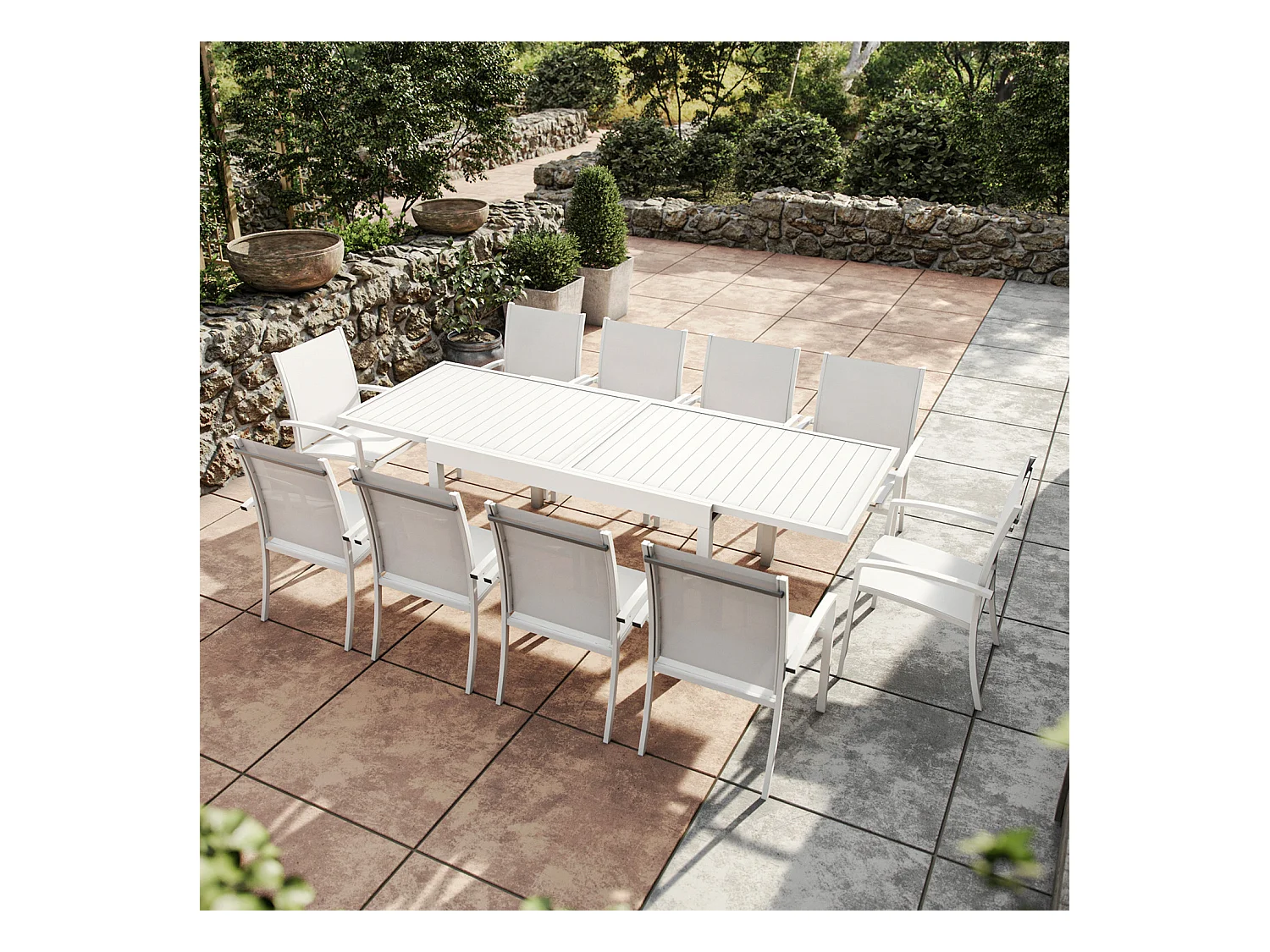 Table de jardin extensible aluminium 270cm + 10 fauteuils empilables textilène - blanc - ANDRA