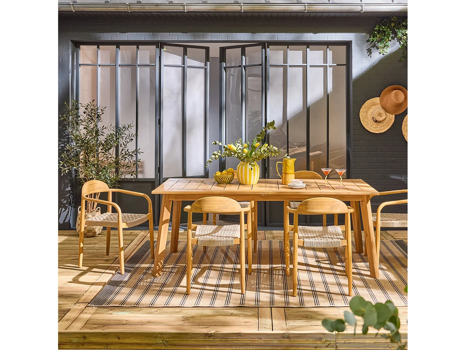 Table de jardin extensible bois d'acacia + 6 assises en résine couleur naturel Palena + Cerina