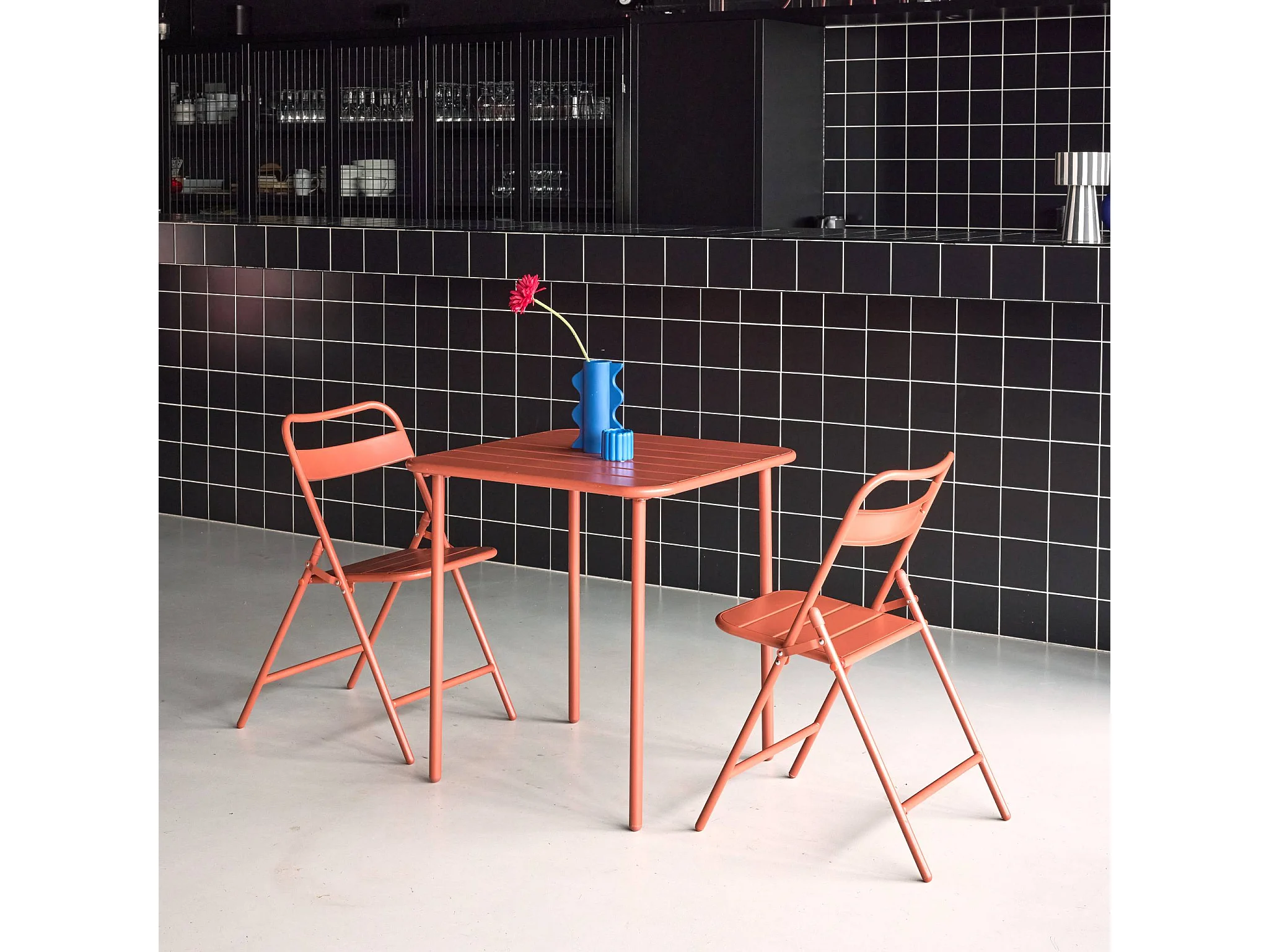 Table de jardin bistrot pliante métal + 2 assises terracotta 70 x 70cm. acier thermolaqué