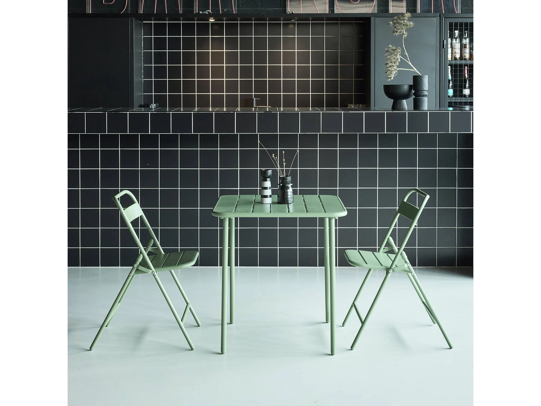 Ensemble table de jardin carrée et 2 chaises bistrot vert sauge - Palavas