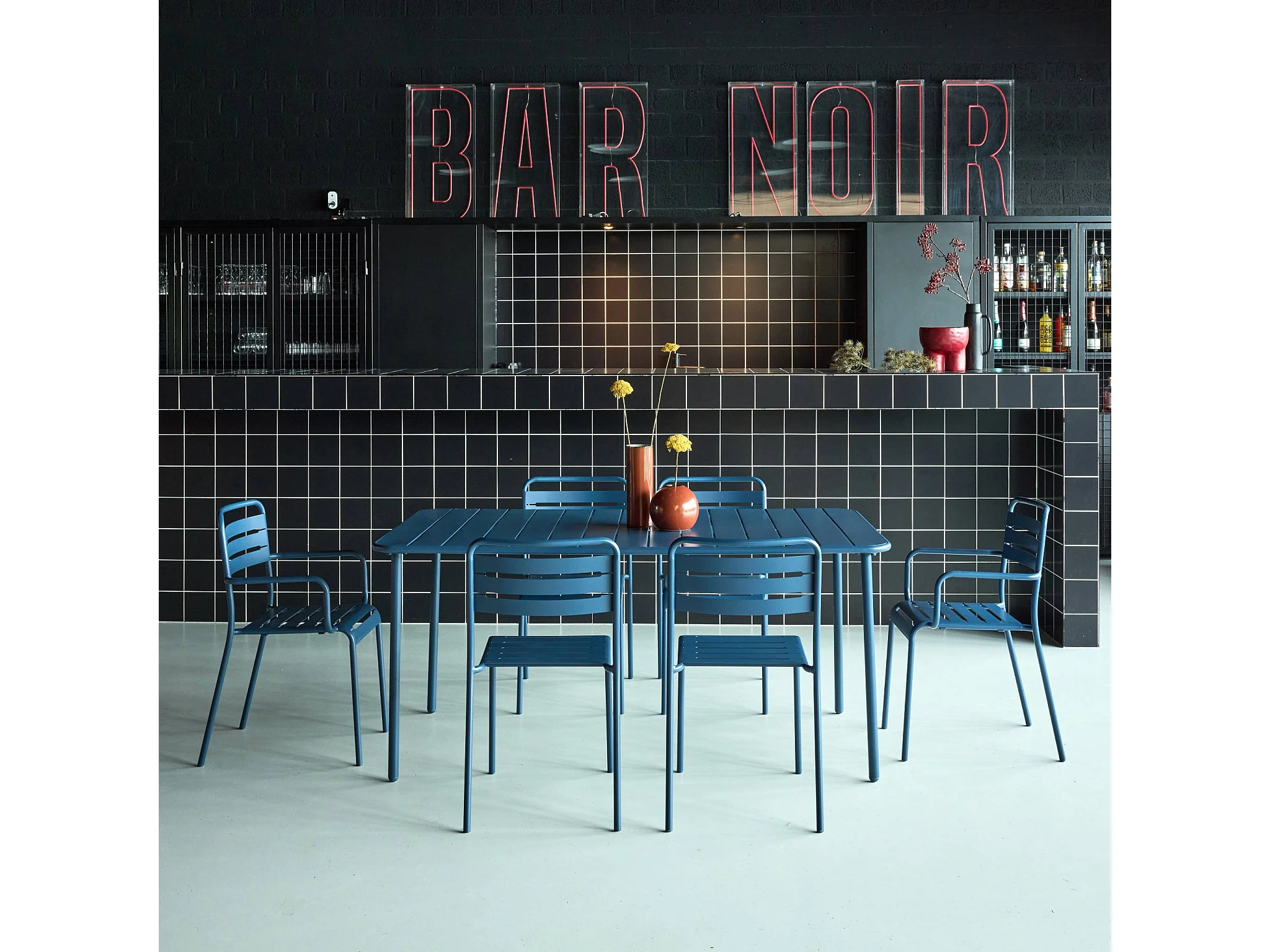 Table de jardin métal + 6 assises bleu marine. acier traitement anti rouille