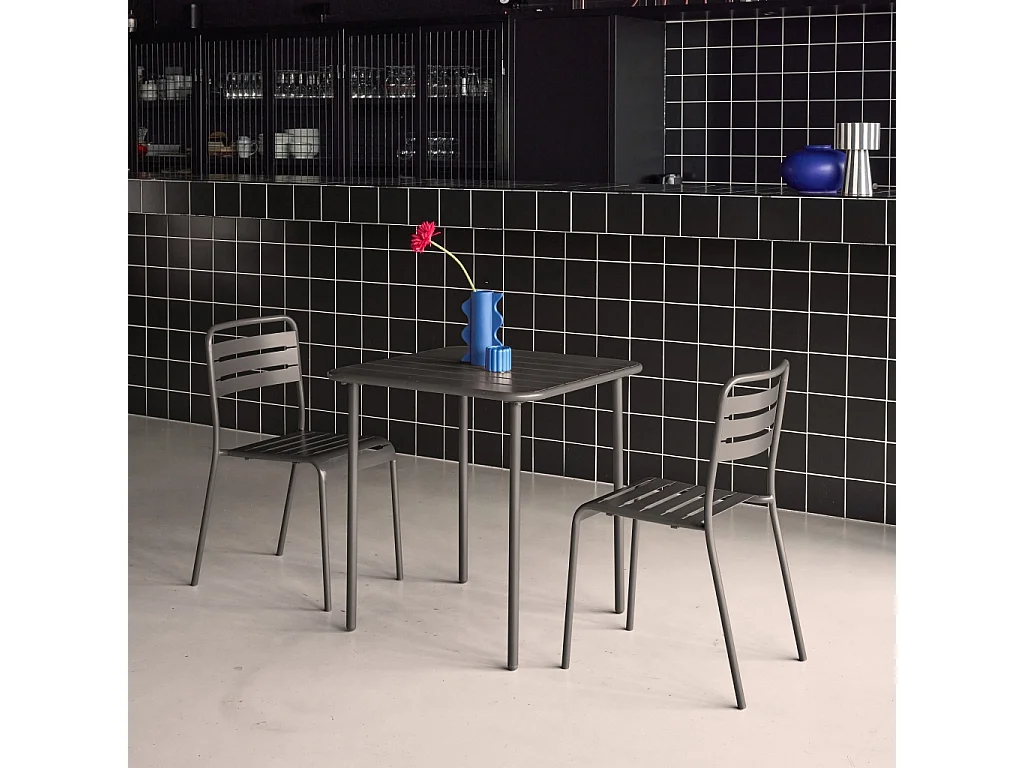 Table de jardin métal + 2 assises anthracite Amélia. lattes et bords arrondis. traitement antirouille