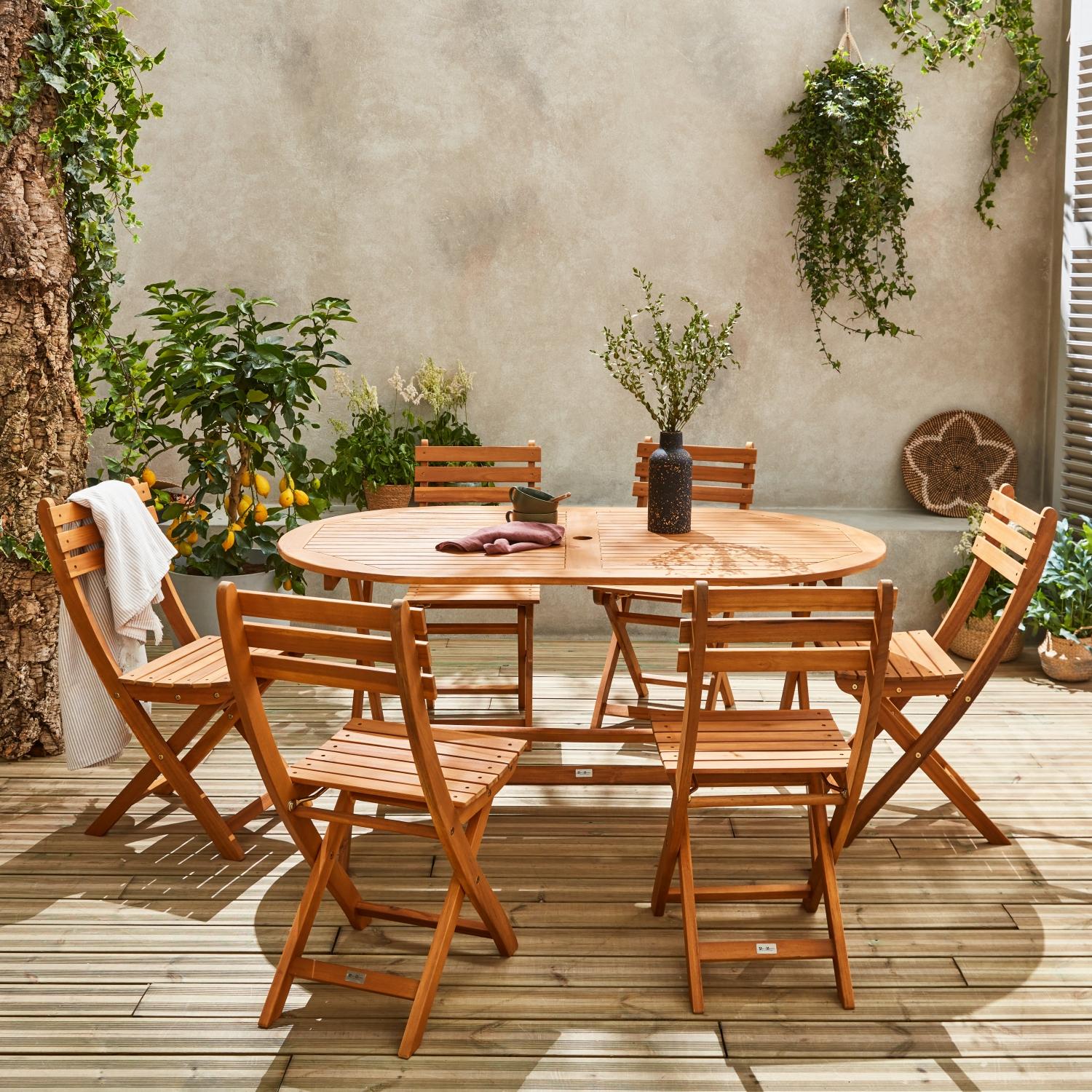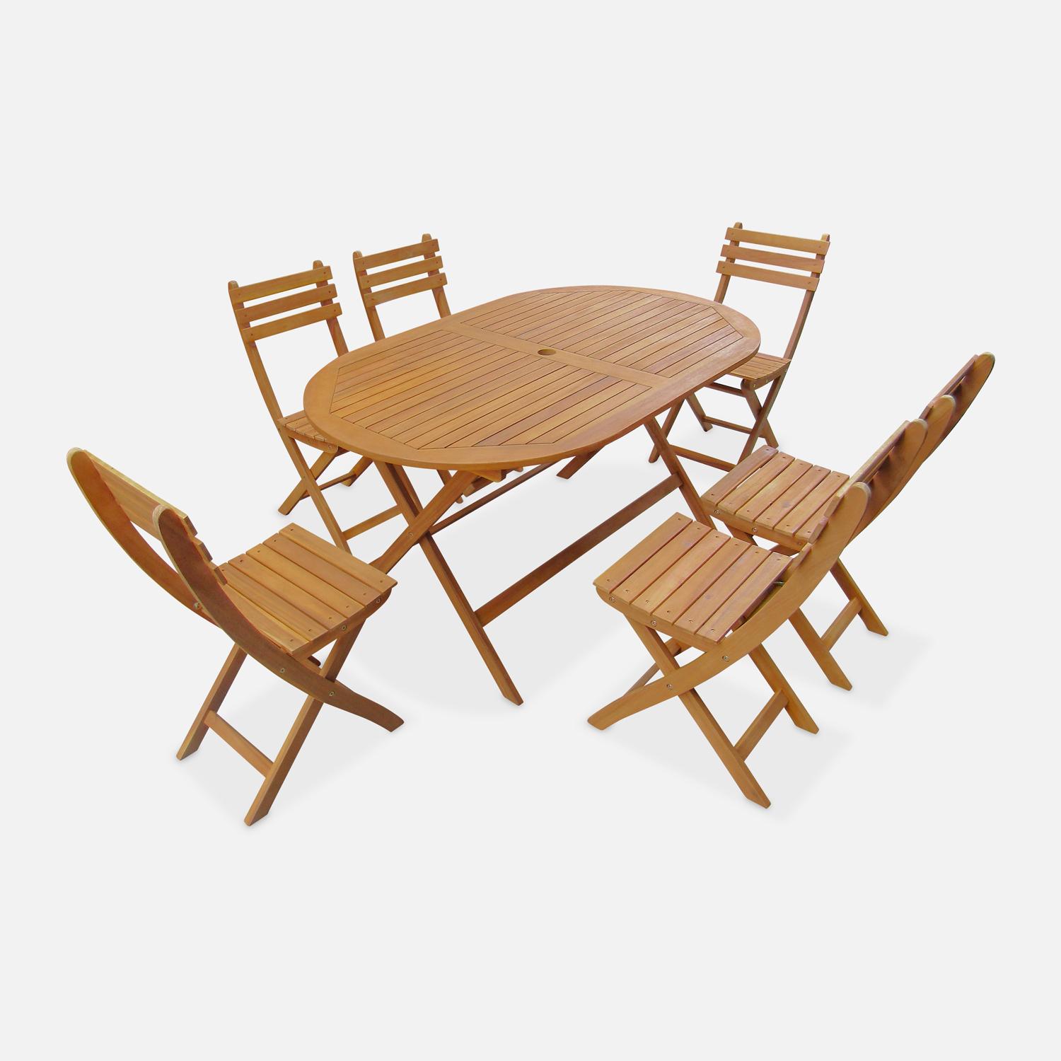 Table de jardin pliante bois d'acacia + 6 assises 150cm en bois d'acacia déjà huilé. forme ovale avec 6 chaises pliables