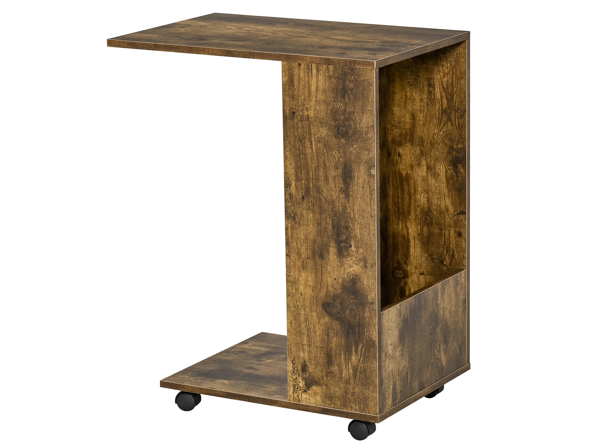 Table de lit/fauteuil - table d'appoint roulante avec étagère basse et compartiment rangement - panneaux particules aspect vieux bois