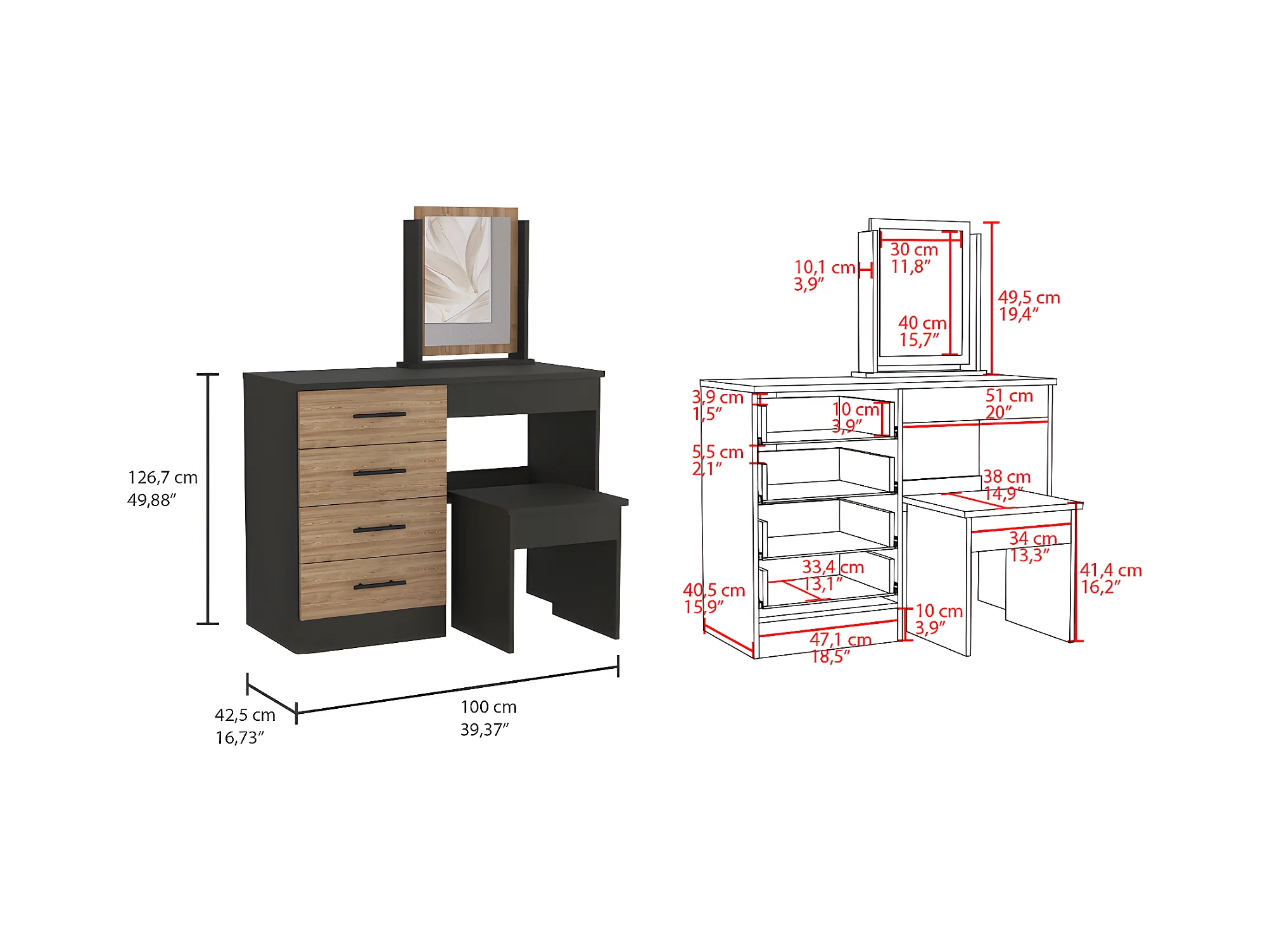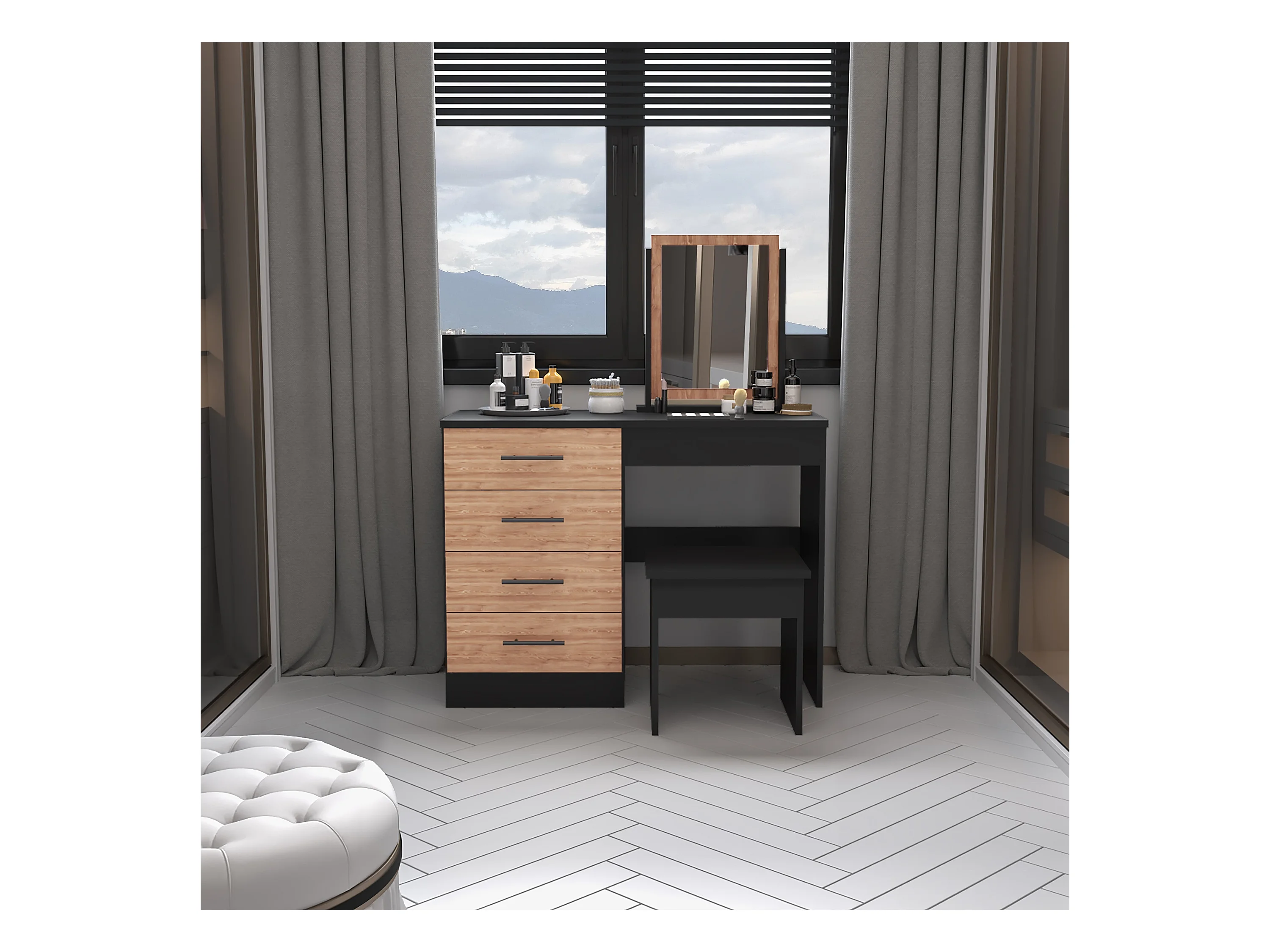 Table de maquillage de miroir Kaia avec 4 tiroirs et siège inclus 126,7 cm à x 100 cm L x 42,5 cm P, Marron Chocolat / gris