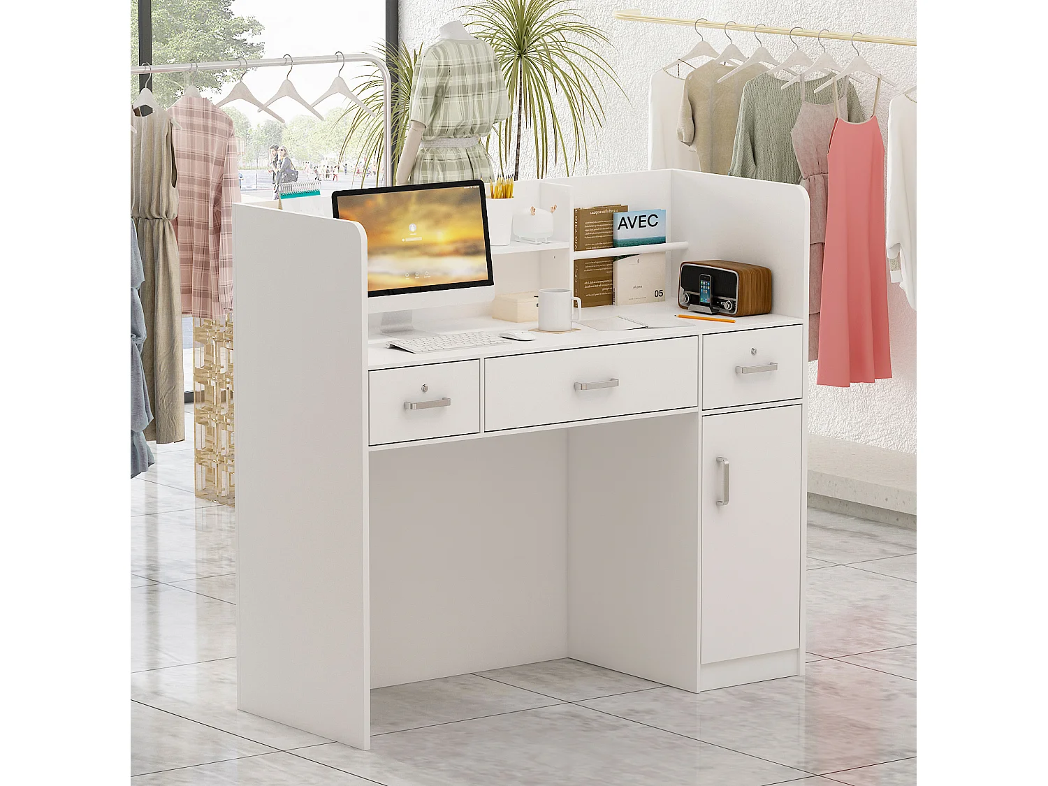 Bureau d’Accueil avec Tiroirs Verrouillables et Porte , Comptoir de Réception avec Poignée Argentée, Bureau, 120x47.8x110, Blanc