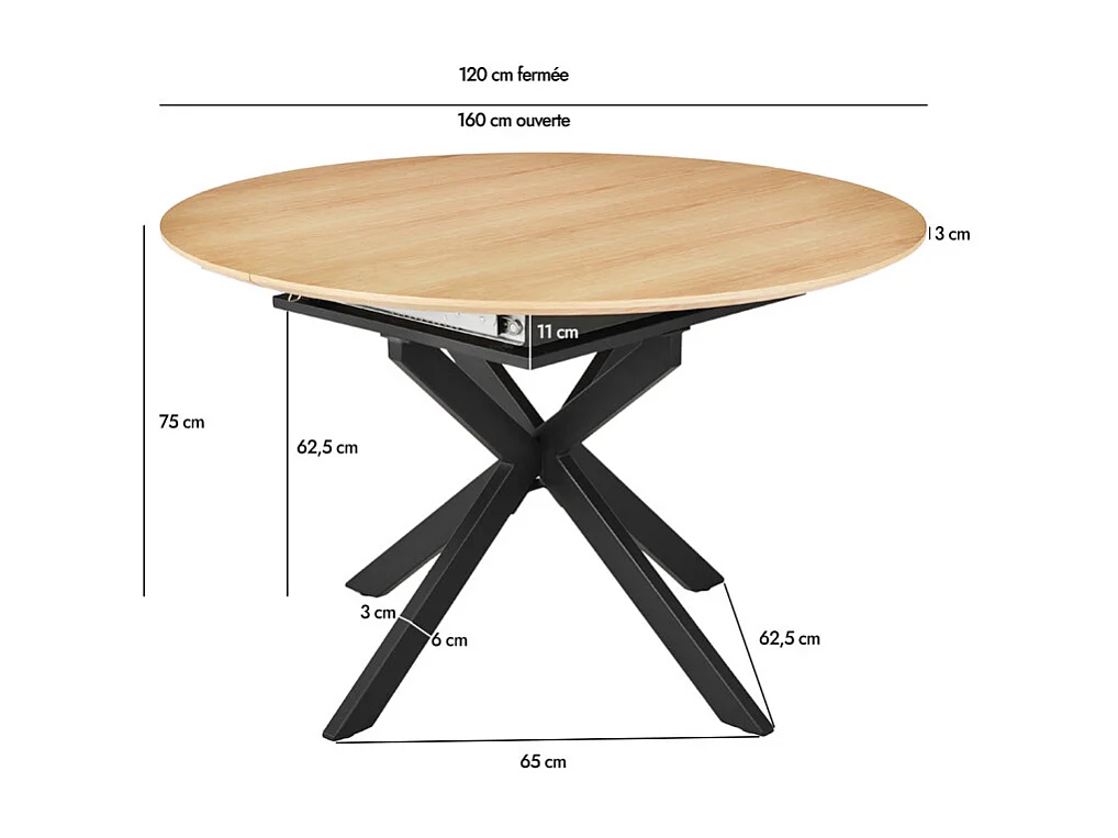 Table repas extensible 120/160 cm placage bois pieds métal – LORETTA