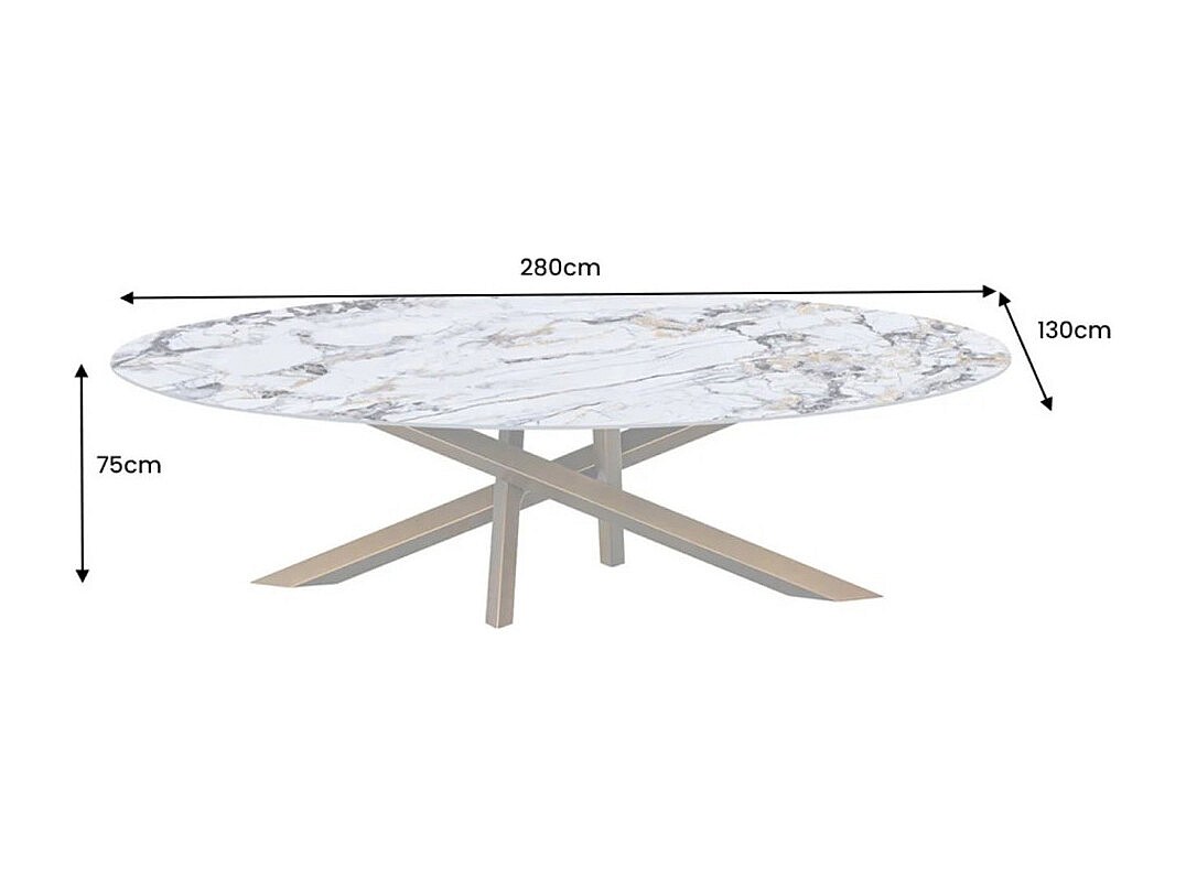 Table de salle à manger AERIS – Ovale 280 cm – Plateau céramique effet marbre blanc et bronze – Pieds métal – Style chic