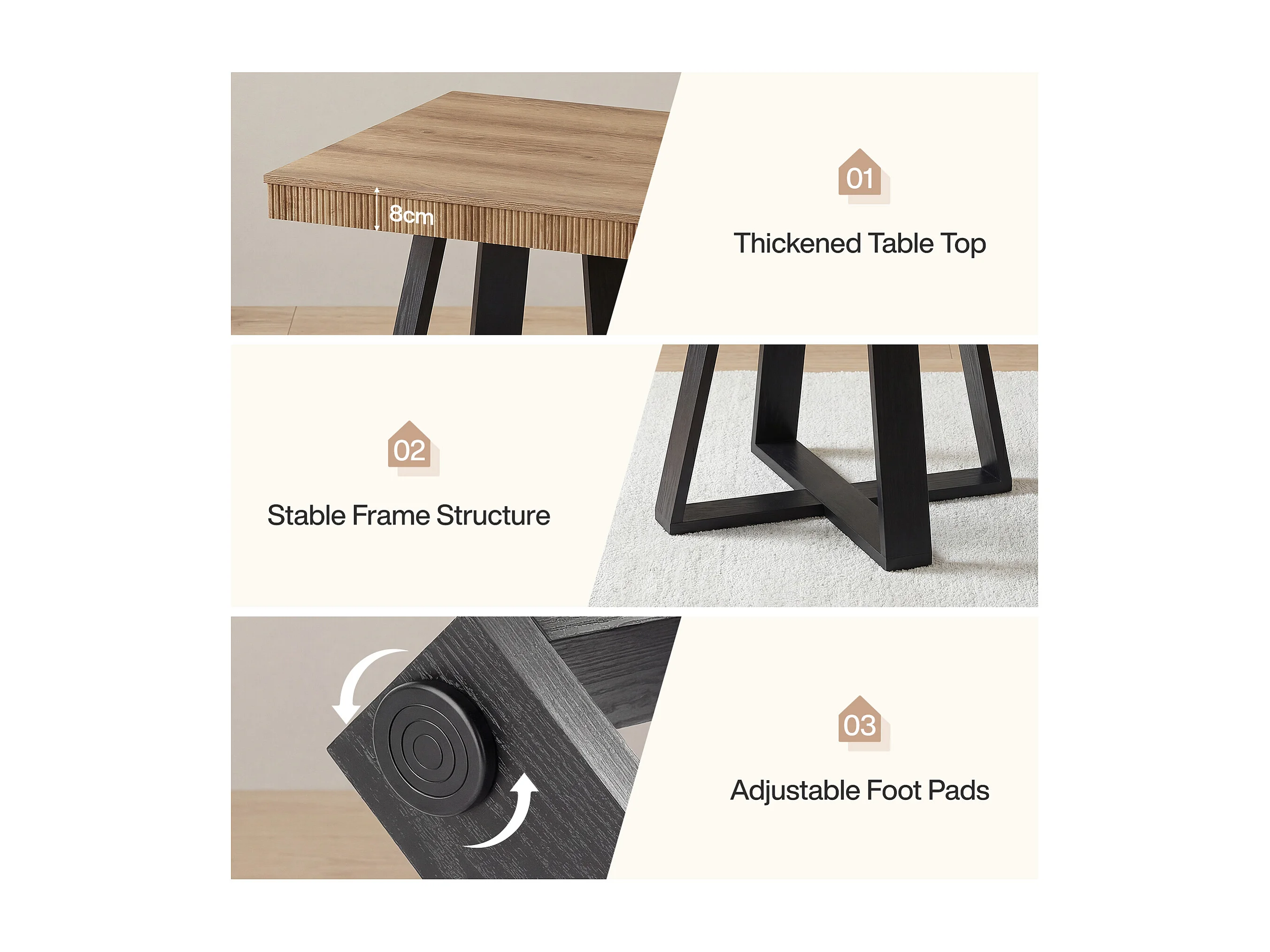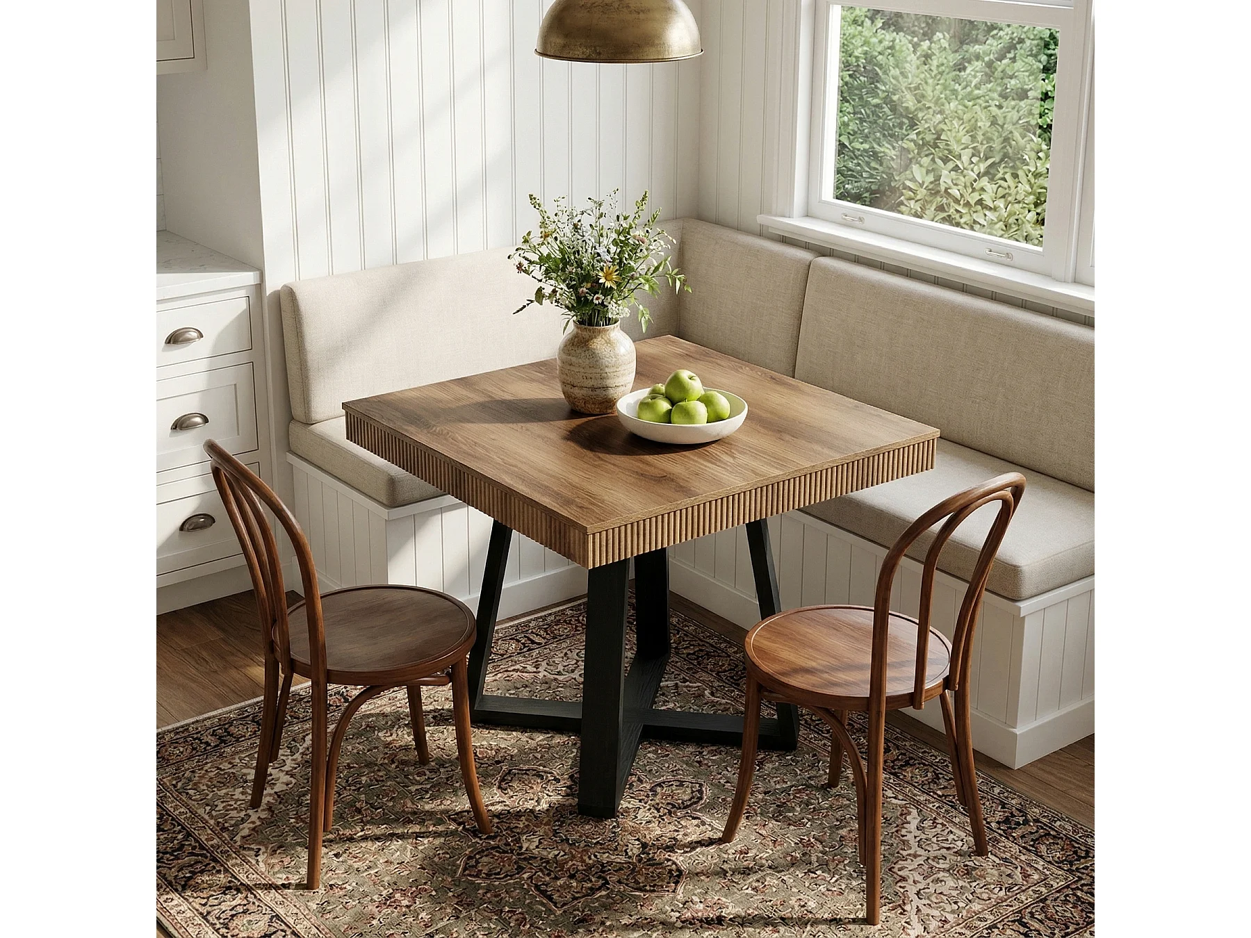 Table de salle à manger carrée de 80 cm pour 4 personnes, table de cuisine rustique en bois avec bord cannelé et piètement en X robuste
